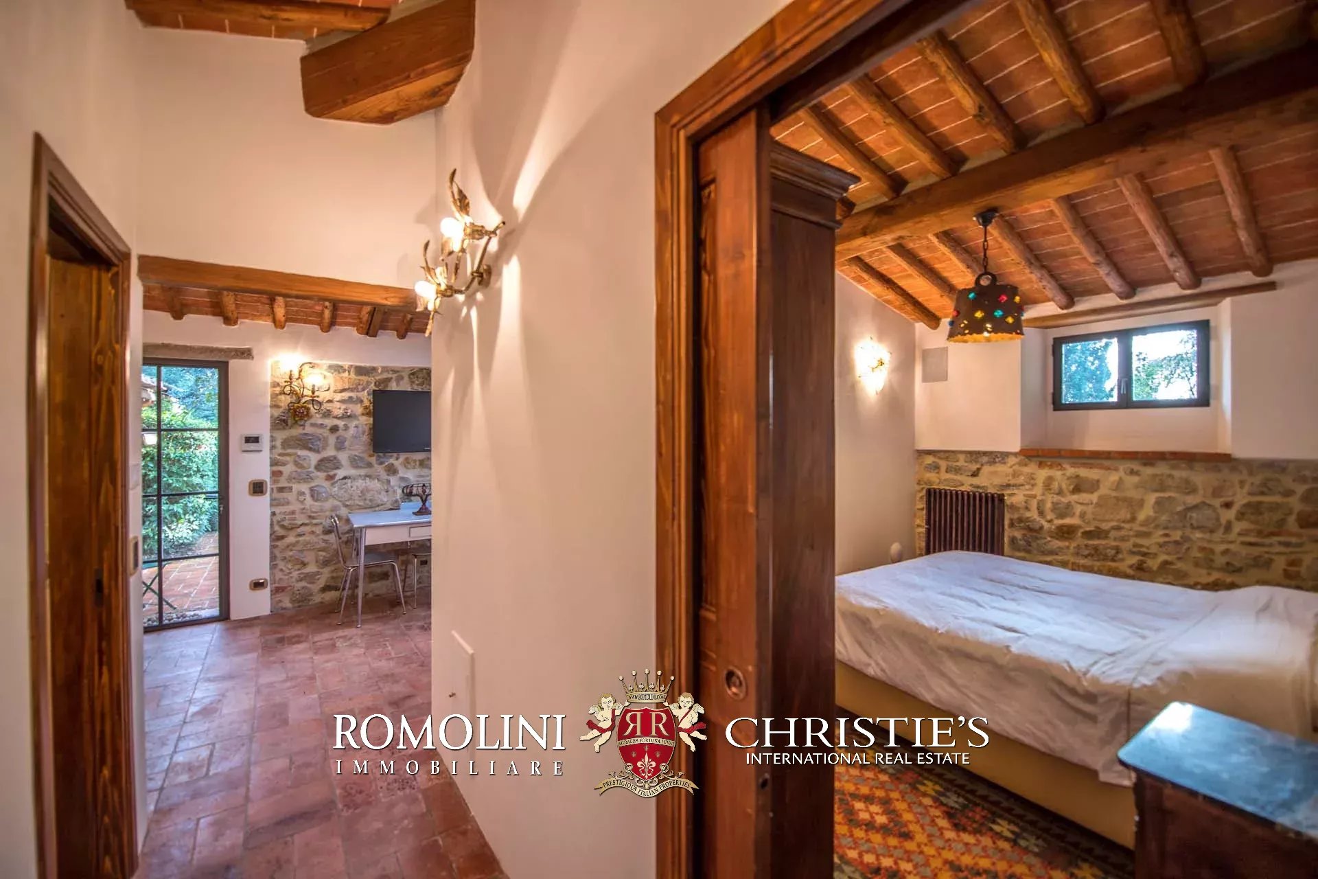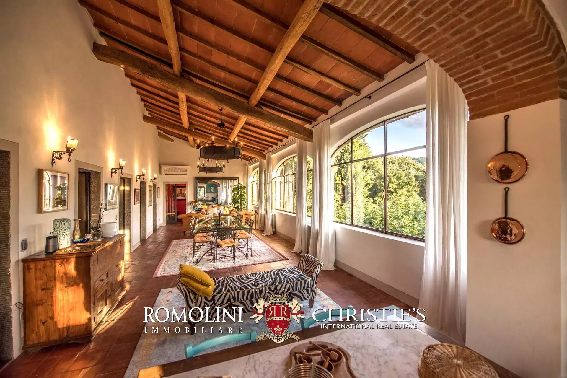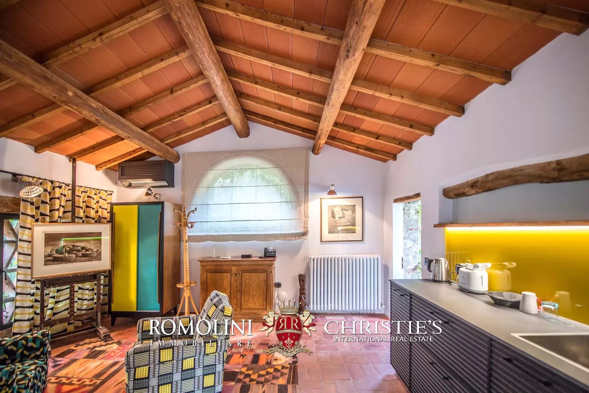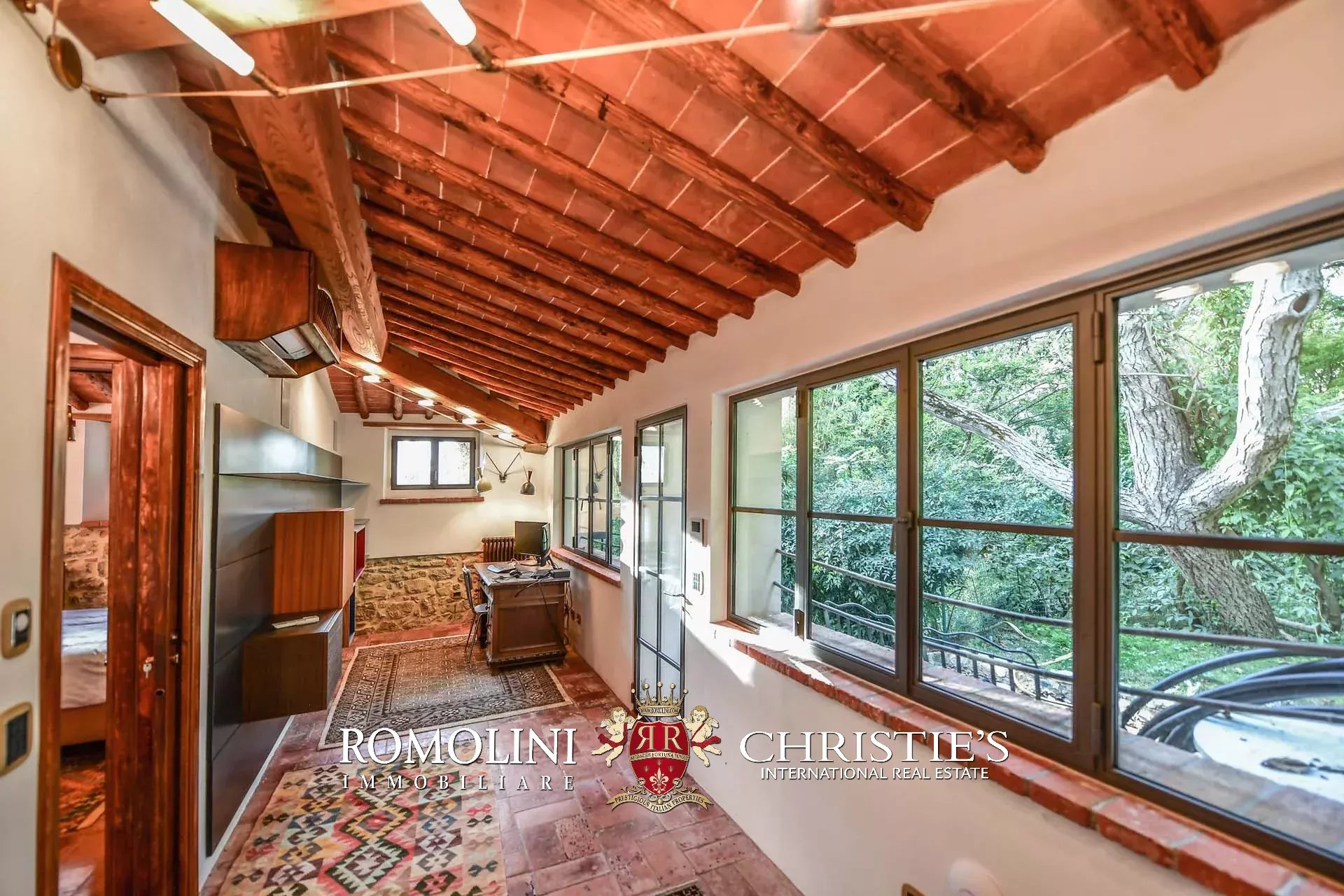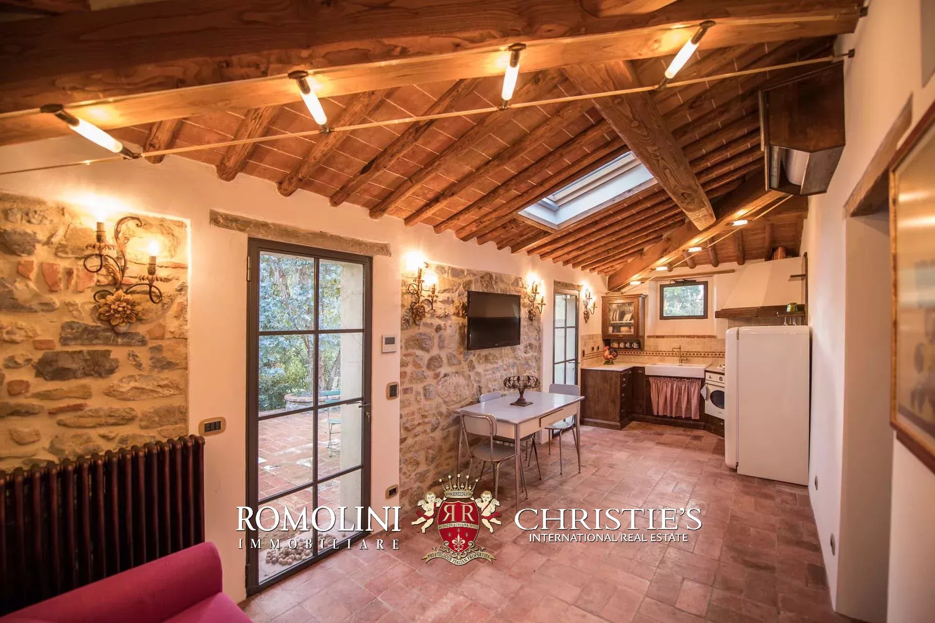 Recentemente ristrutturata dai nuovi proprietari, la villa ha mantenuto il suo aspetto rurale con pavimenti in cotto, travi in legno, archi, un imponente camino in pietra, una scala in pietra, un portico e una loggia chiusa da ampie vetrate che ne permettono l’uso anche in inverno.