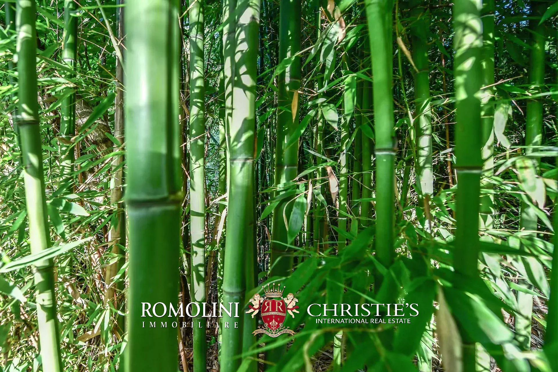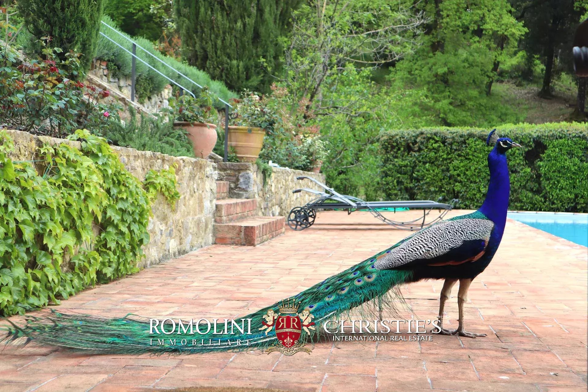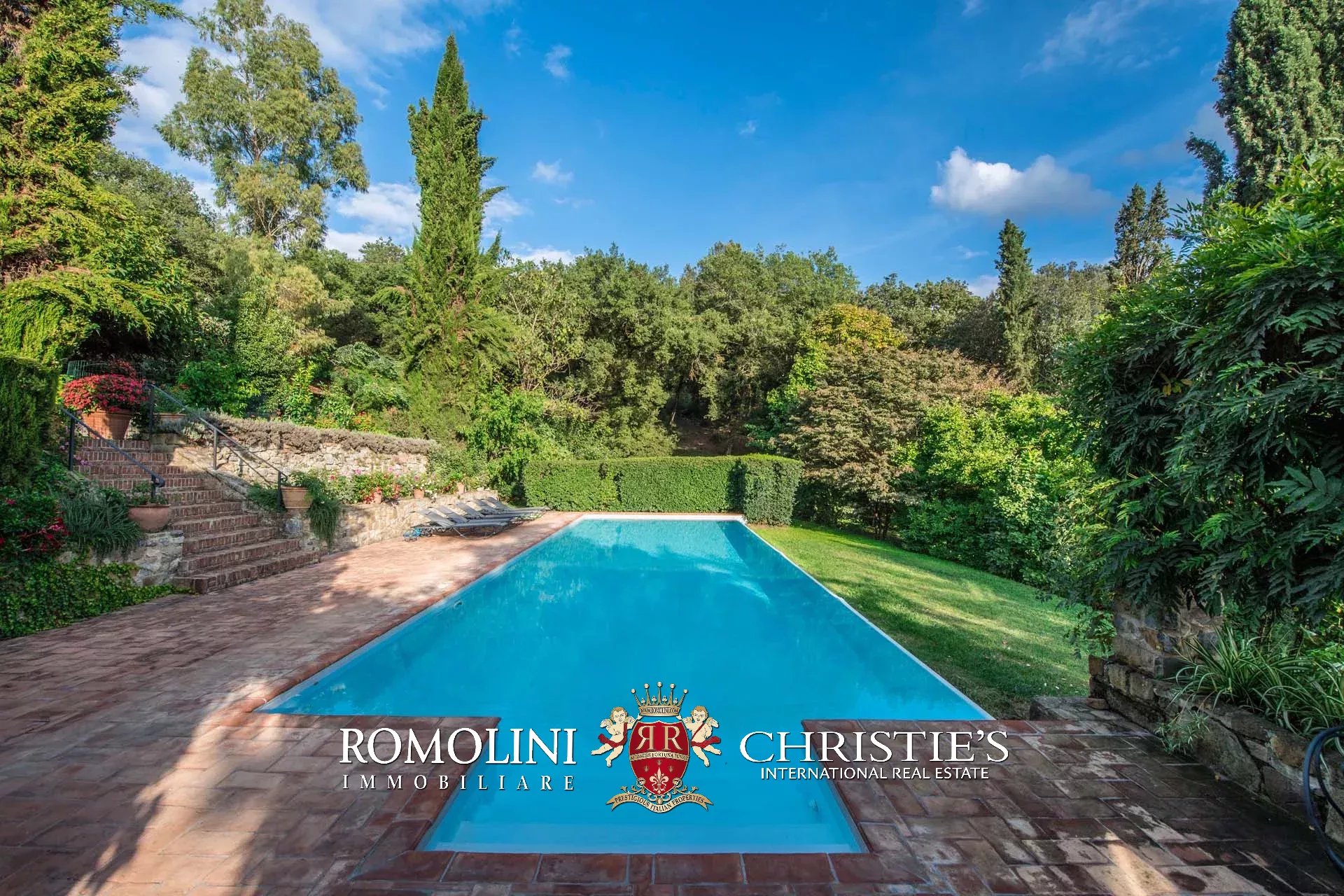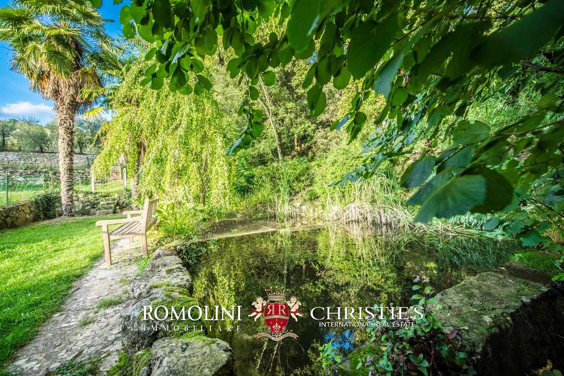 La proprietà è circondata da un elegante giardino (circa 3.000 mq) con piscina a sfioro 14 × 5 m (con profondità variabile da 1,2 a 2,0 m). Il giardino, perfettamente curato, è arricchito da sentieri, numerose piante ornamentali e fiori come magnolie, rododendri e azalee.
