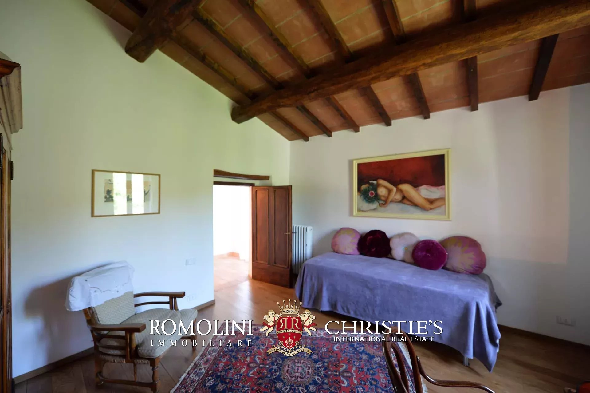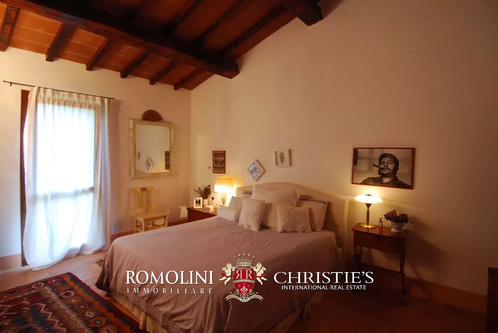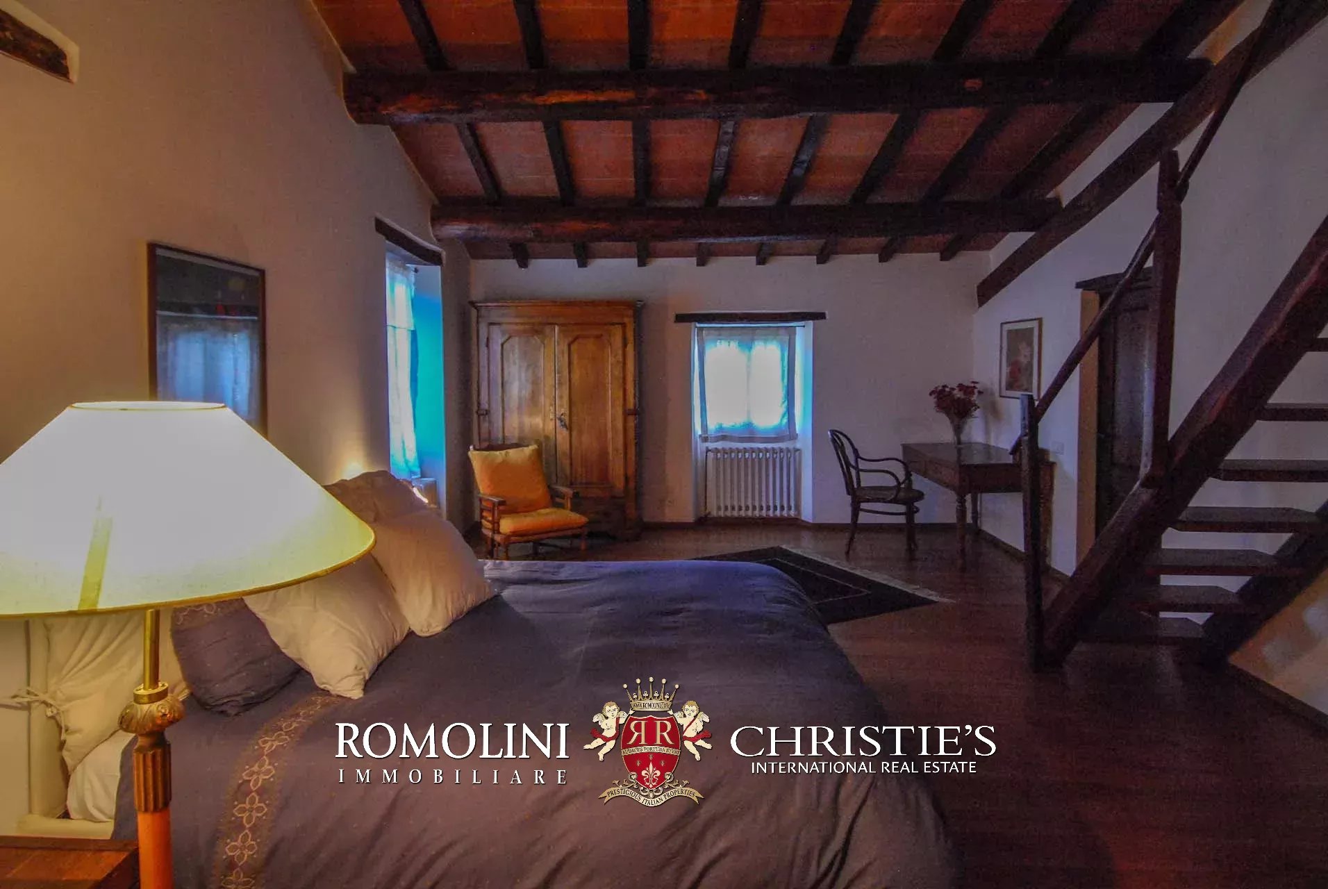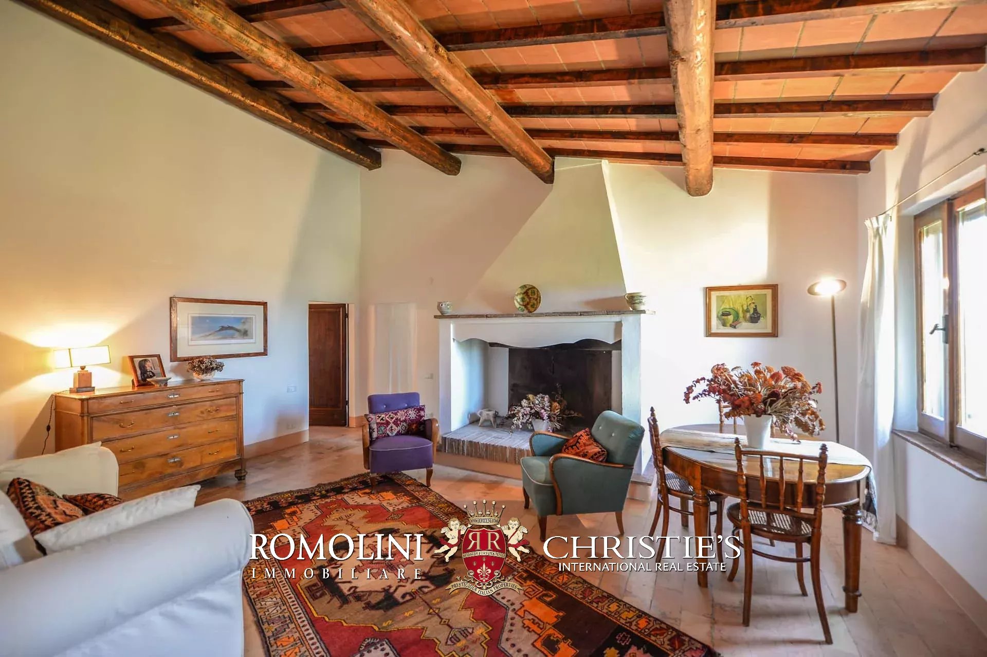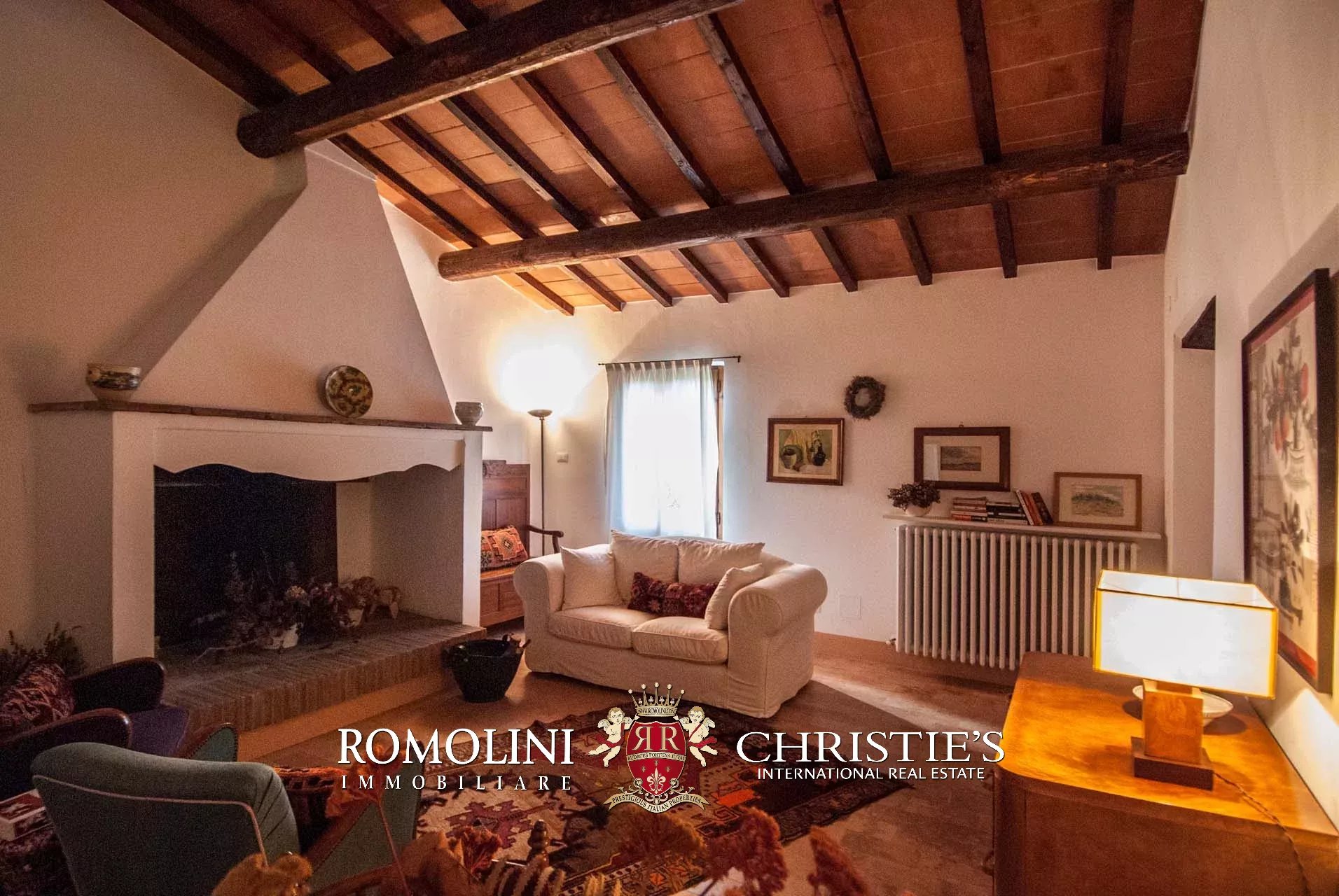 La villa (400 mq, 5 camere e 3 bagni) è stata recentemente ristrutturata e arredata con mobilio d’epoca originale. In particolare sono stati mantenuti i due splendidi camini (uno per piano) e le travi in legno al piano superiore. L’edificio si sviluppa su due piani più soffitta così organizzati: