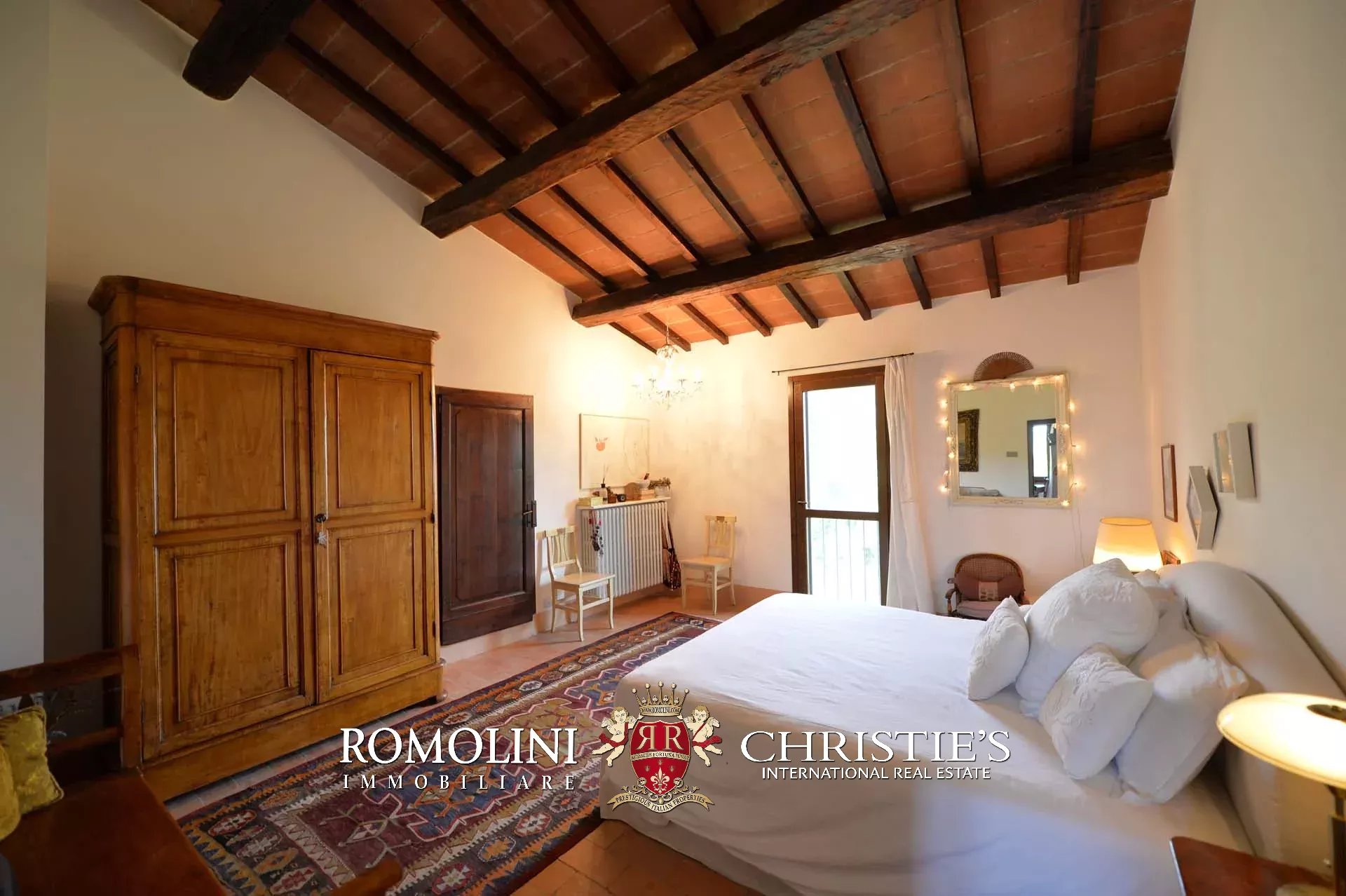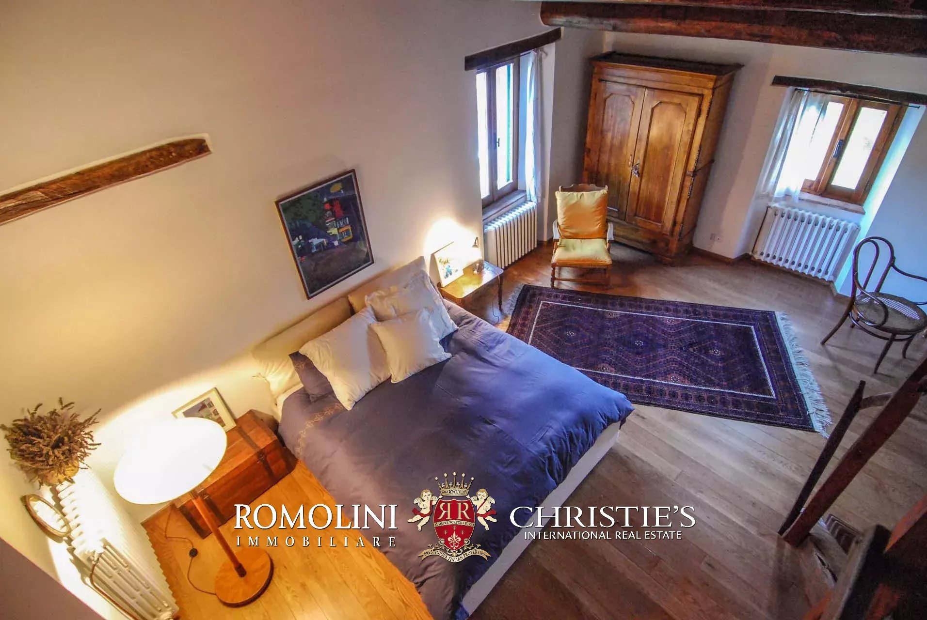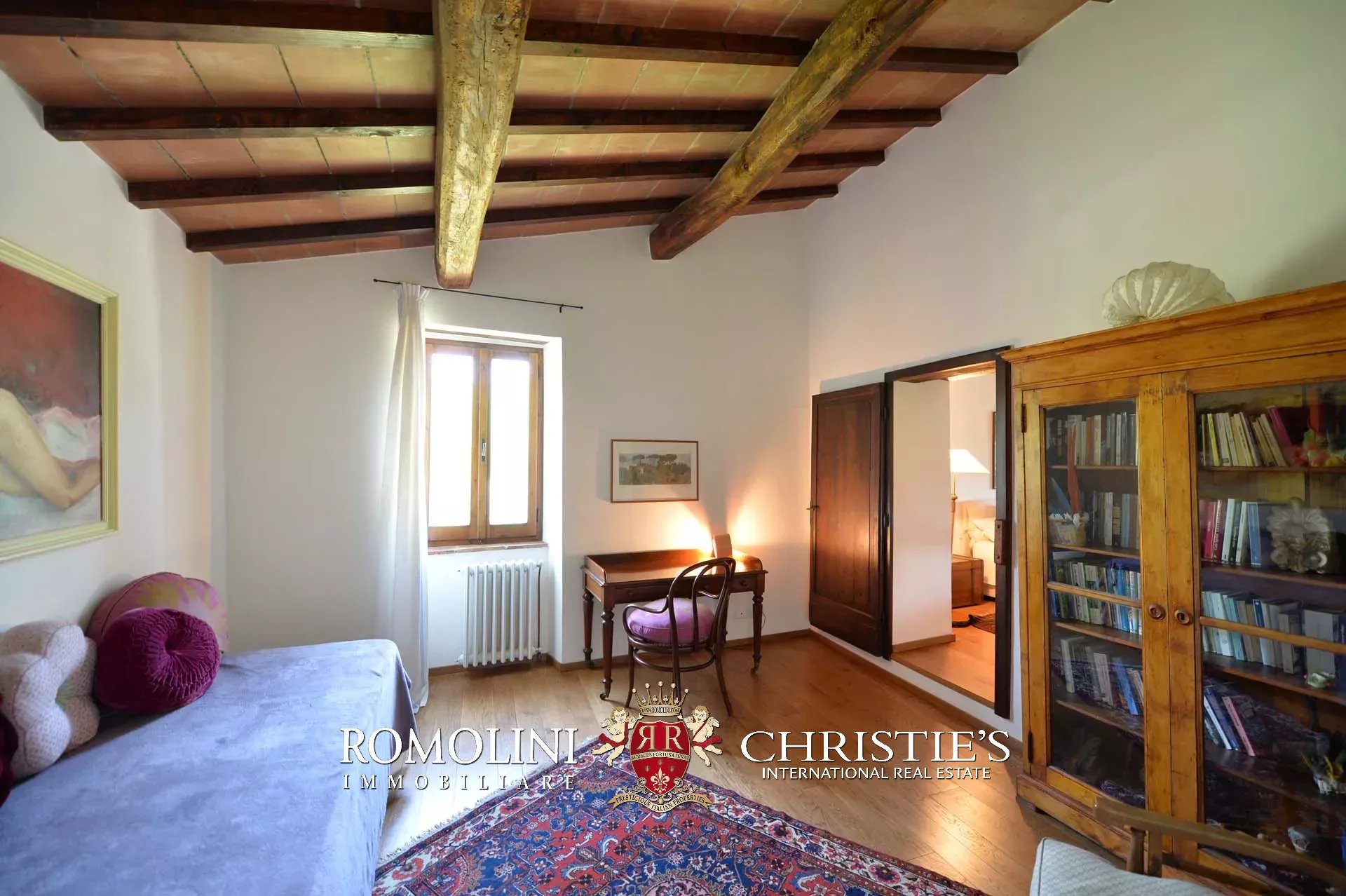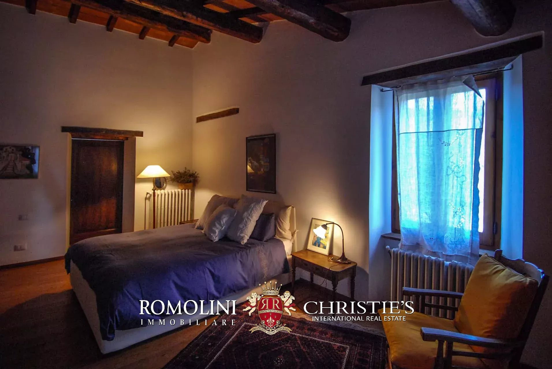 La villa (400 mq, 5 camere e 3 bagni) è stata recentemente ristrutturata e arredata con mobilio d’epoca originale. In particolare sono stati mantenuti i due splendidi camini (uno per piano) e le travi in legno al piano superiore. L’edificio si sviluppa su due piani più soffitta così organizzati: