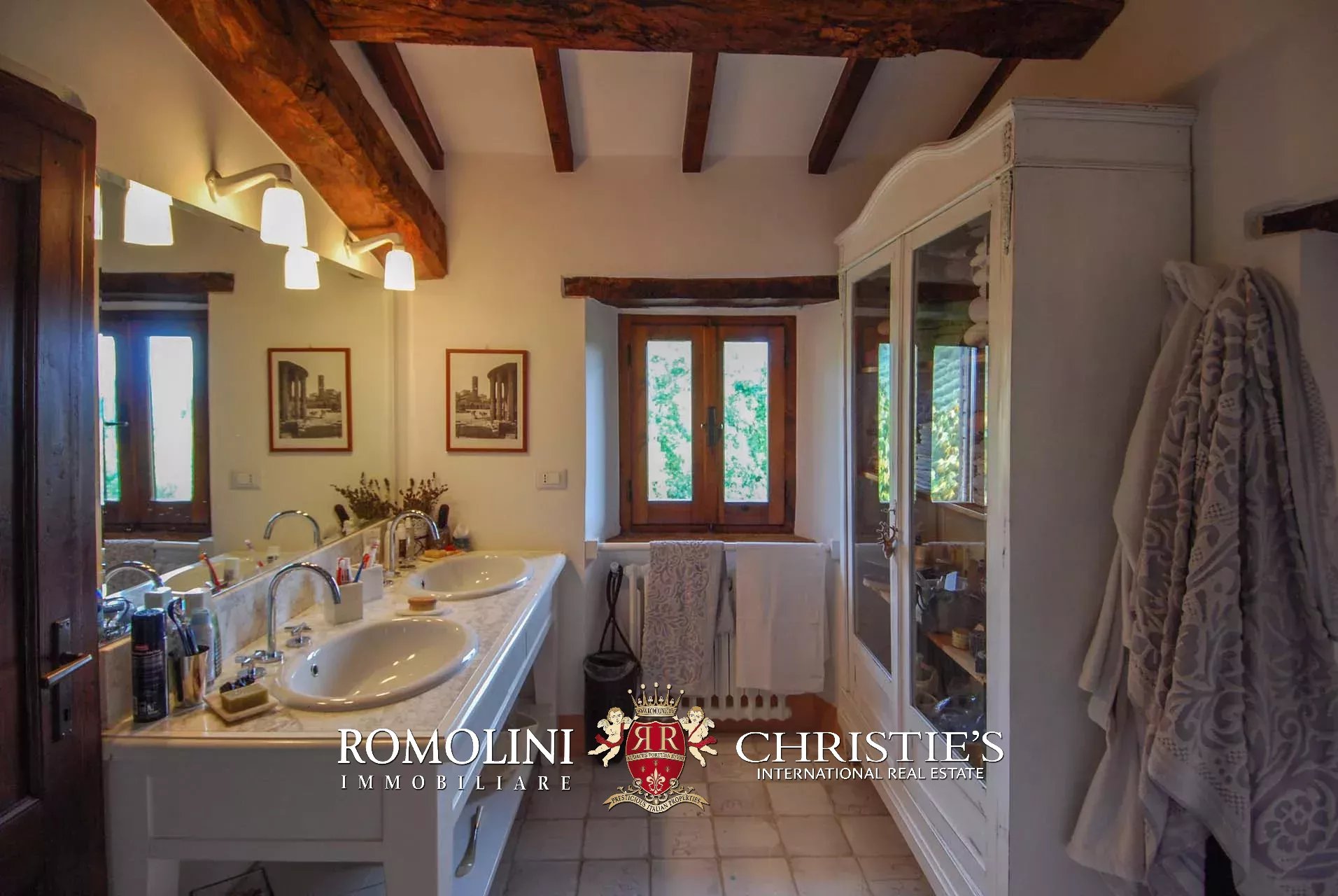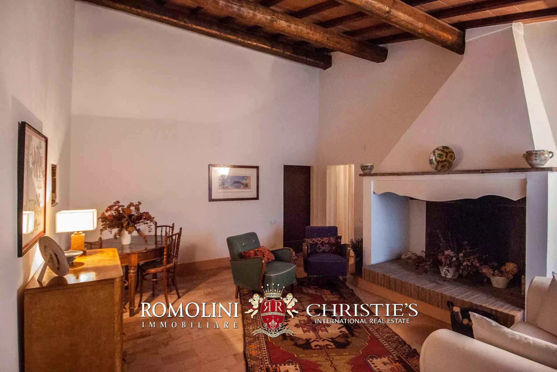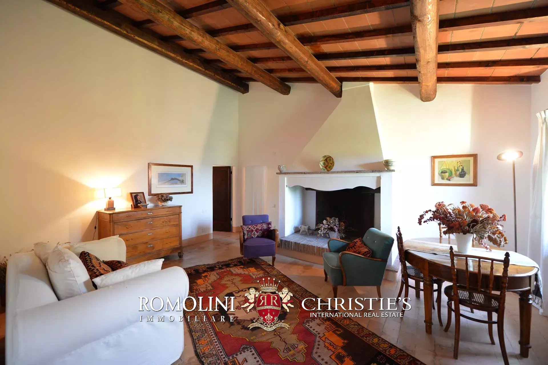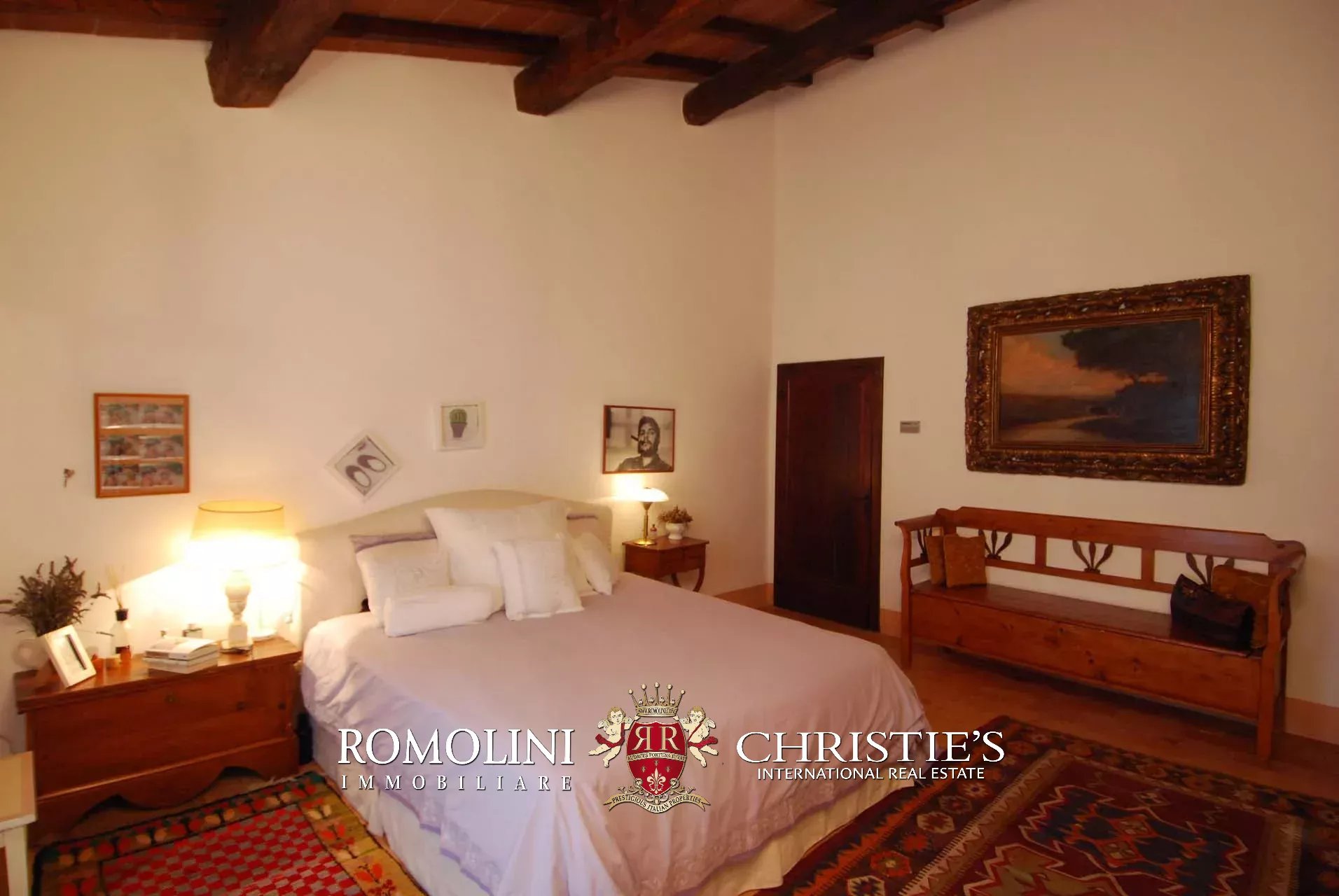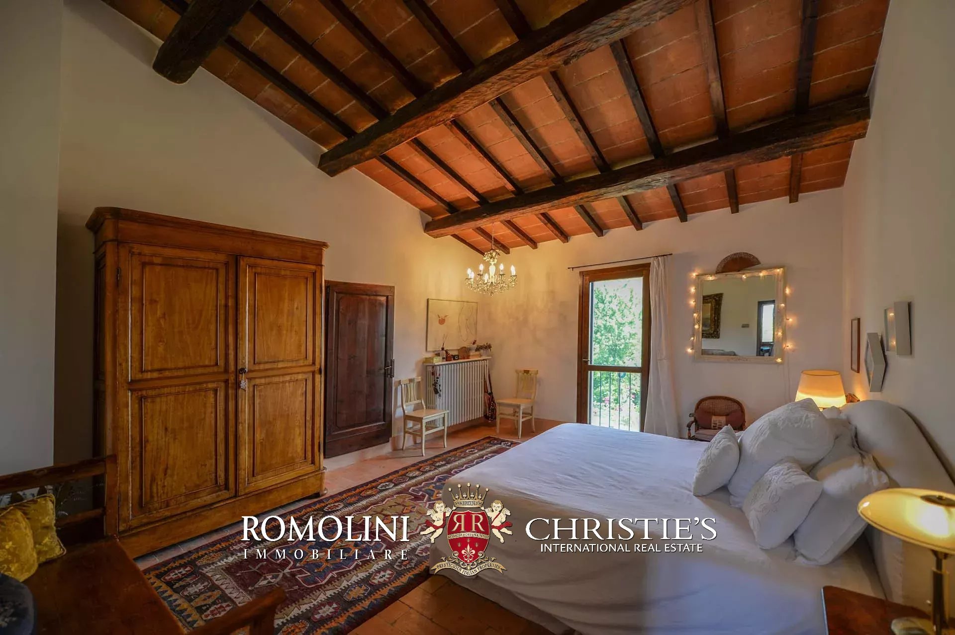 La villa (400 mq, 5 camere e 3 bagni) è stata recentemente ristrutturata e arredata con mobilio d’epoca originale. In particolare sono stati mantenuti i due splendidi camini (uno per piano) e le travi in legno al piano superiore. L’edificio si sviluppa su due piani più soffitta così organizzati: