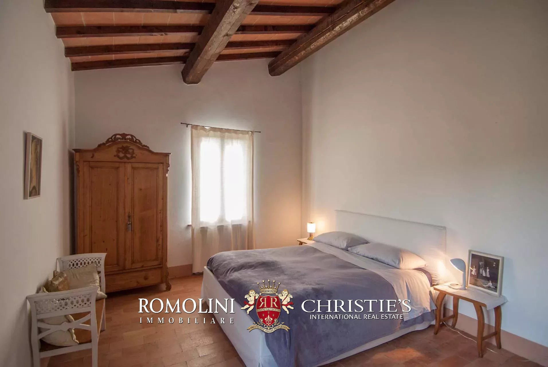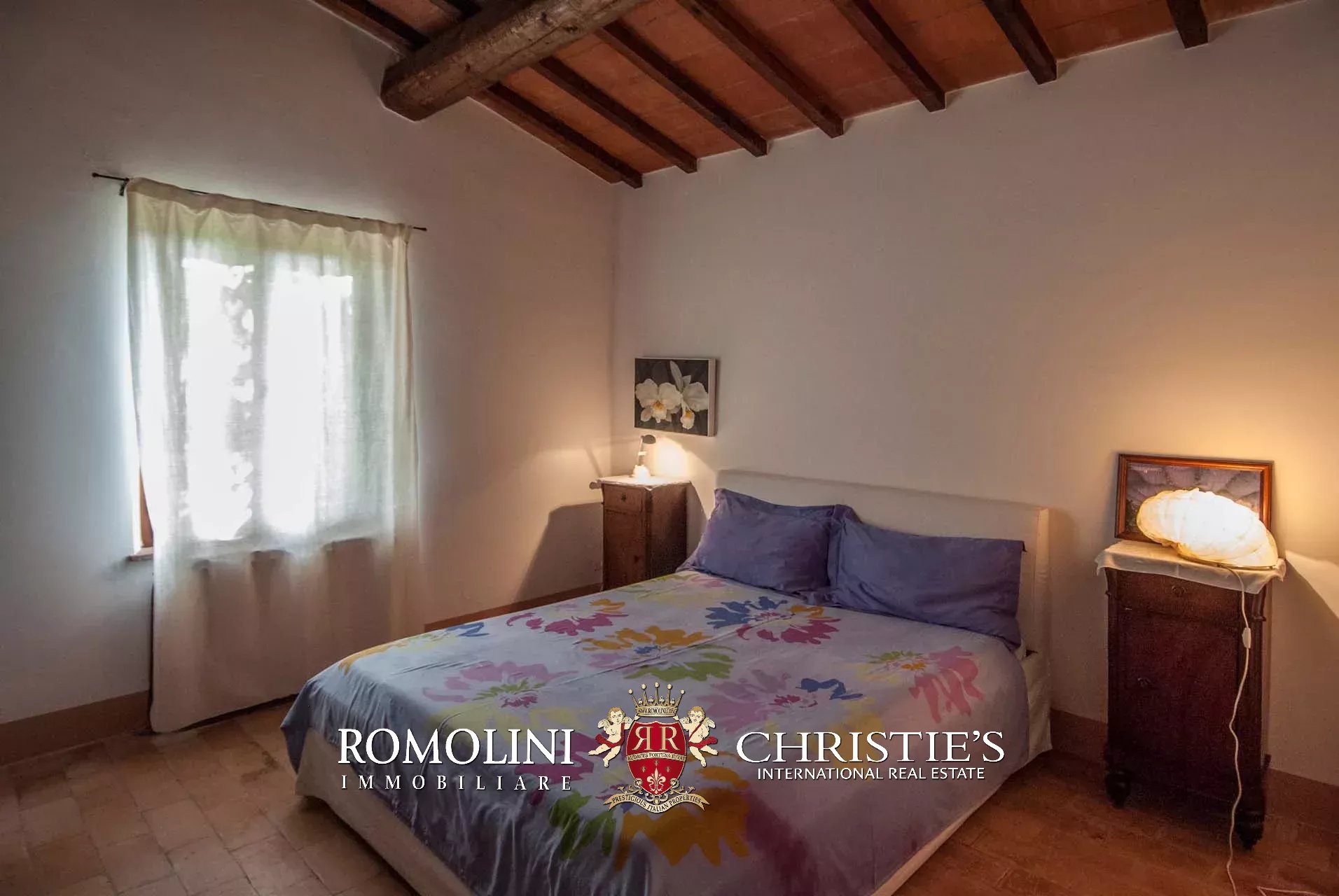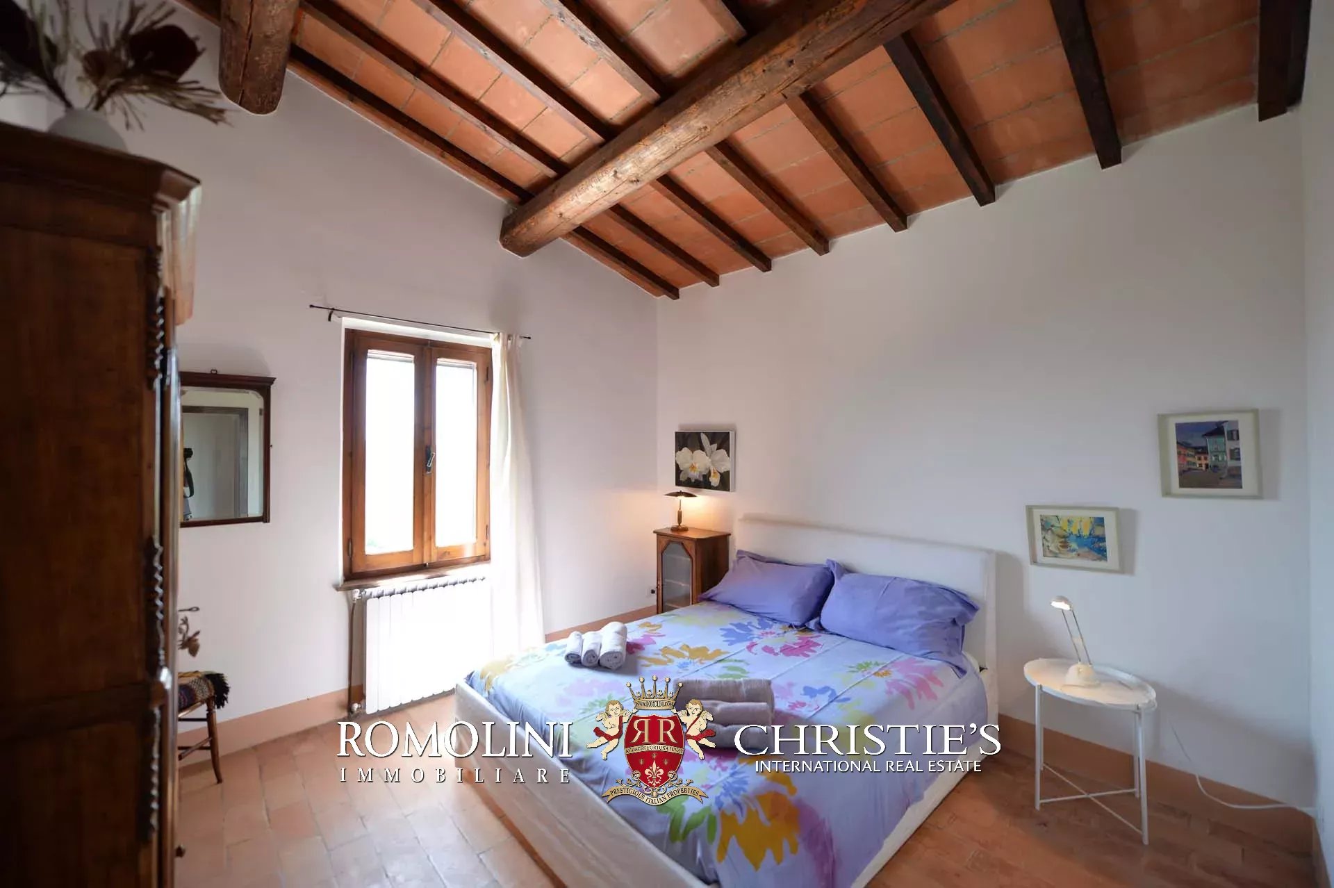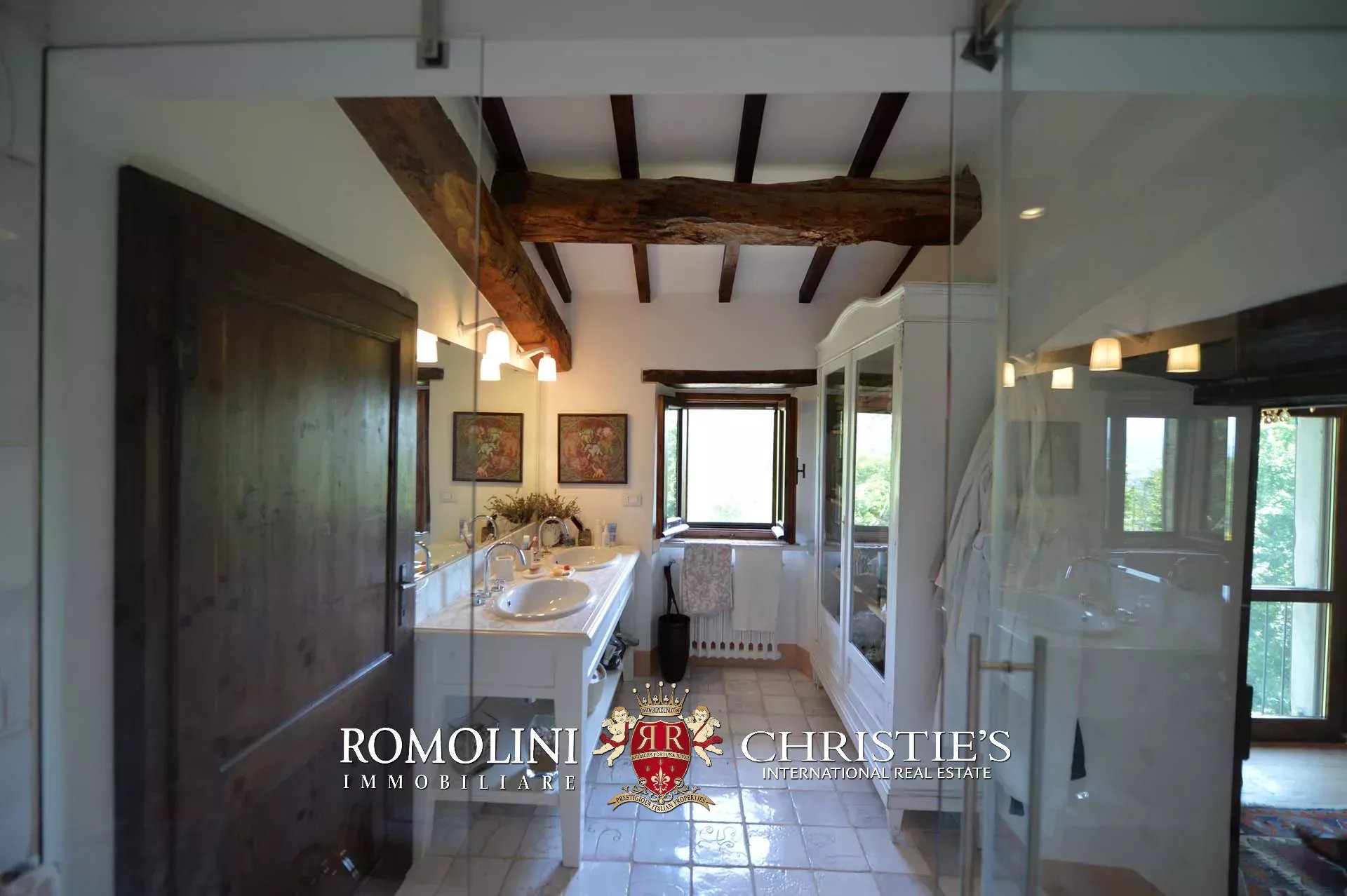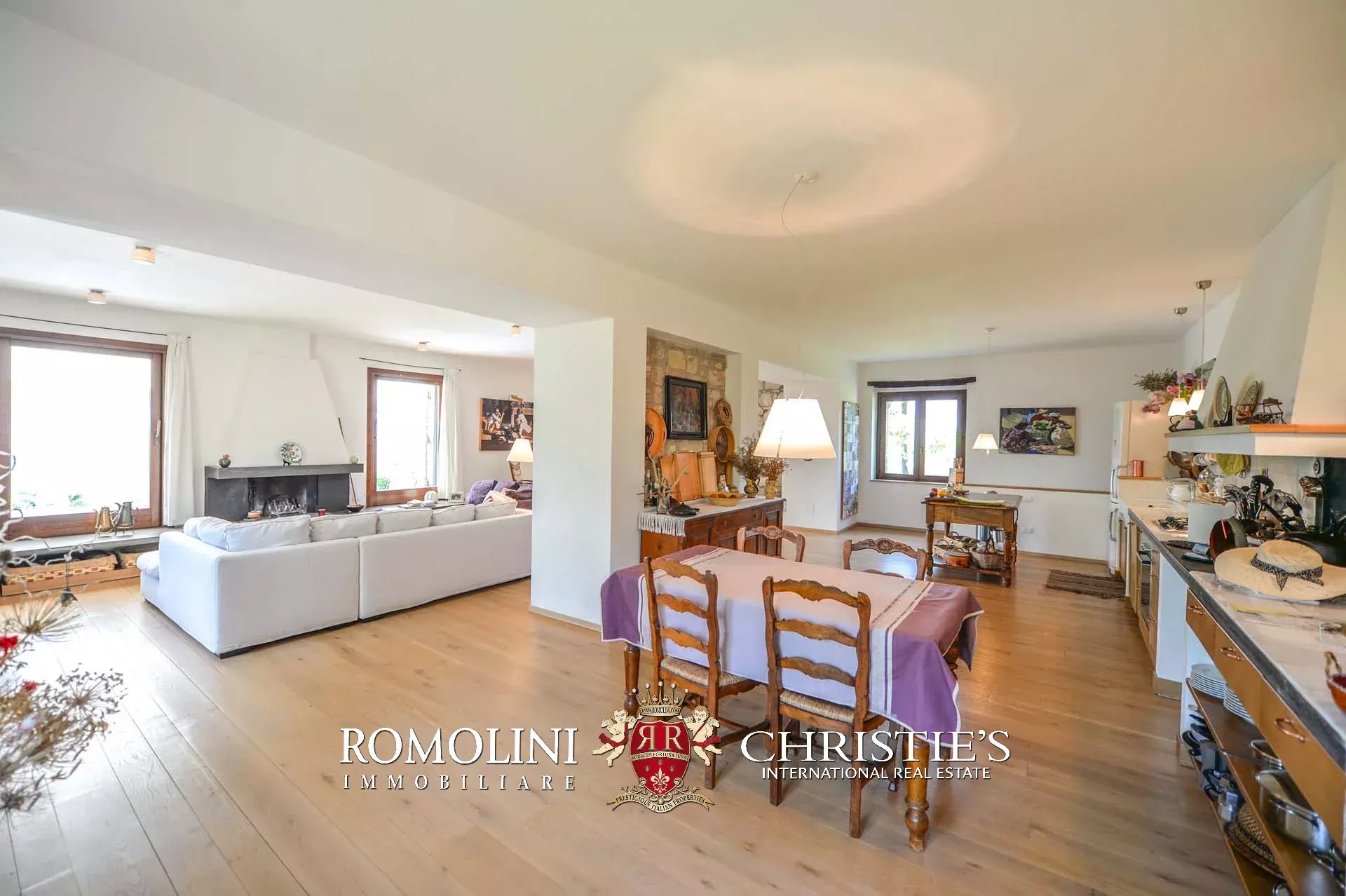 La villa (400 mq, 5 camere e 3 bagni) è stata recentemente ristrutturata e arredata con mobilio d’epoca originale. In particolare sono stati mantenuti i due splendidi camini (uno per piano) e le travi in legno al piano superiore. L’edificio si sviluppa su due piani più soffitta così organizzati: