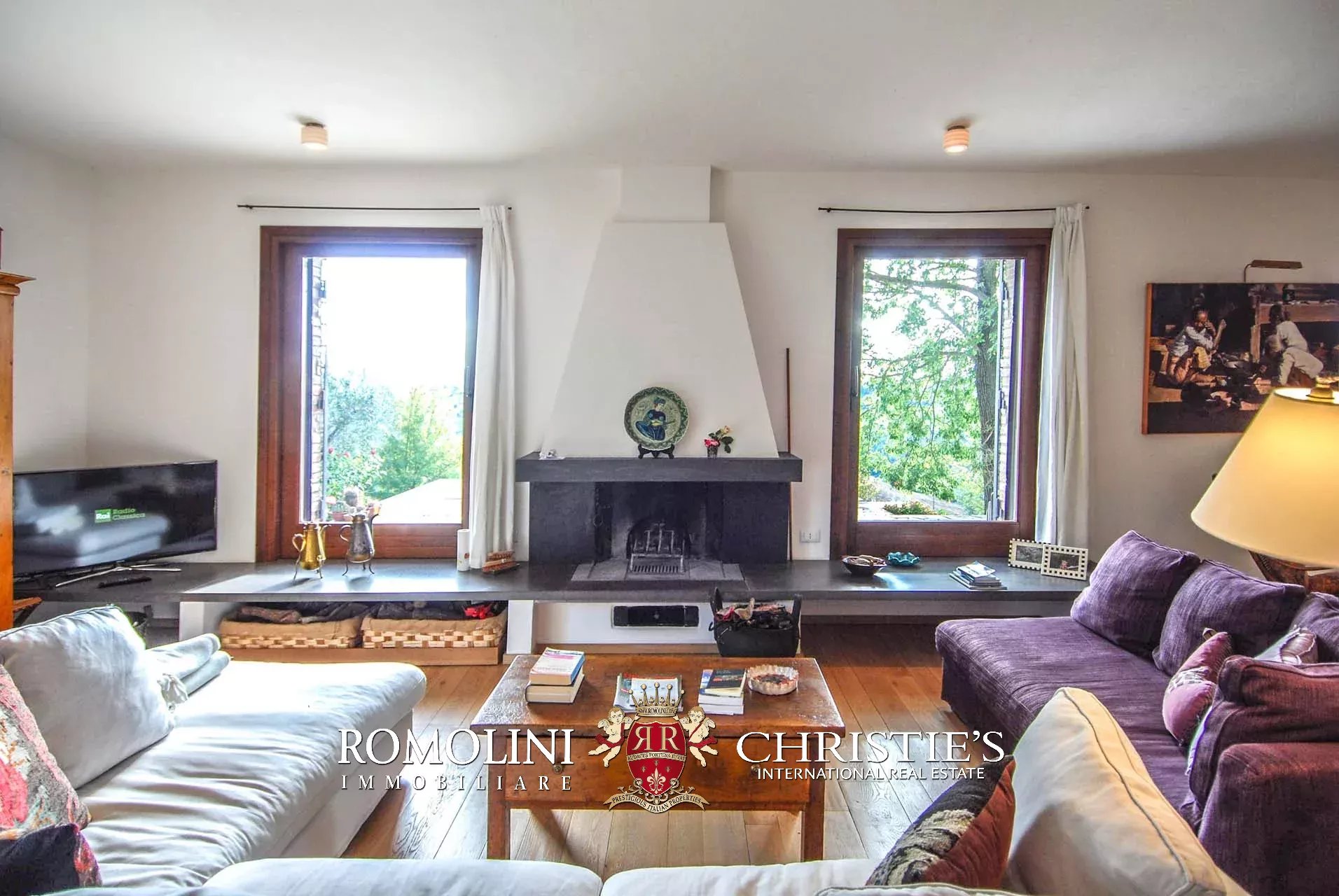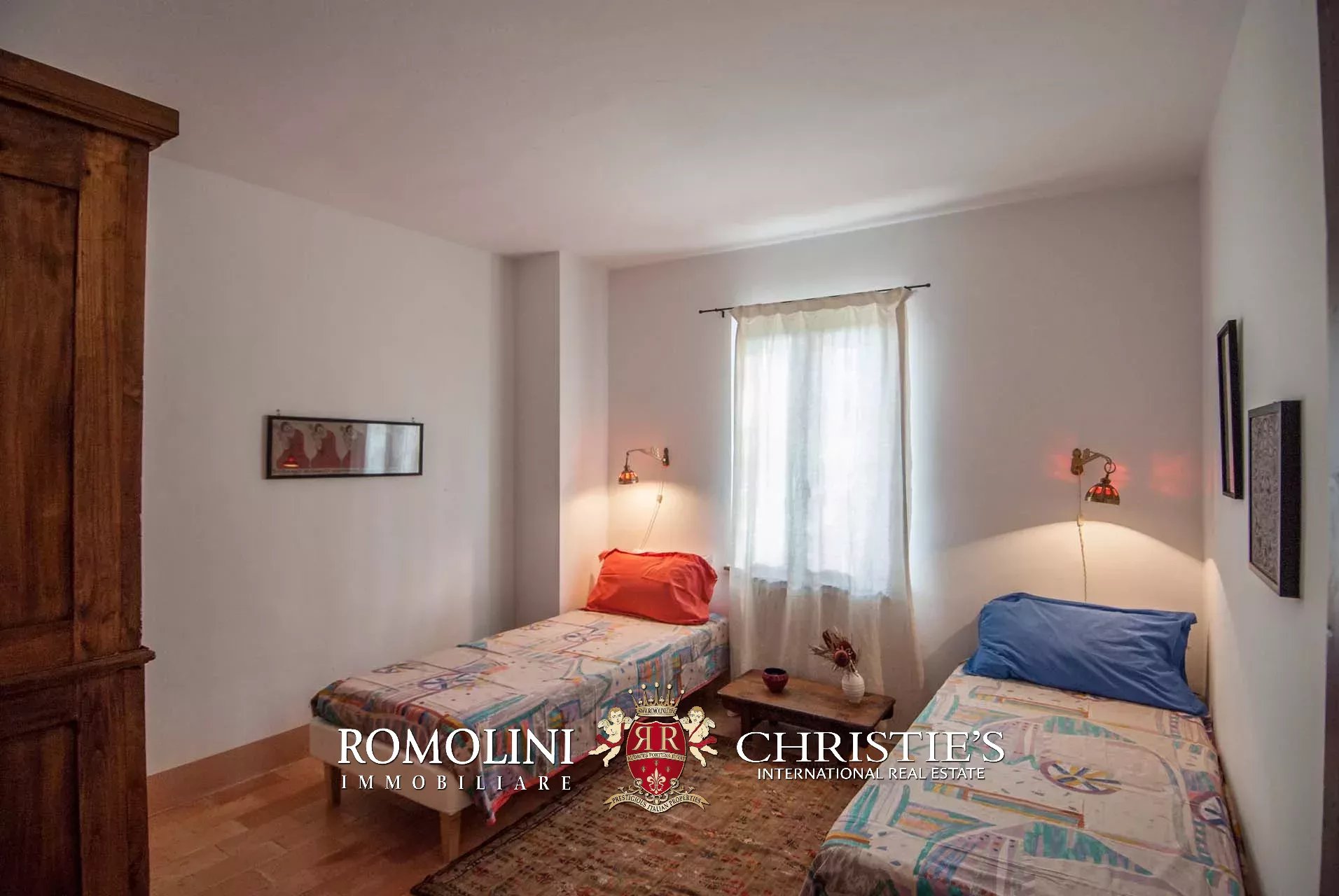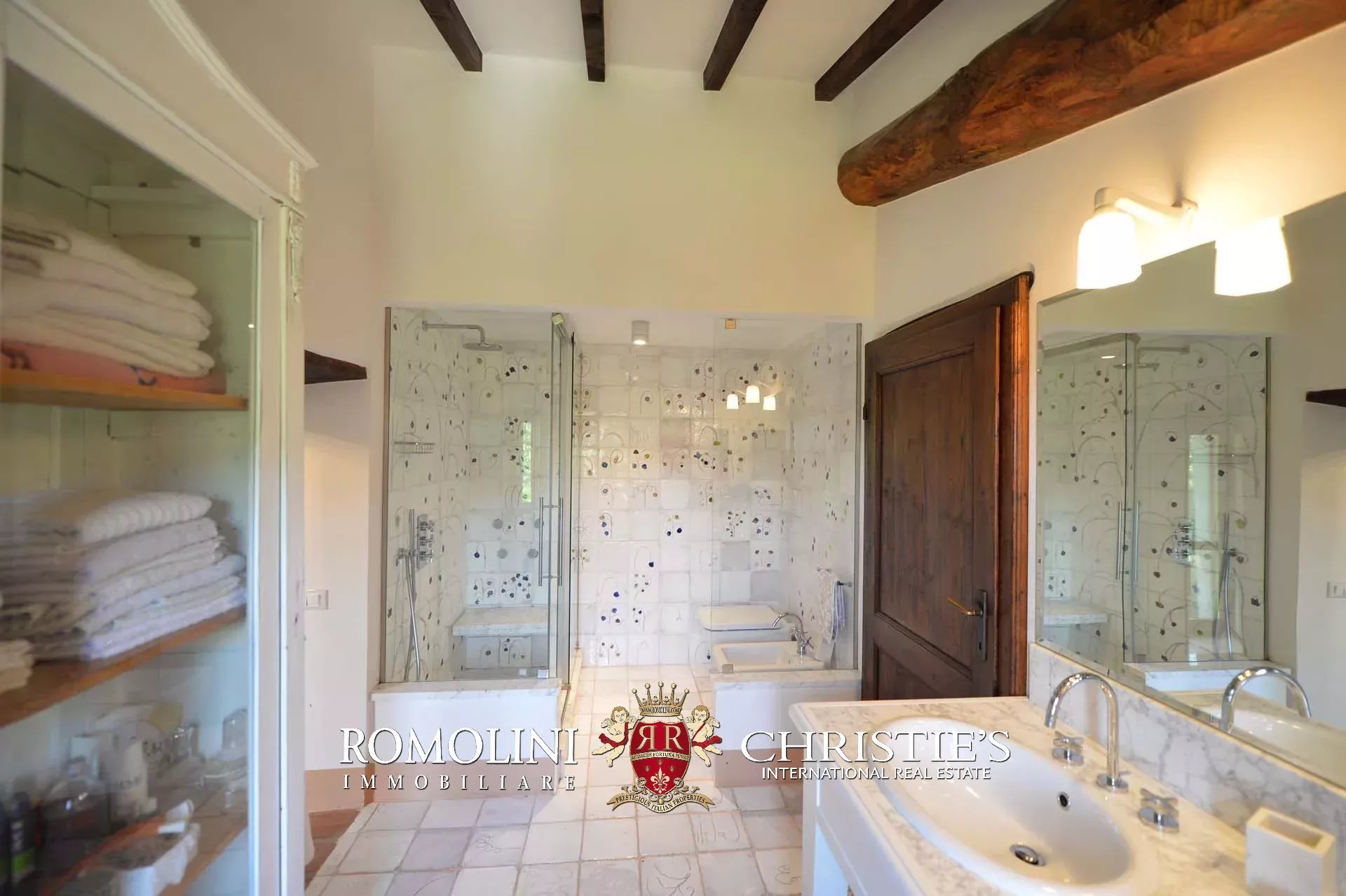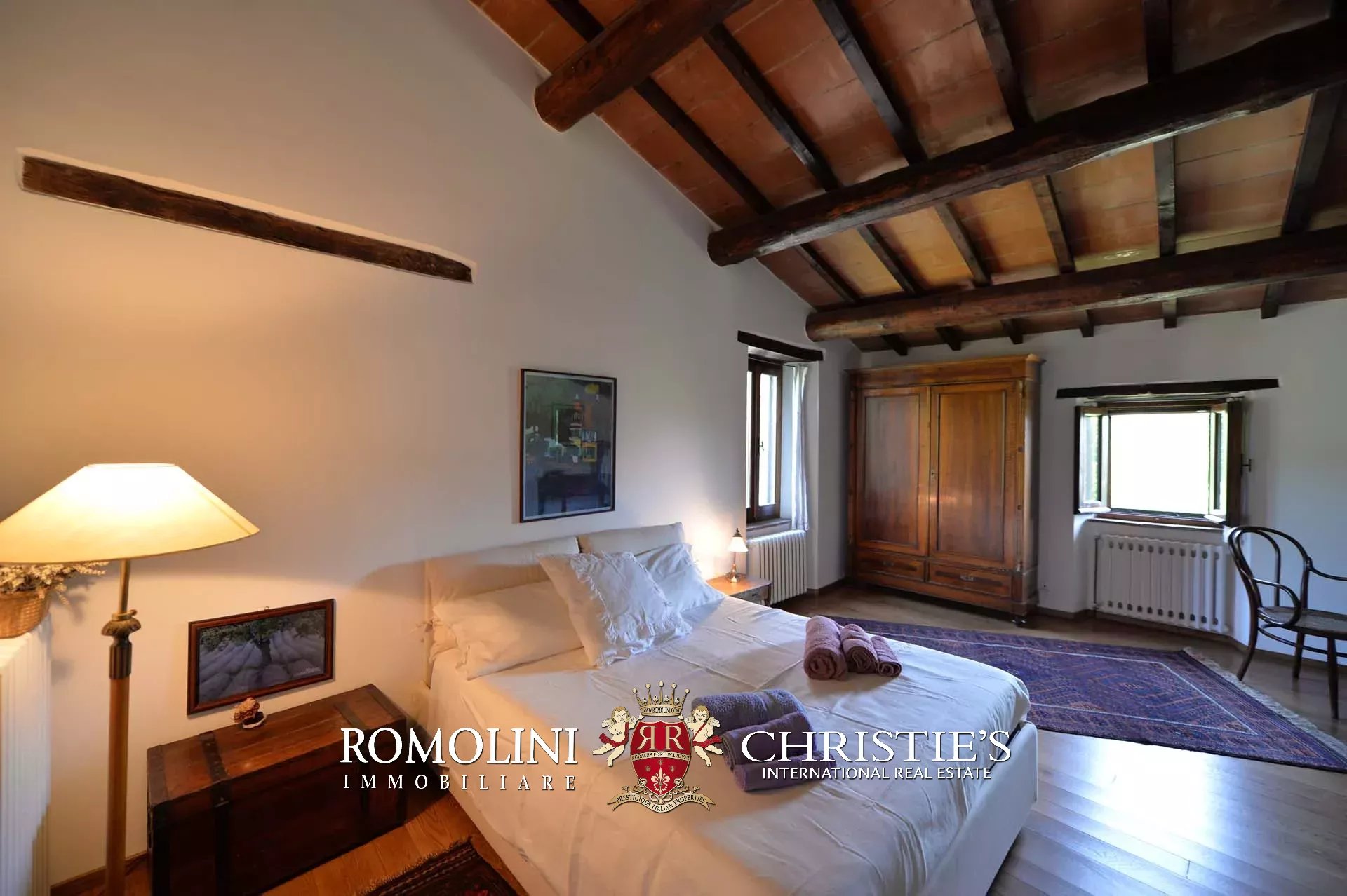 La villa (400 mq, 5 camere e 3 bagni) è stata recentemente ristrutturata e arredata con mobilio d’epoca originale. In particolare sono stati mantenuti i due splendidi camini (uno per piano) e le travi in legno al piano superiore. L’edificio si sviluppa su due piani più soffitta così organizzati: