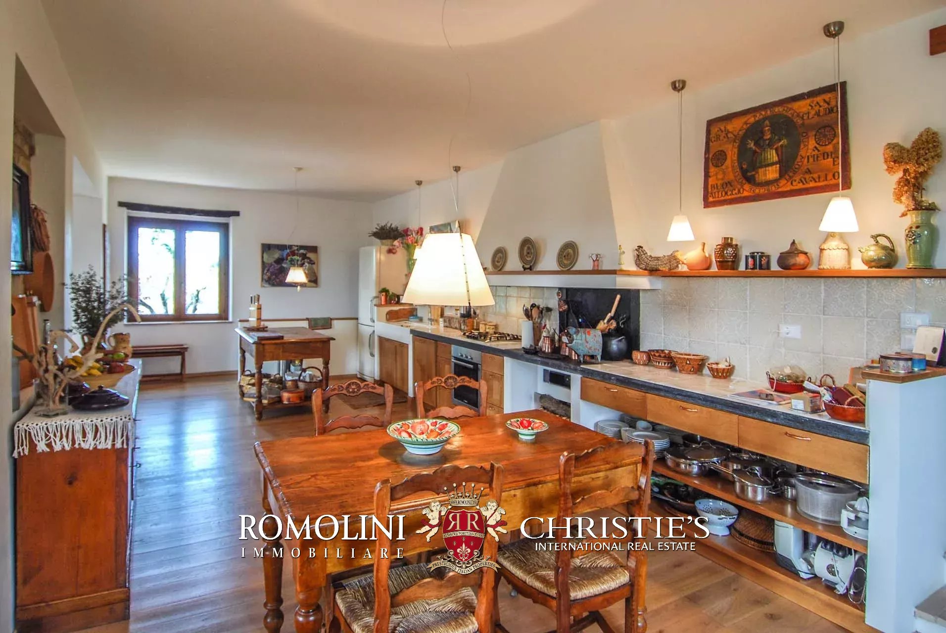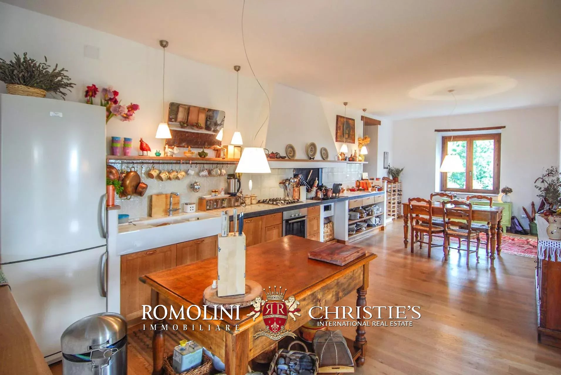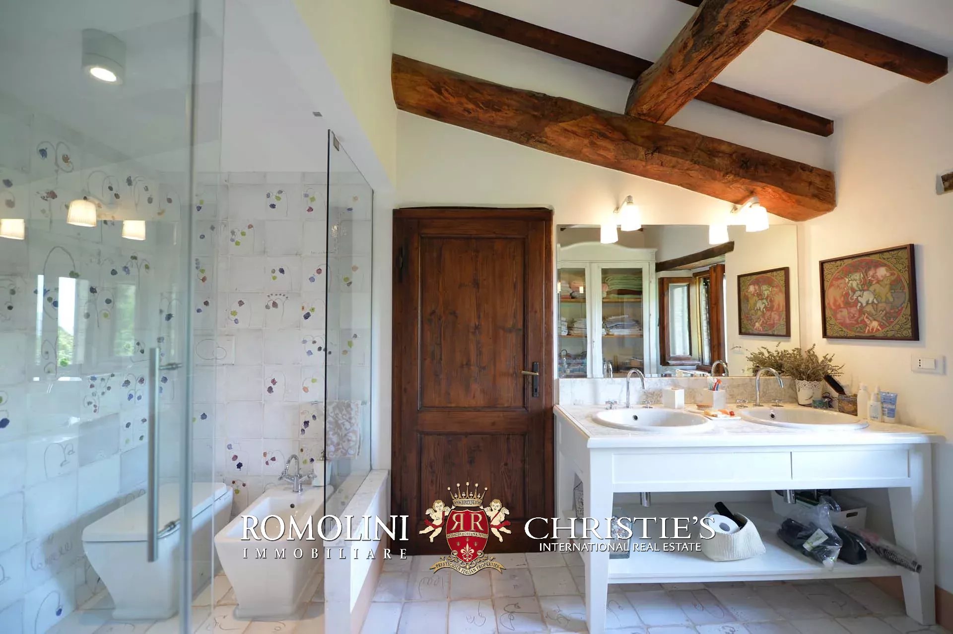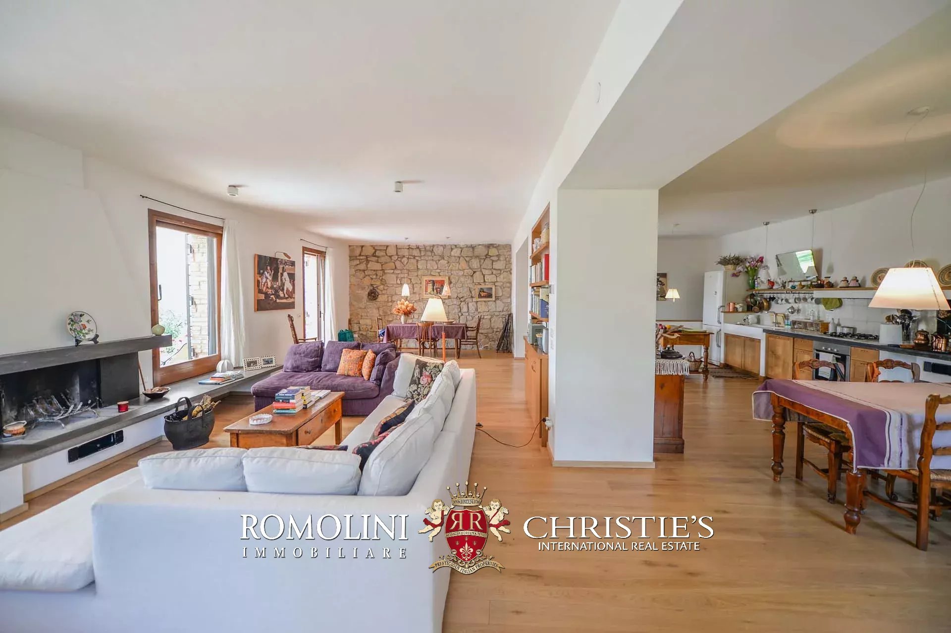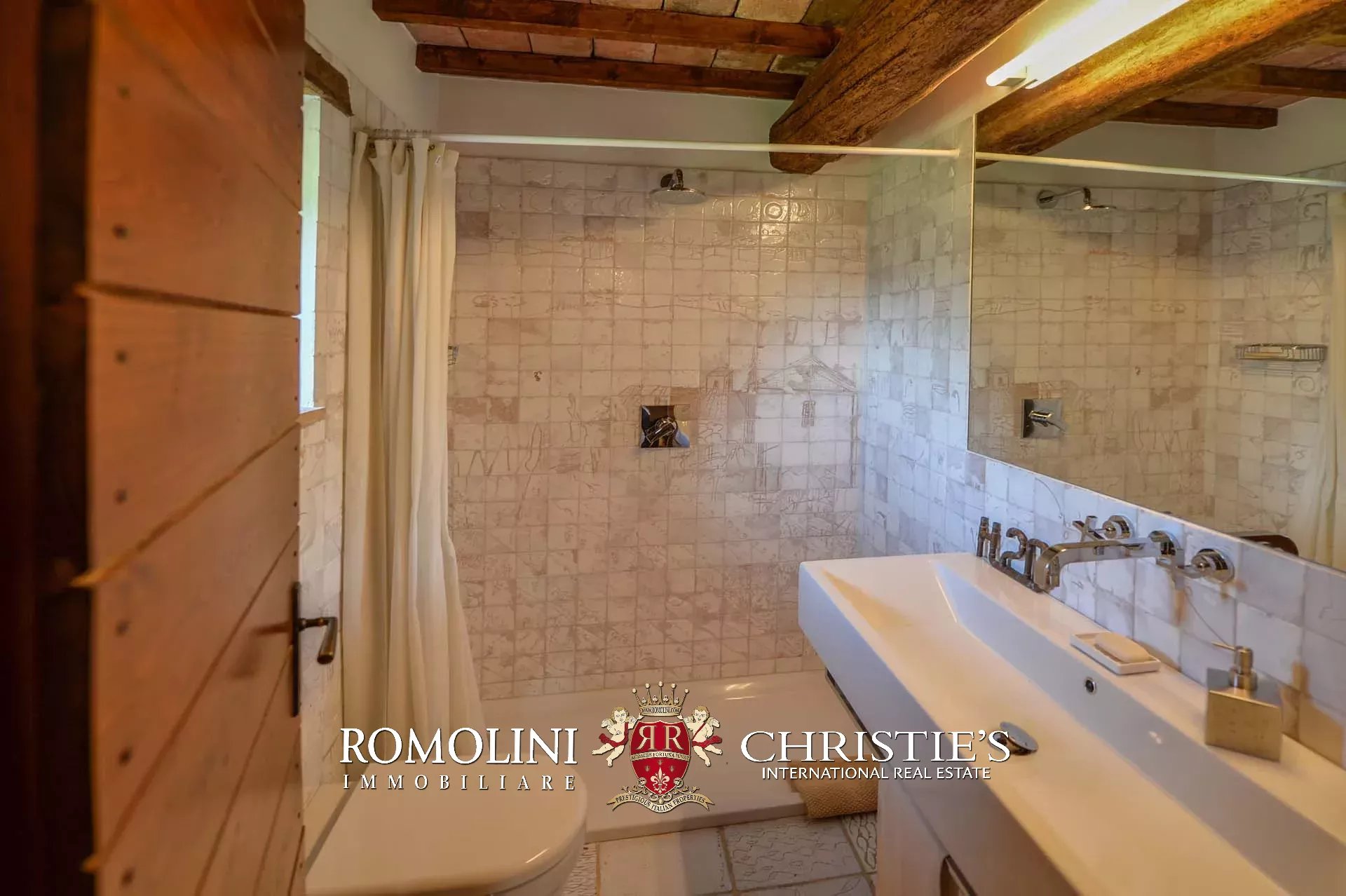 La villa (400 mq, 5 camere e 3 bagni) è stata recentemente ristrutturata e arredata con mobilio d’epoca originale. In particolare sono stati mantenuti i due splendidi camini (uno per piano) e le travi in legno al piano superiore. L’edificio si sviluppa su due piani più soffitta così organizzati: