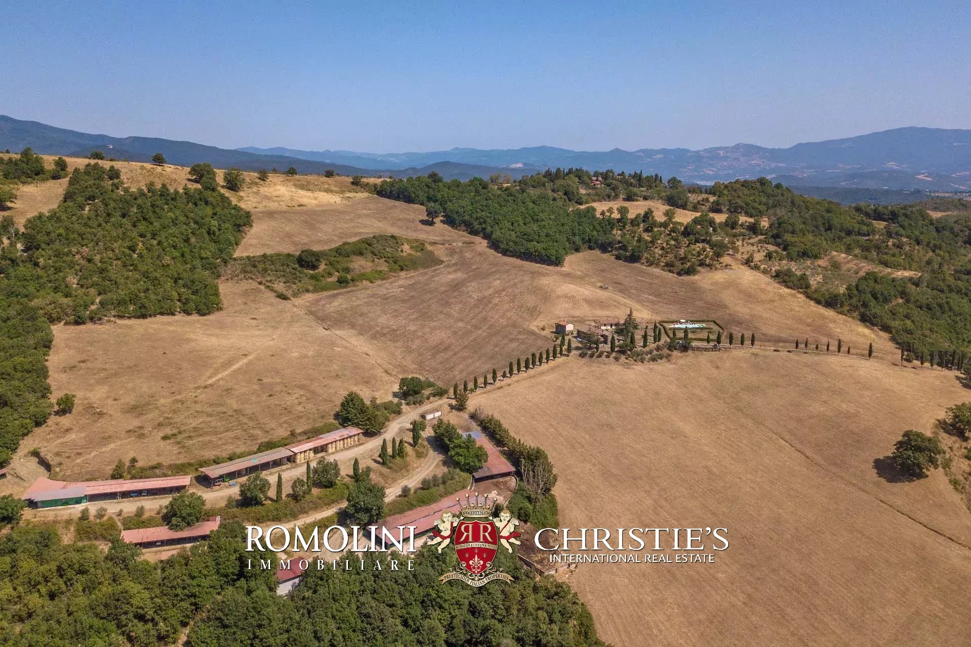 Sulle colline della provincia di Arezzo, in una posizione tranquilla e molto panoramica, azienda agricola di 171,6 ettari con allevamento di bovini e agriturismo. La proprietà, ristrutturata nel 2011, ospita due casali adibiti alla ricezione degli ospiti (8 camere e 7 bagni), incluso un ristorante che serve ai propri clienti verdure e carni prodotte in azienda (Limousine e Charolais).