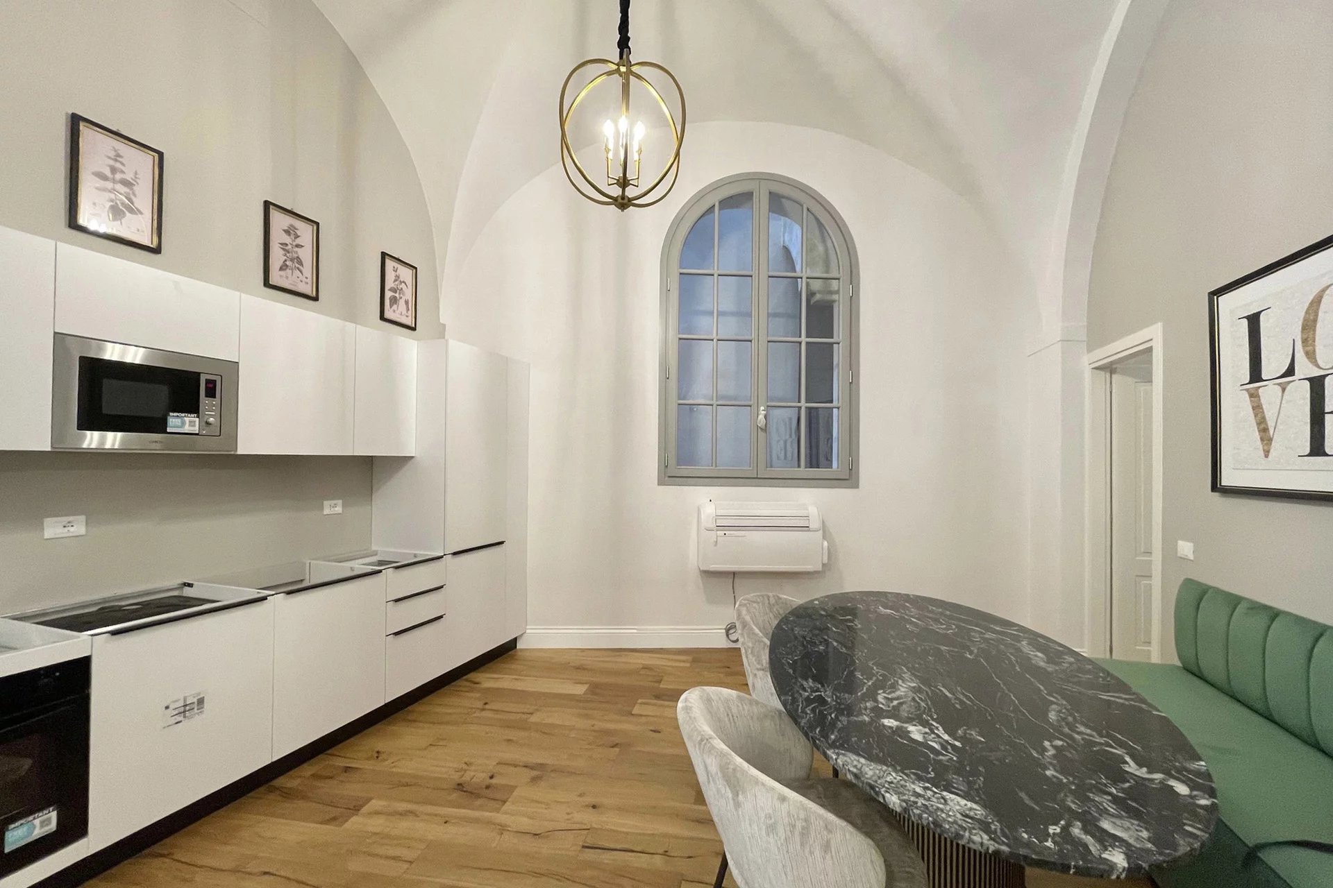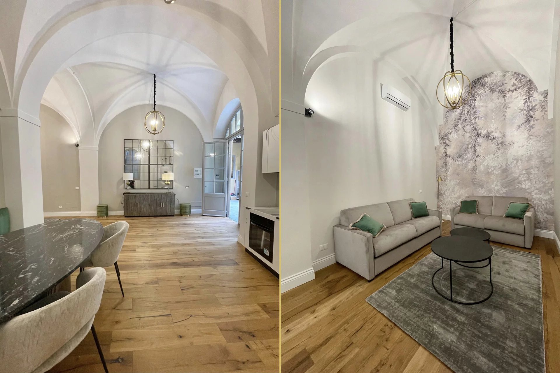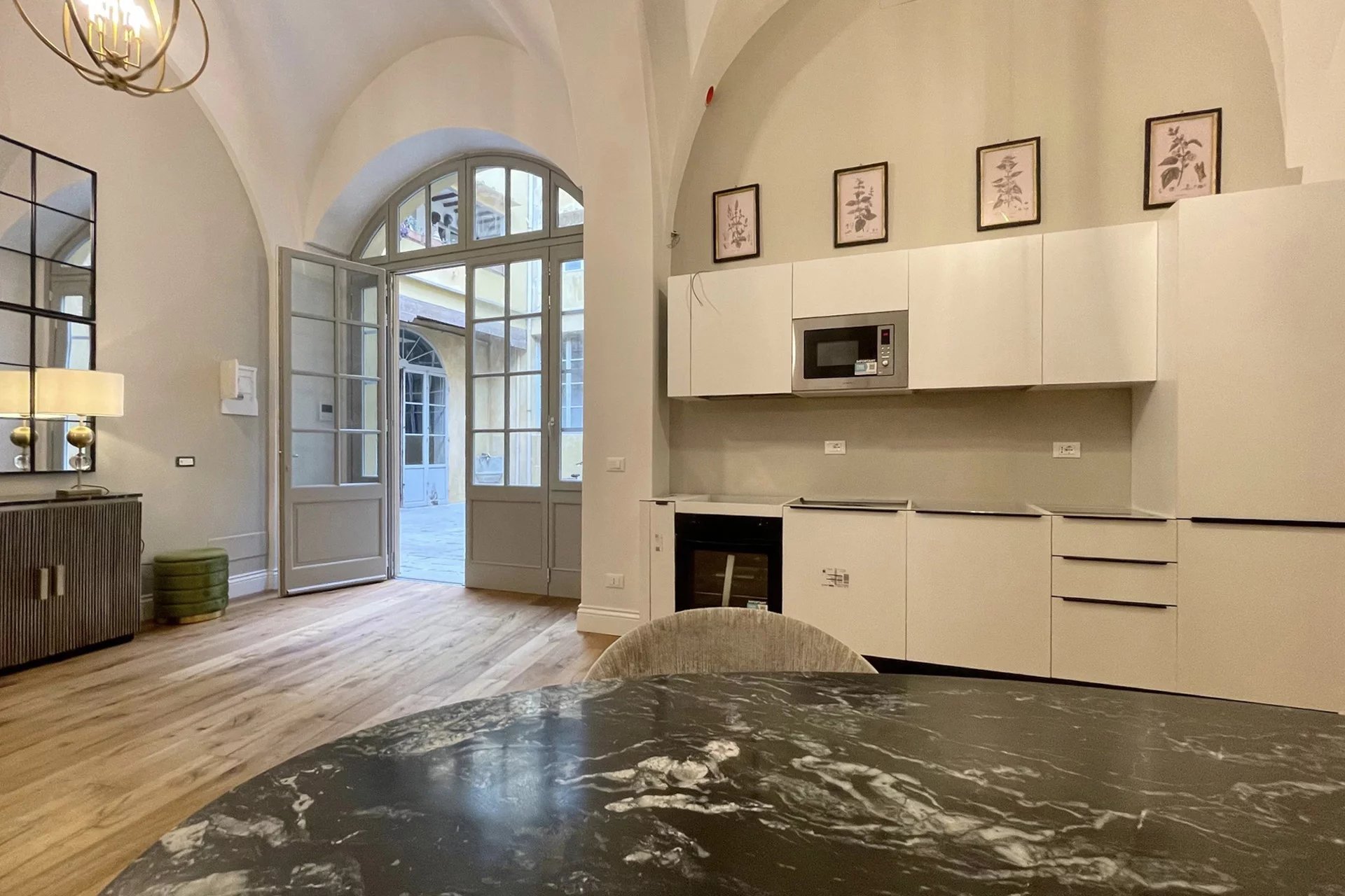L’immobile, con accesso dal cortile condominiale del palazzo, è stato completamente ristrutturato e arredato con grande attenzione ai dettagli, utilizzando materiali e finiture di alto livello. L’ingresso si apre su un ampio e luminoso salone caratterizzato da suggestivi soffitti a volta, affiancato da una zona cottura completamente attrezzata.