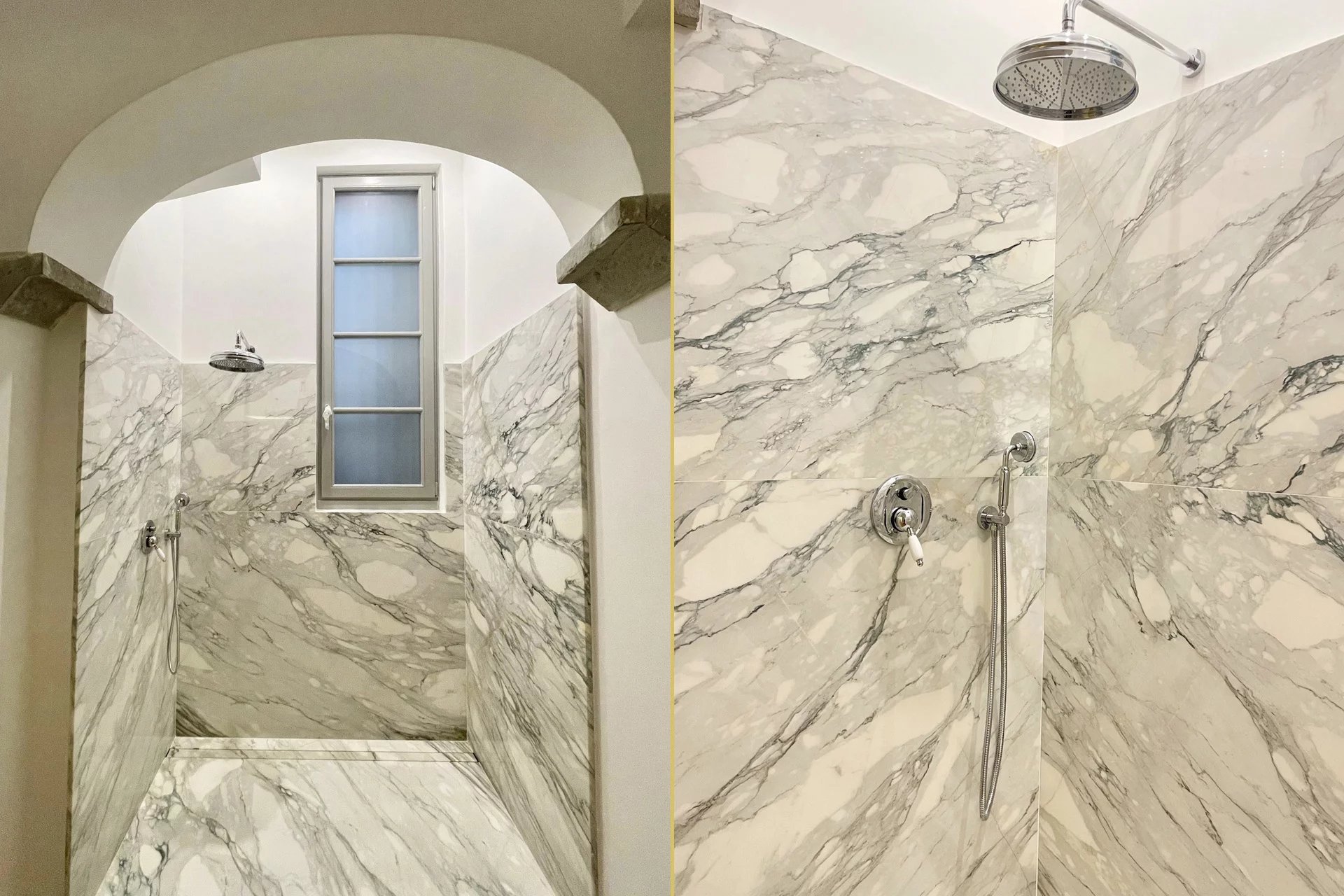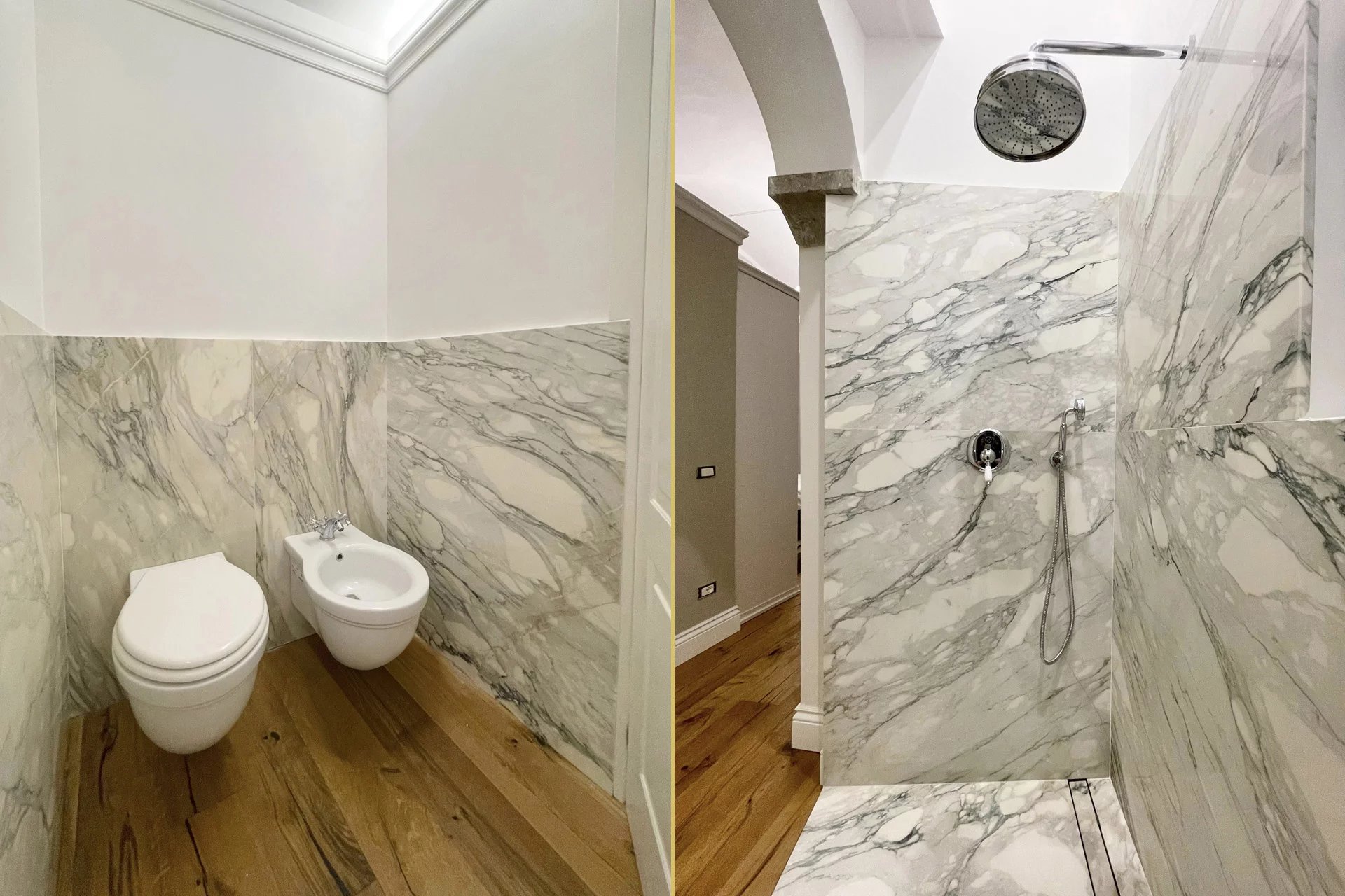 La zona notte comprende una spaziosa camera matrimoniale e un elegante bagno con ampia doccia rivestita in lastre di marmo. L’appartamento è dotato di aria condizionata, nuovi infissi e pavimenti in parquet, garantendo comfort moderno nel rispetto del carattere storico dell’edificio.