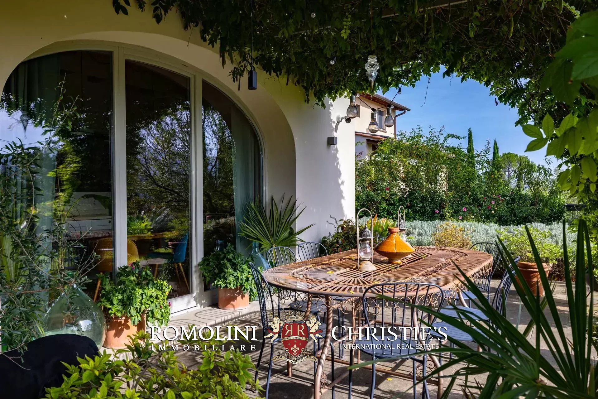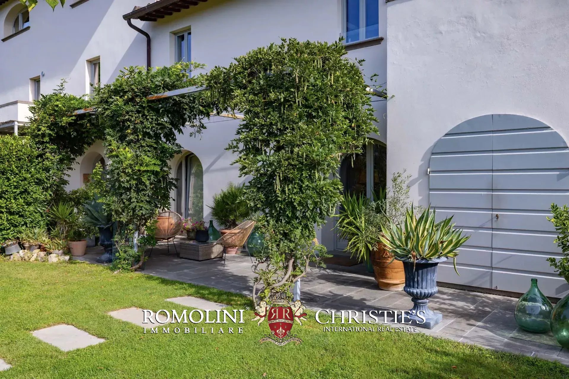 All’esterno, una loggia con pergola ricoperta da un elegante glicine introduce al giardino privato, ideale per momenti di relax e convivialità.
