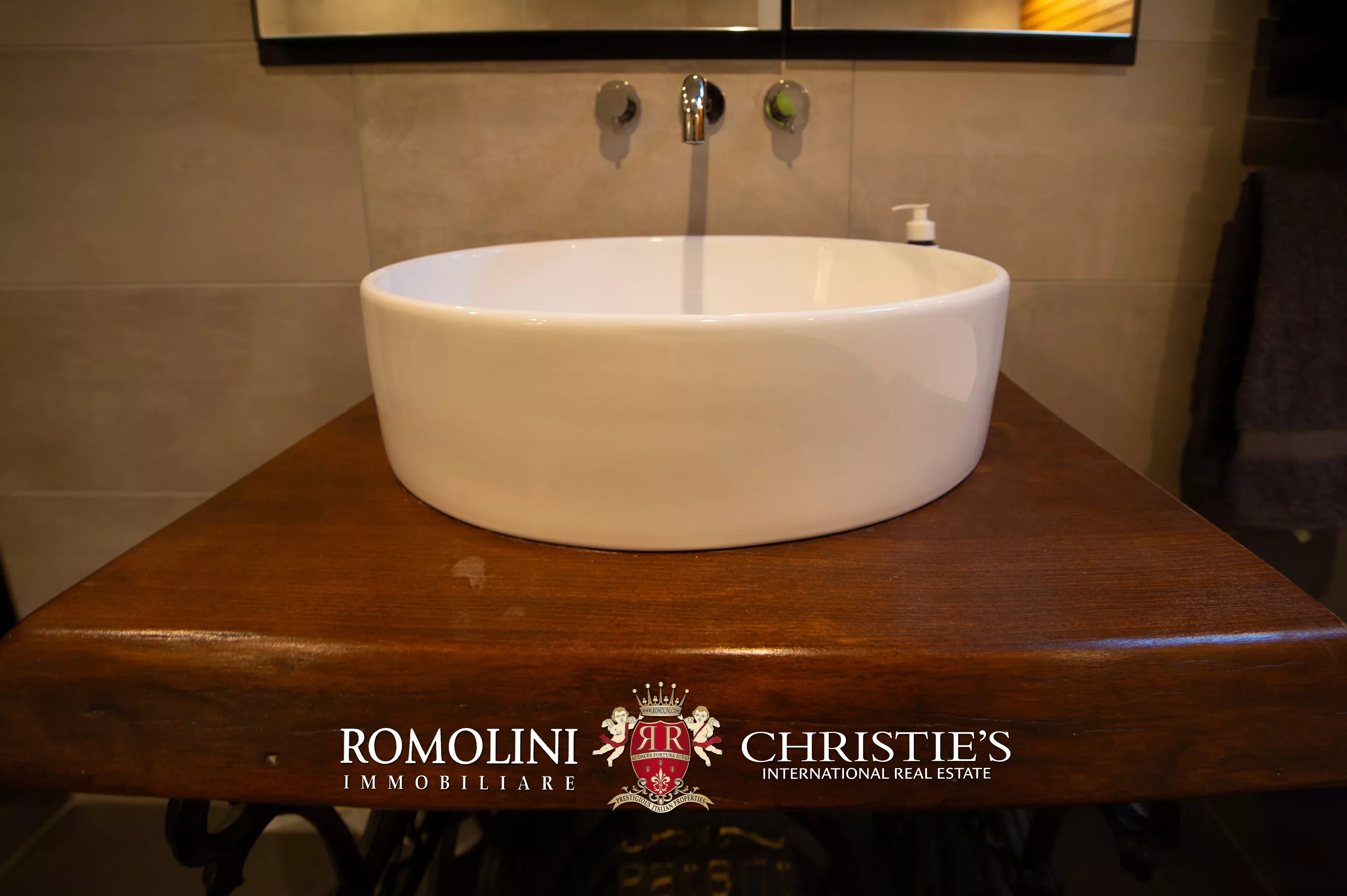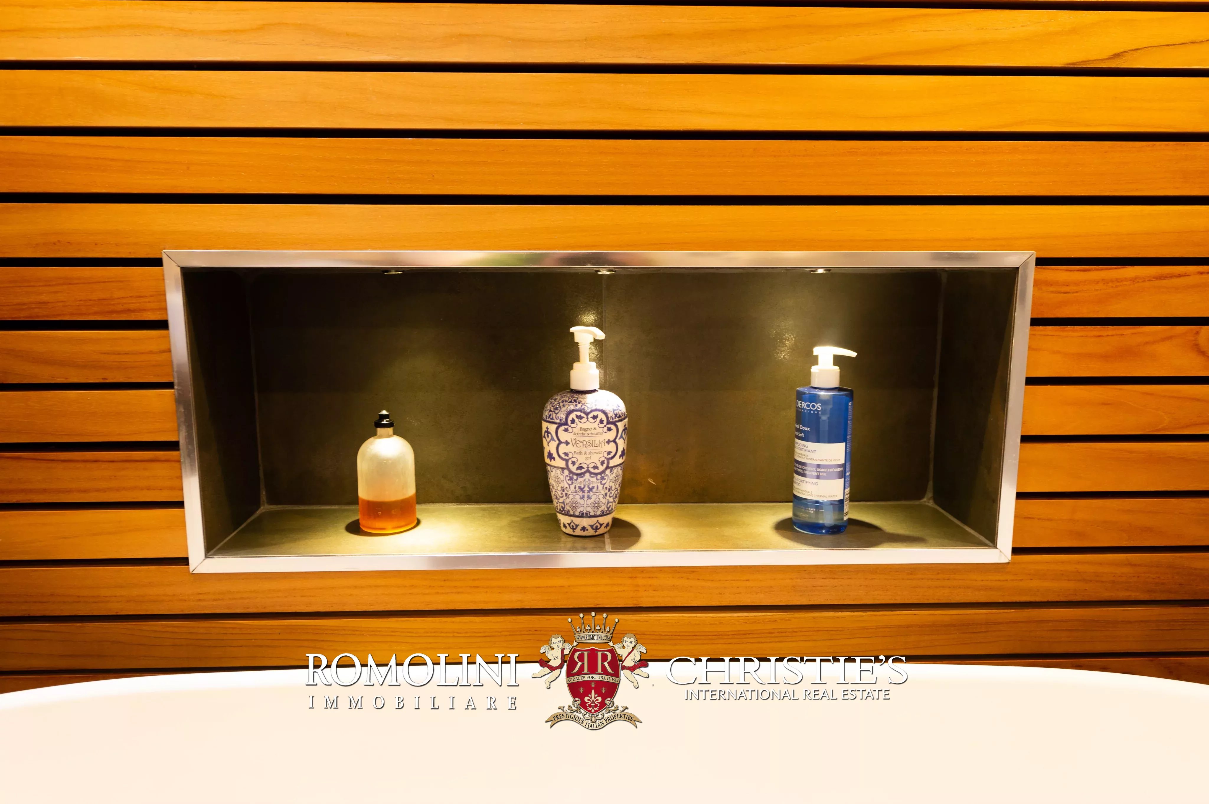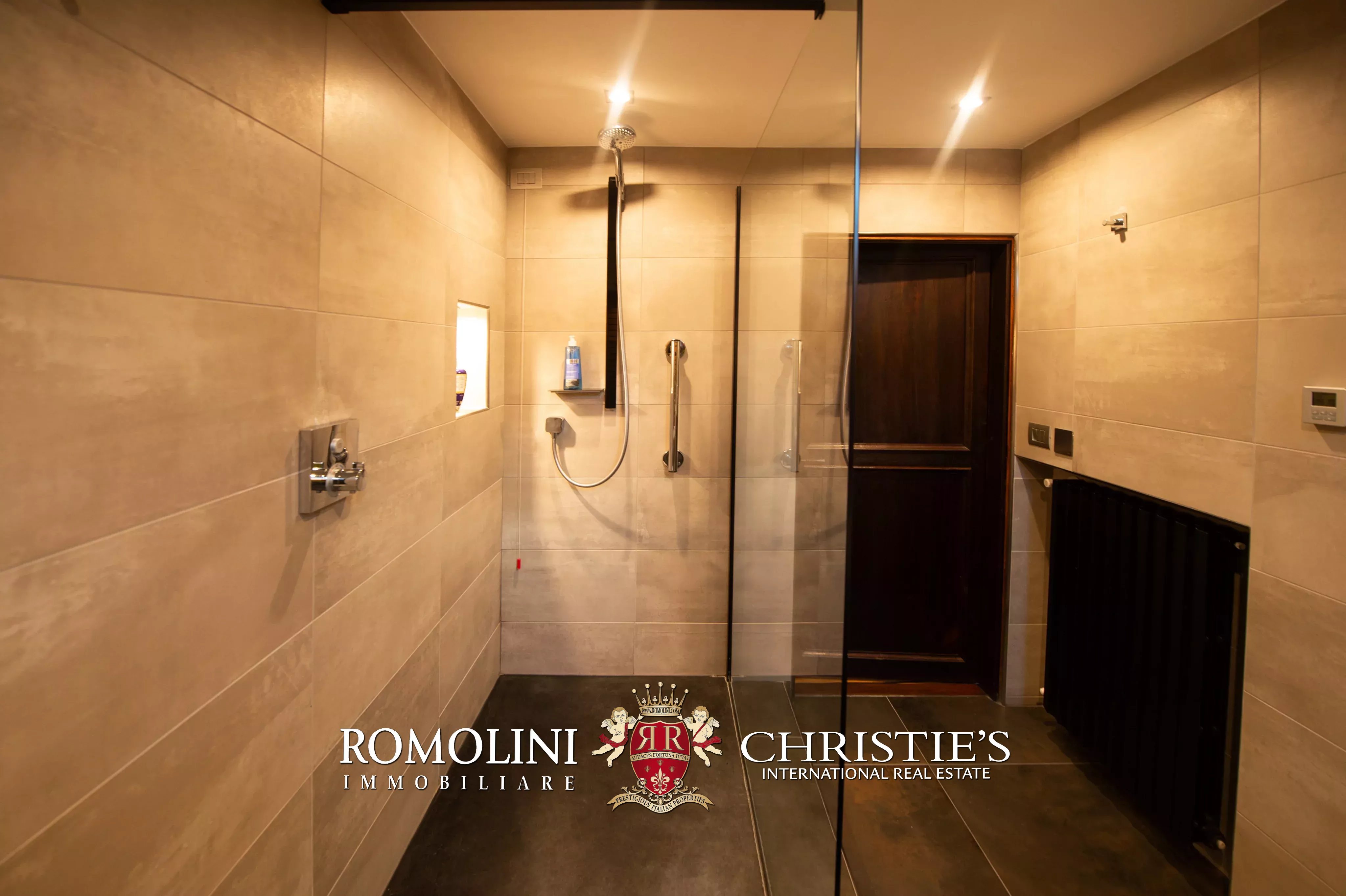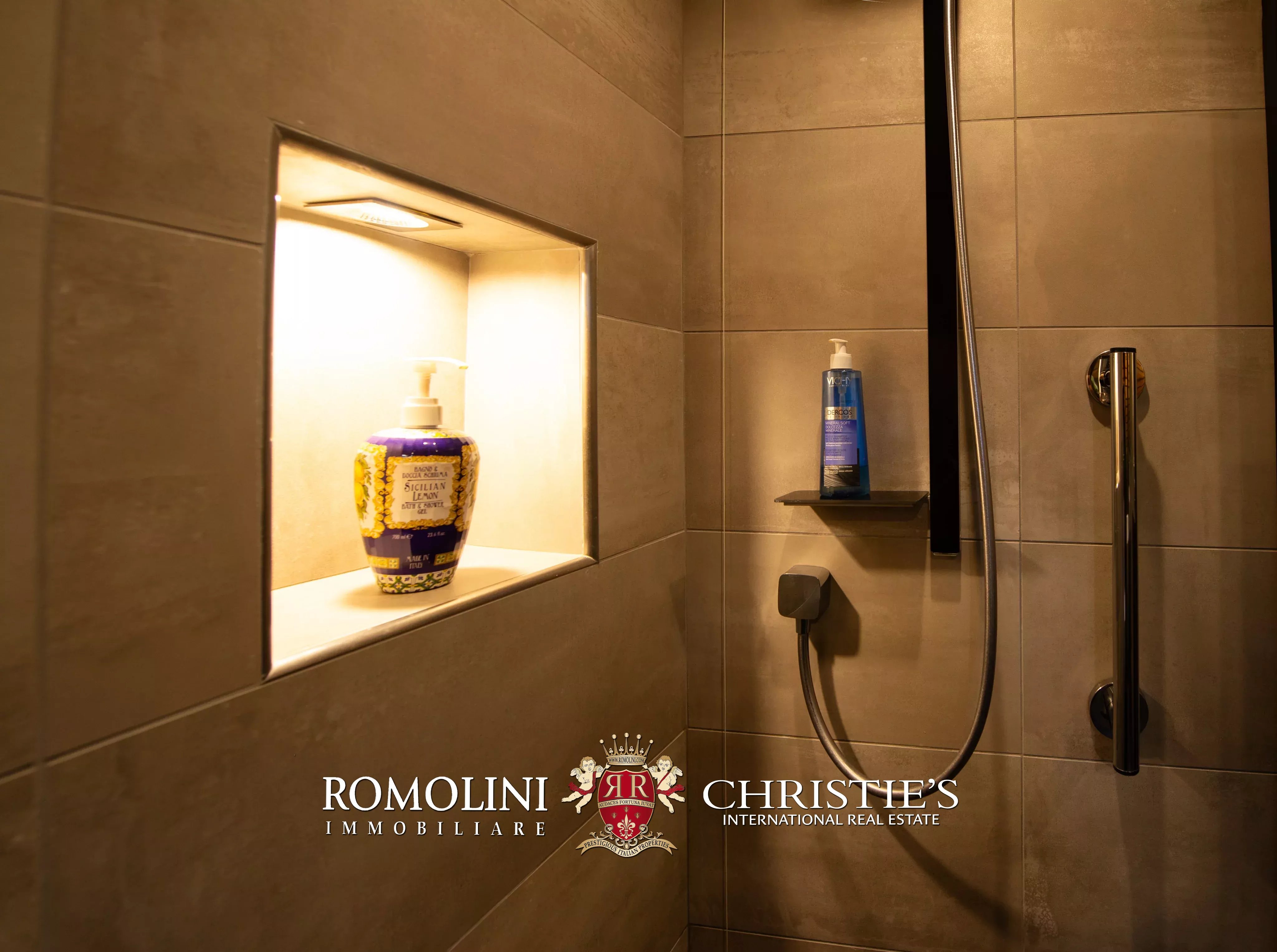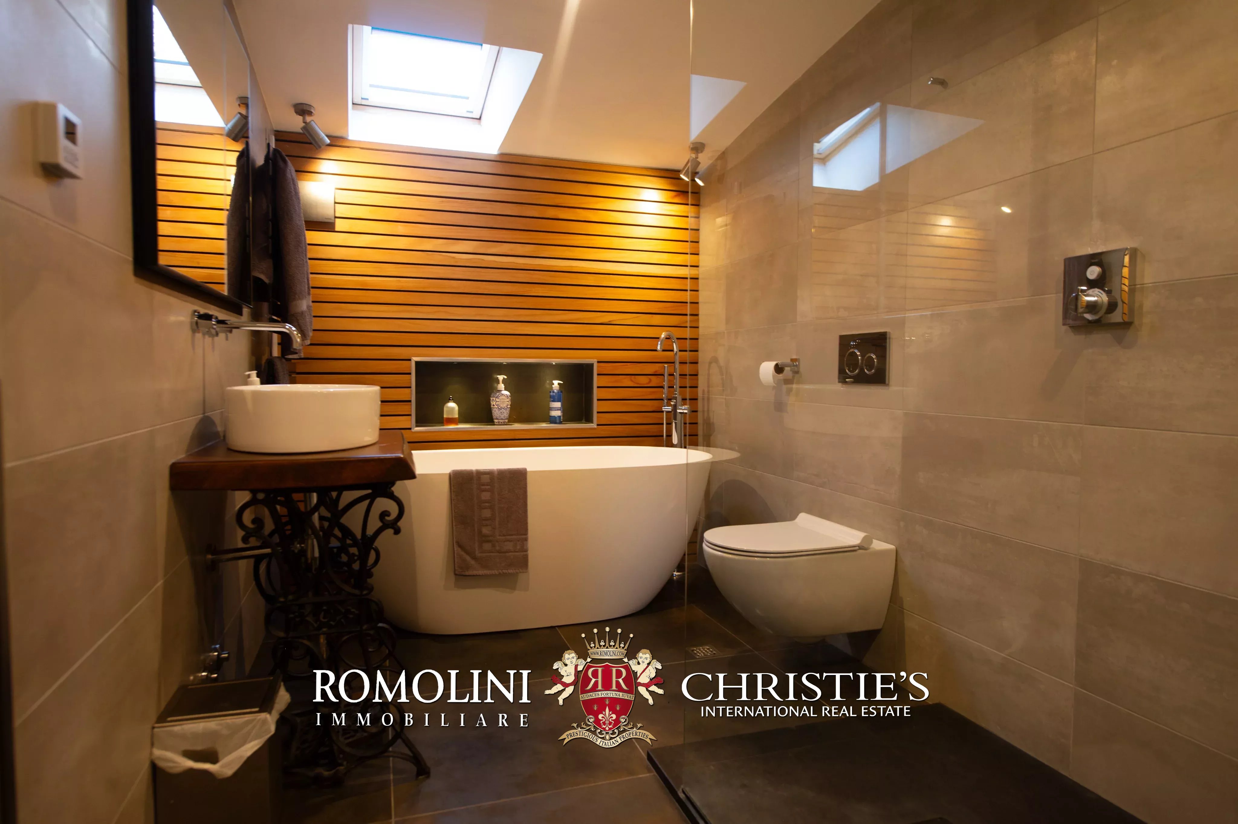 Salendo, un luminoso ingresso disimpegna l'accesso alle diverse sezioni dell'abitazione permettendo riservatezza alla zona notte rispetto a quella giorno, pur condividendo con essa la bella stanza da bagno appena rinnovata. Quest’ultima, illuminata da lucernaio apribile elettricamente, è dotata di una modernissima doccia in cristallo a vista e vasca da bagno simmetricamente centrata sulla parete di fondo in legno.