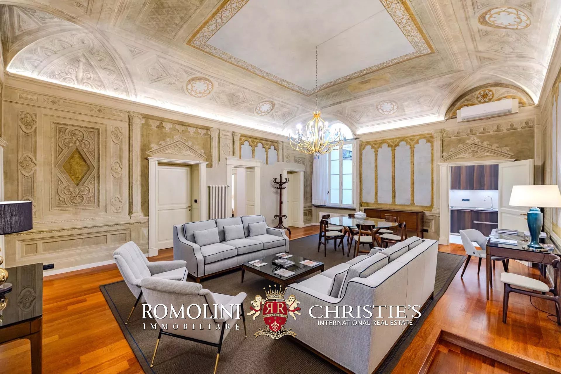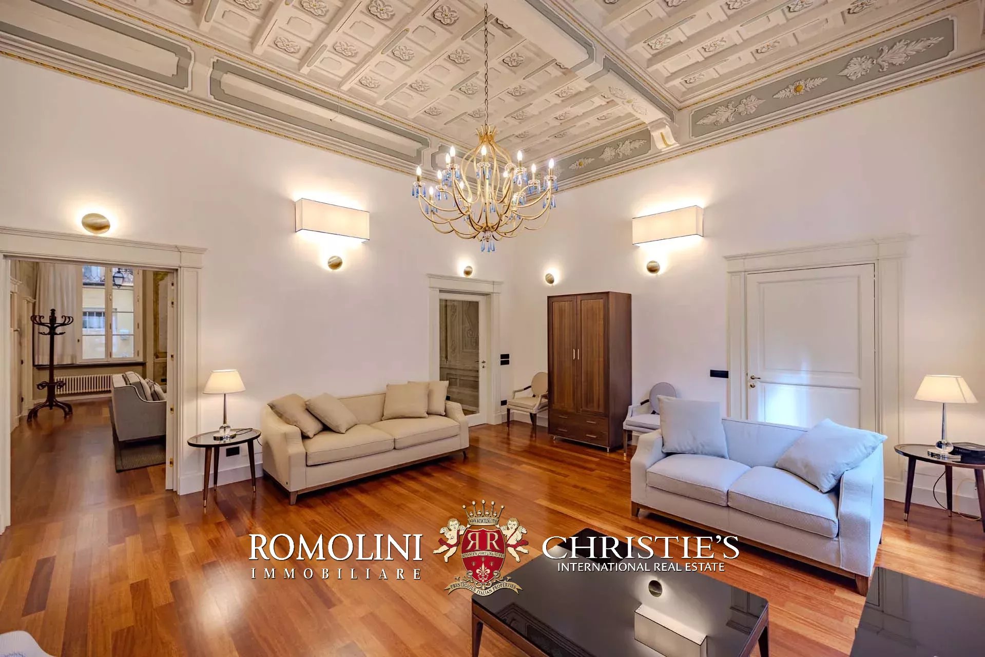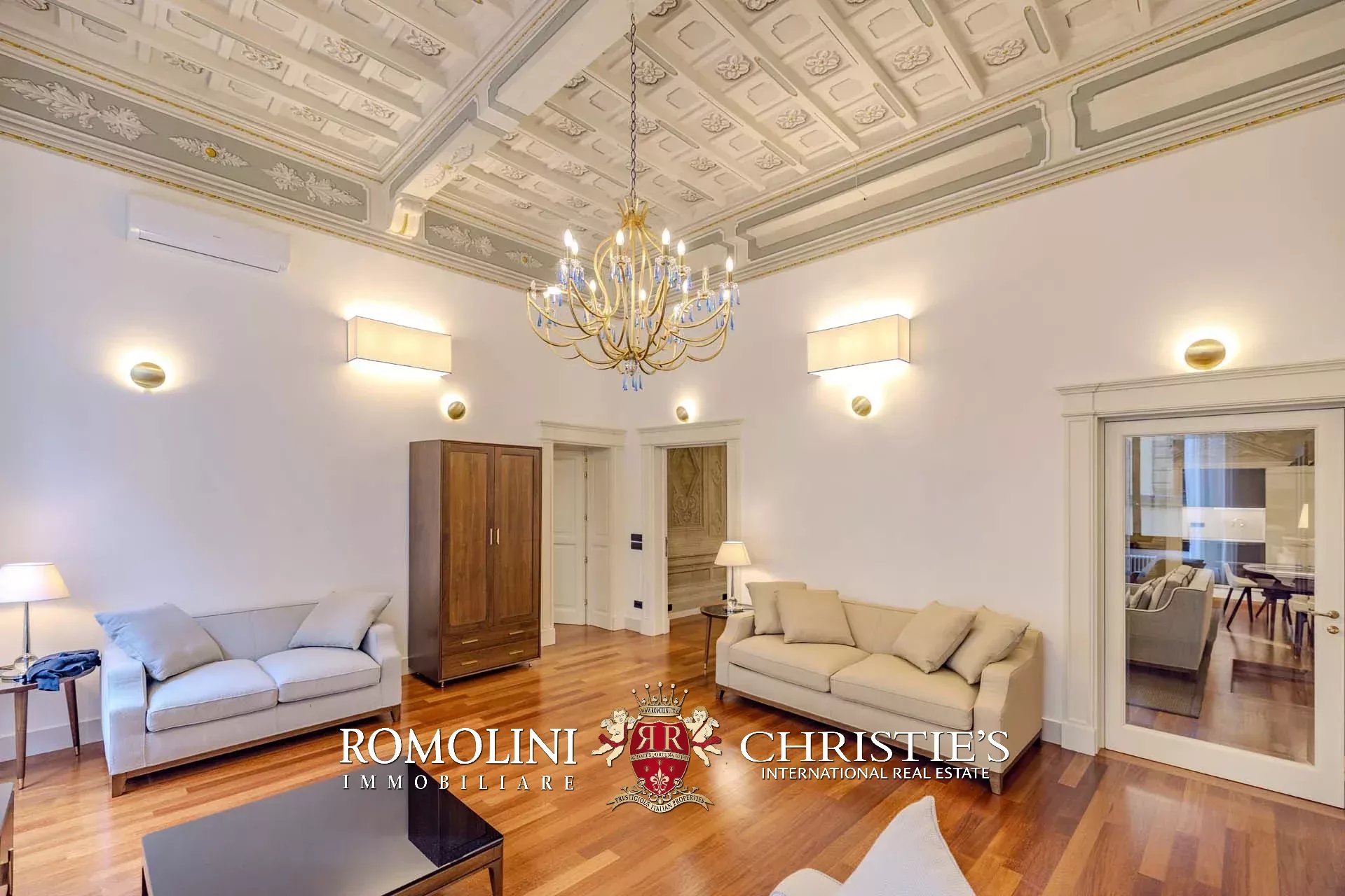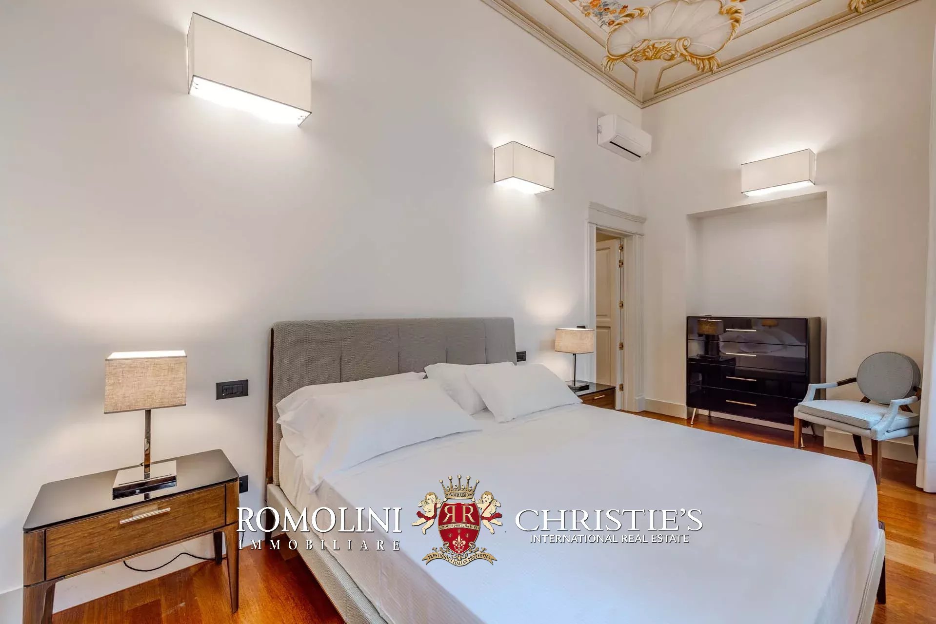 I pavimenti dell’appartamento sono invece coperti in parquet massello, tanto nella zona giorno che nella zona notte. Nelle altre sale si trovano soffitti a volta dipinti, travi in legno decorate, cassettoni dipinti con motivi floreali e decorazioni in legno. Le modanature che corrono lungo parte dei saloni fungono anche da supporto per un sistema di faretti led. L’impianto di aria condizionata copre tutti gli ambienti, così come la connessione wifi.