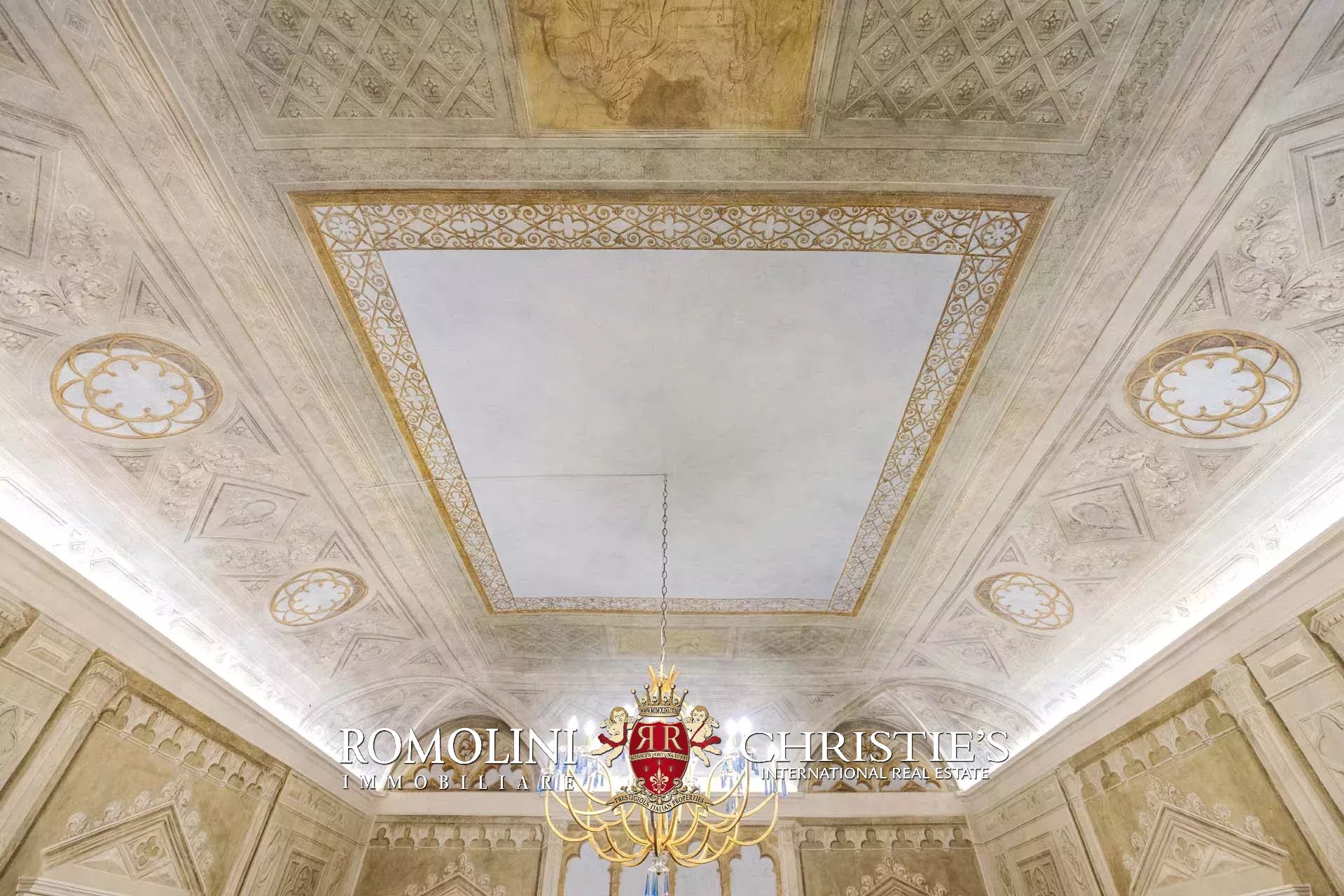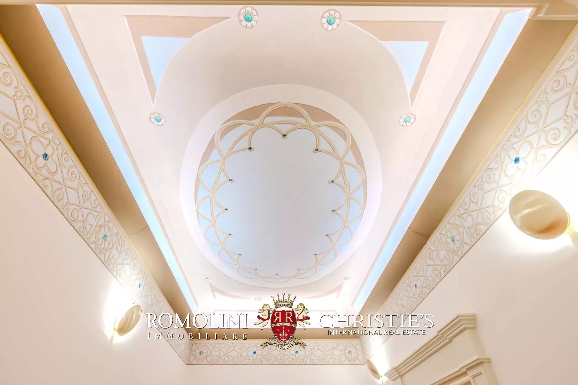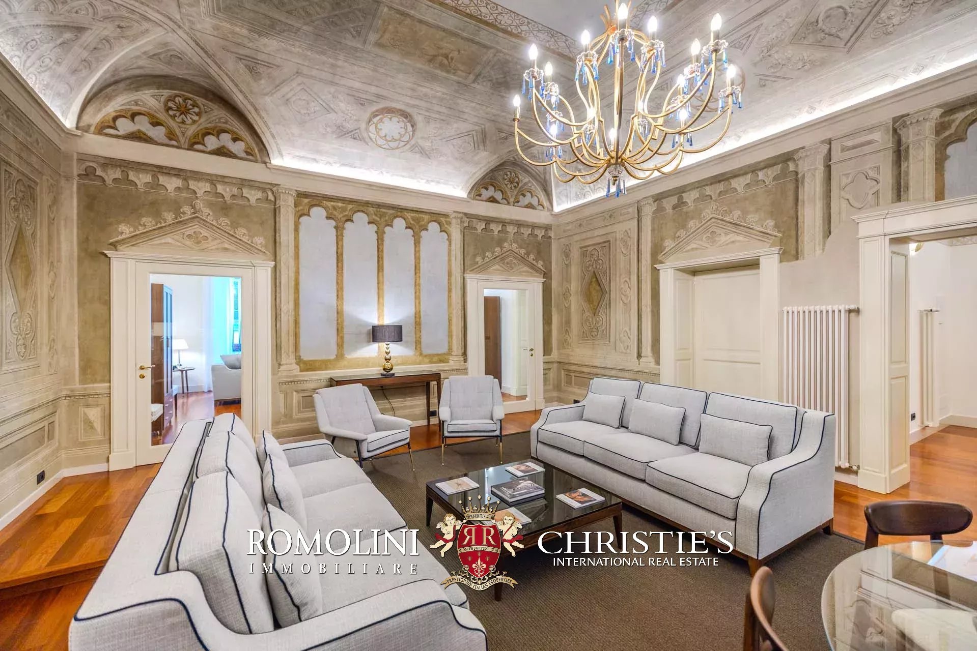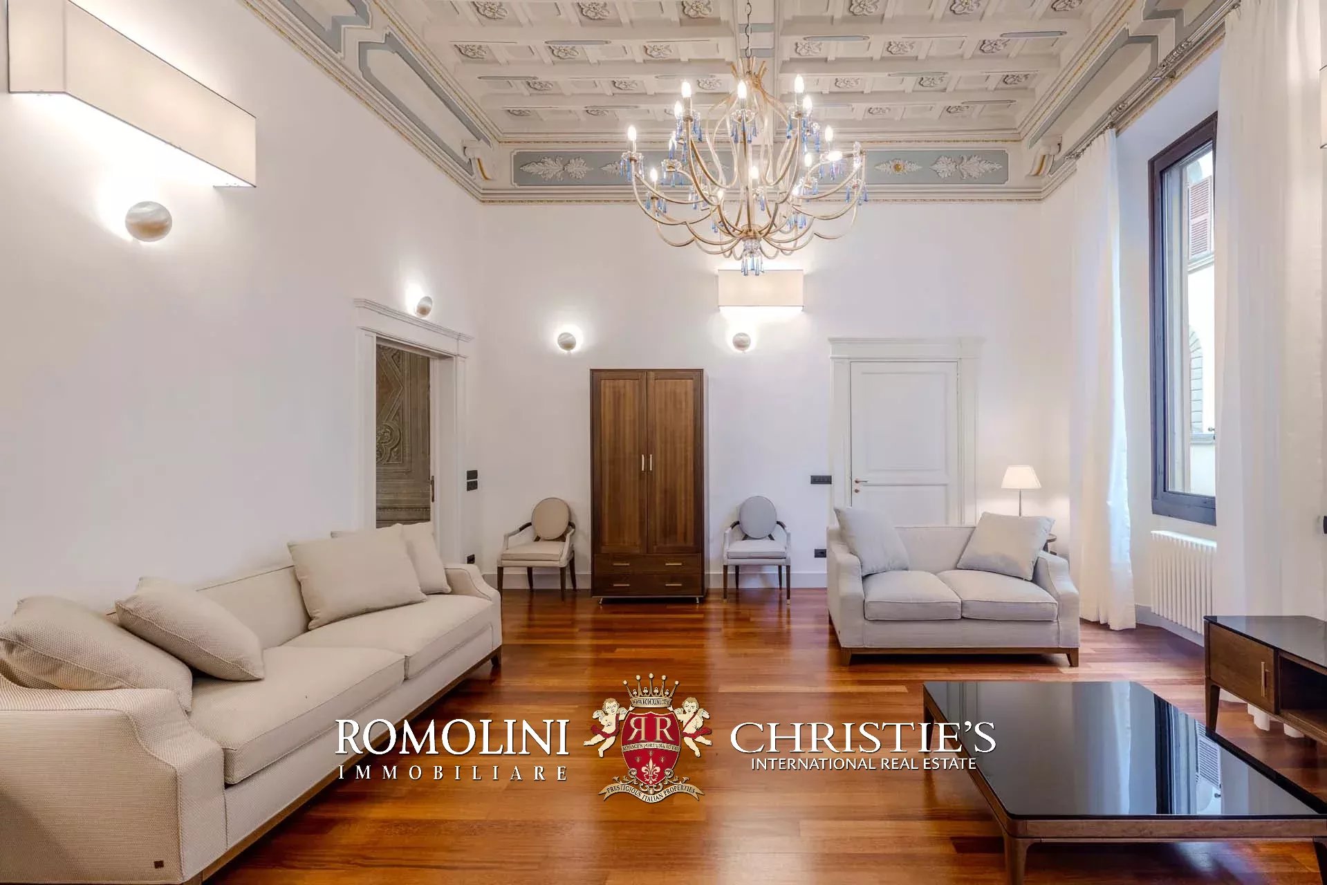 I pavimenti dell’appartamento sono invece coperti in parquet massello, tanto nella zona giorno che nella zona notte. Nelle altre sale si trovano soffitti a volta dipinti, travi in legno decorate, cassettoni dipinti con motivi floreali e decorazioni in legno. Le modanature che corrono lungo parte dei saloni fungono anche da supporto per un sistema di faretti led. L’impianto di aria condizionata copre tutti gli ambienti, così come la connessione wifi.