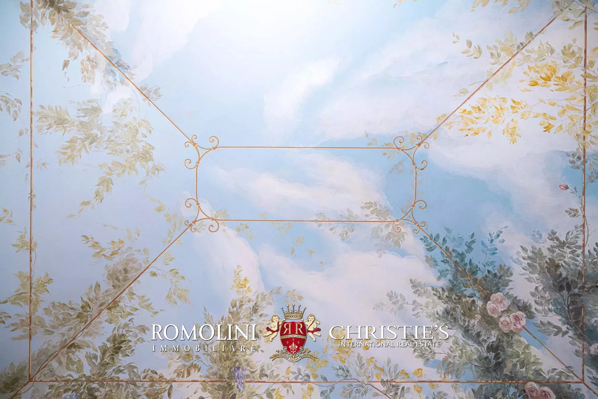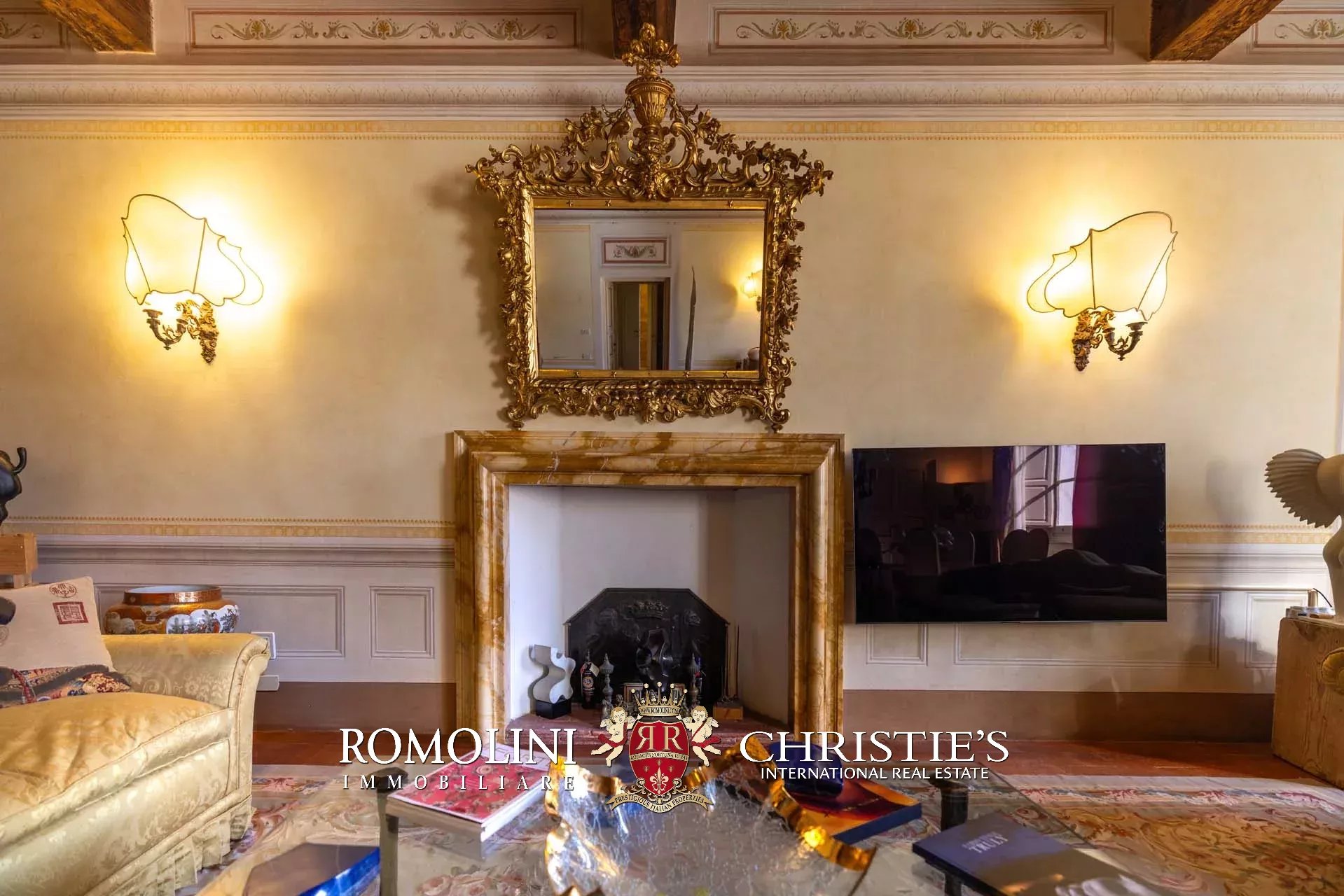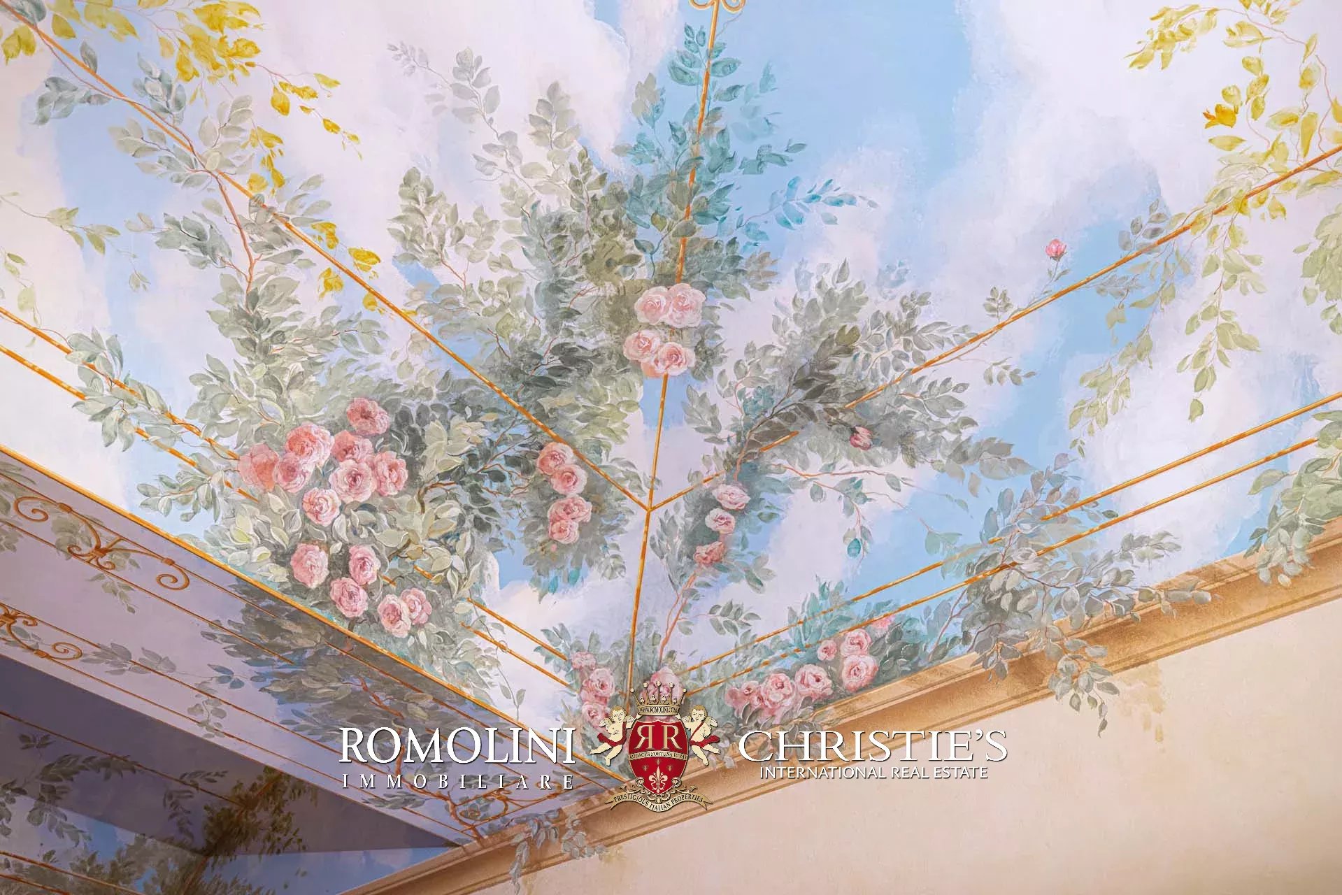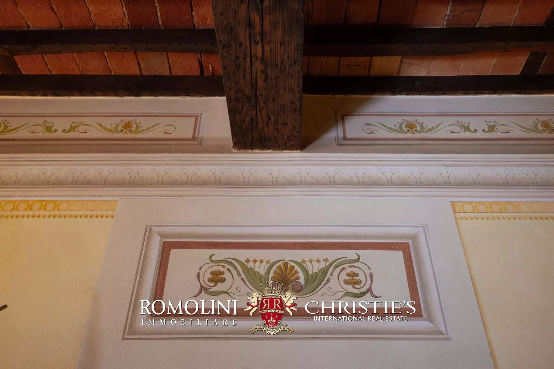 L’immobile vanta finiture di pregio che evidenziato la storia signorile dell’edificio, tutte meticolosamente restaurate e conservate in ottica di preservazione del passato. Le caratteristiche più interessanti includono i pavimenti in cotto originali, le travi in legno a supporto dei soffitti e i bellissimi camini in marmo. I bagni, anch’essi di pregio, sono rivestiti in marmo giallo e dotati di infissi pensati per armonizzarsi con il contesto storico circostante. Il grande soggiorno, cuore della proprietà, è decorato con affreschi e modanature dal gusto tipicamente Ottocentesco caratterizzate da motivi floreali e geometrici.