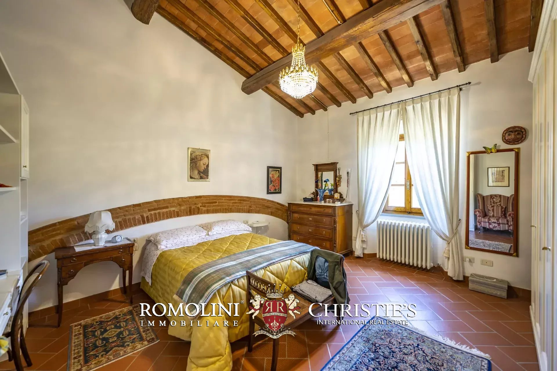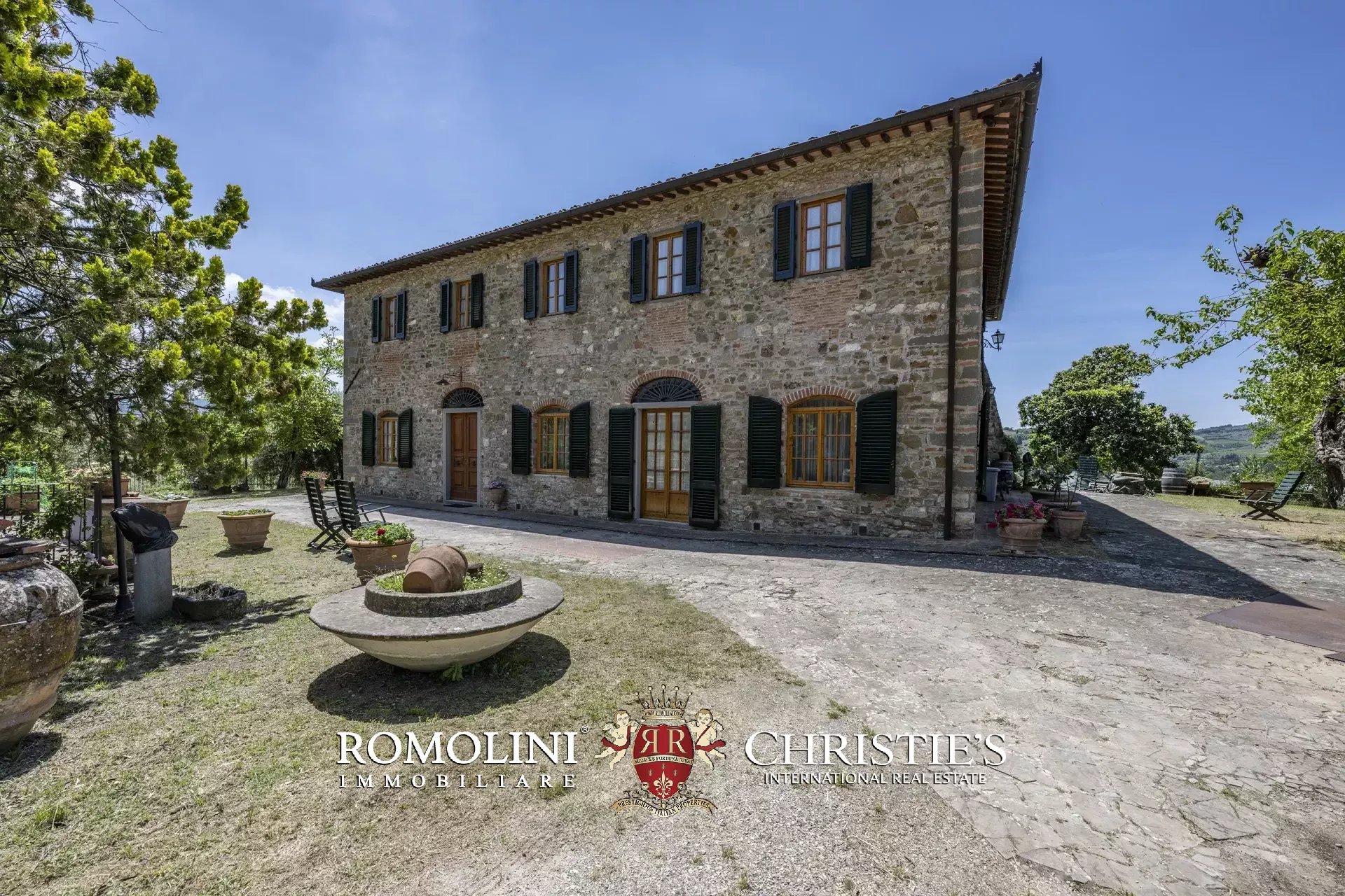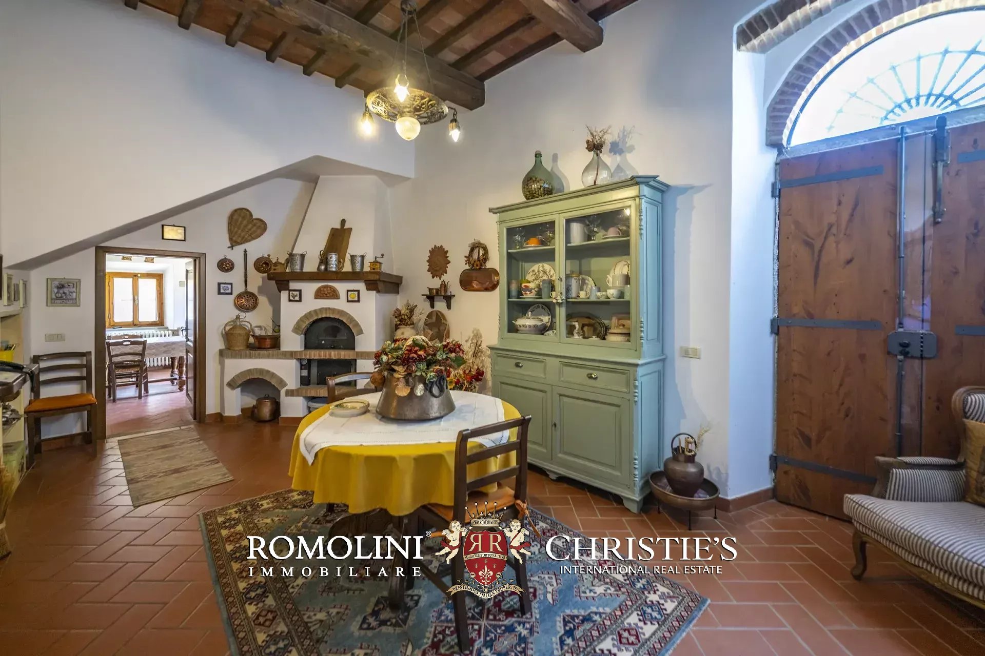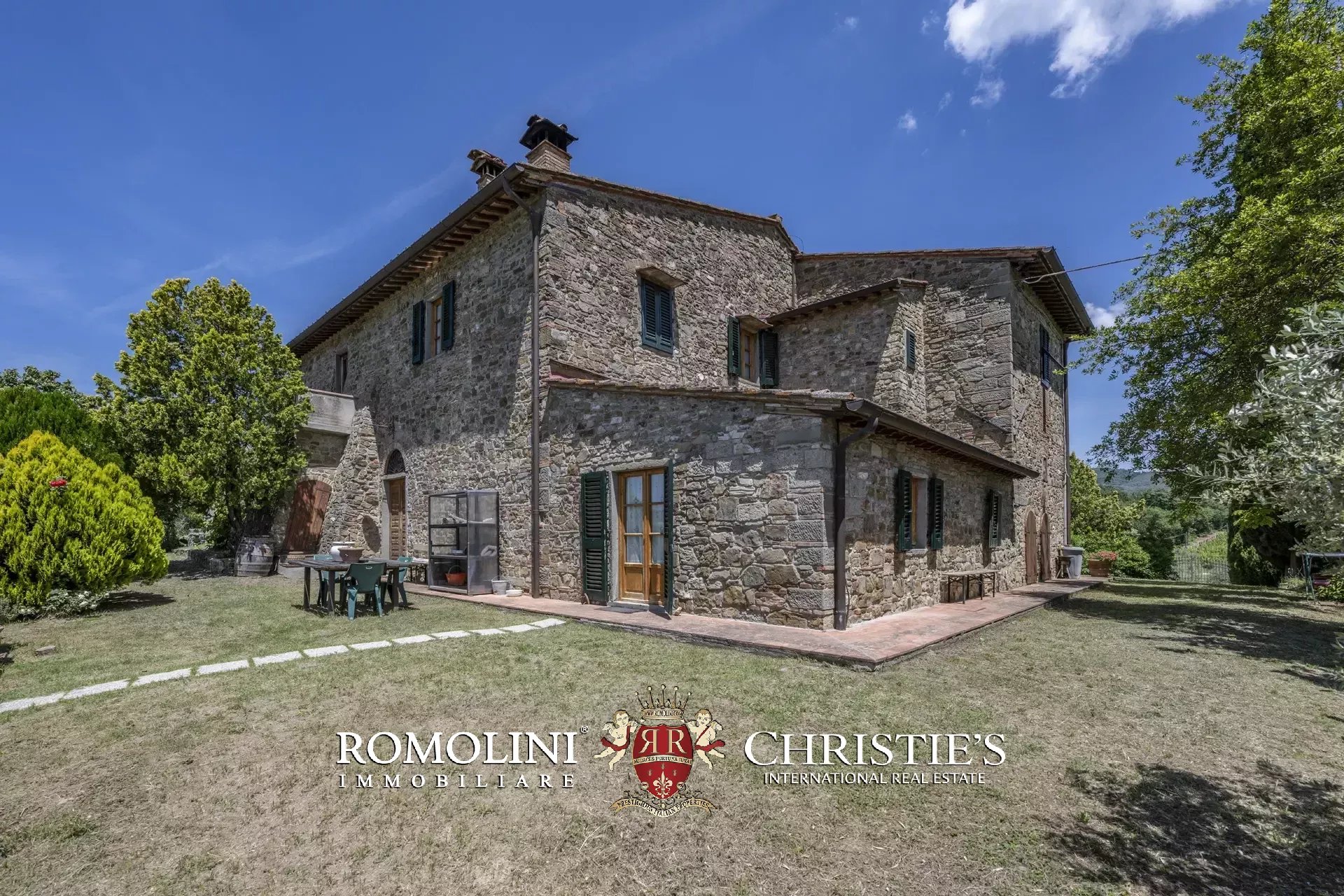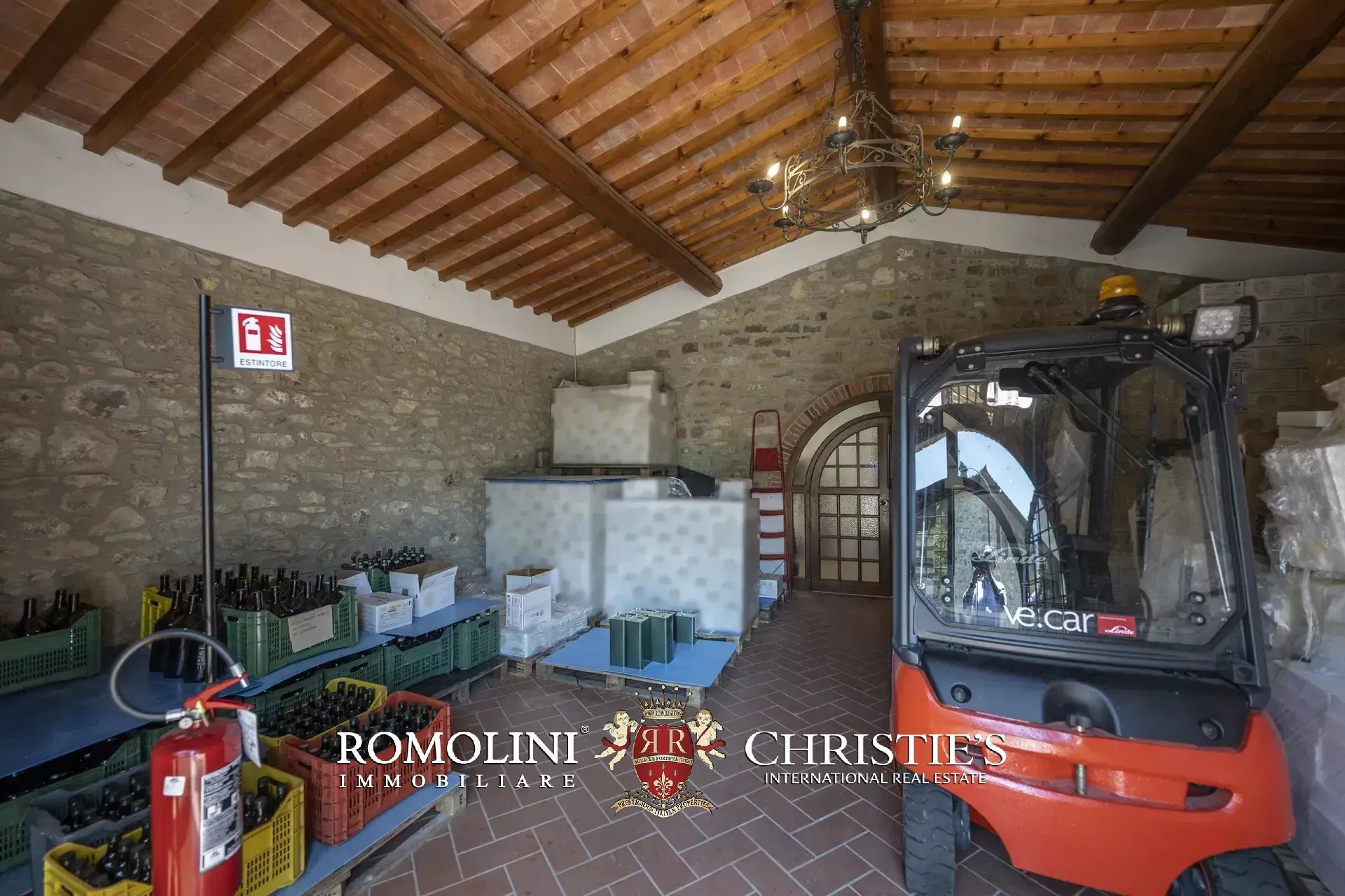 Il casale (458 m², 4 camere e 4 bagni), realizzato in pietra in tipico stile toscano, si articola su due livelli. Al piano terra si trova la zona giorno costituita da un grande soggiorno, due cucine, un salottino e un bagno di servizio oltre a due locali cantina, uno dei quali molto affascinante con soffitto a volta. Salendo al piano superiore si arriva invece alla zona notte costituita da quattro camere e tre bagni, oltre a una cucina di servizio con accesso indipendente e uno studio.