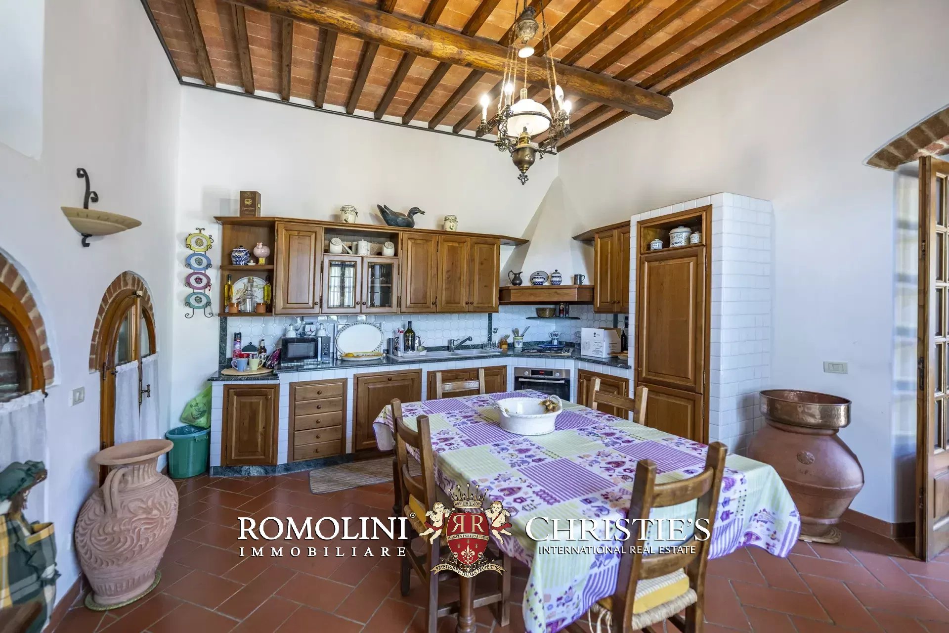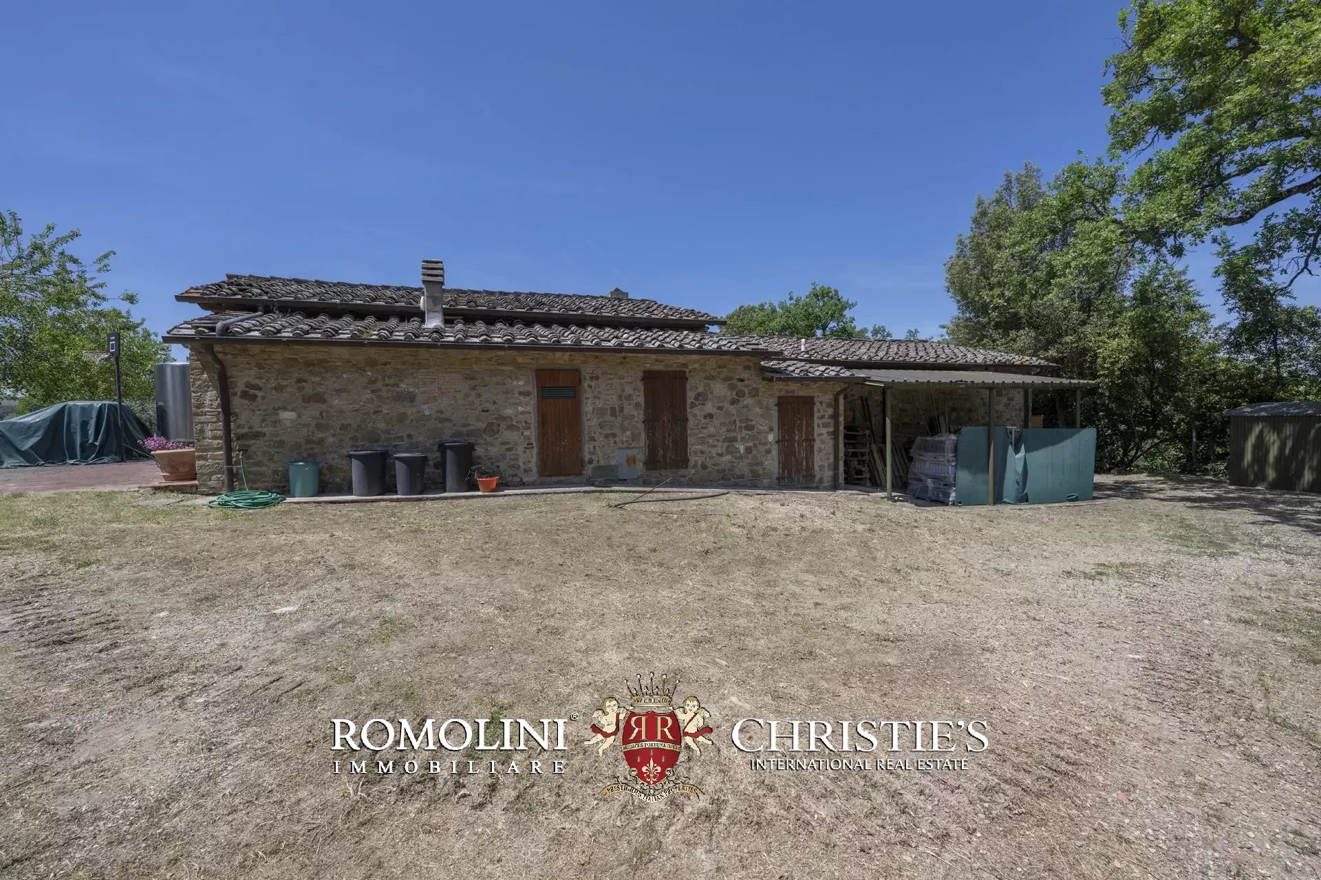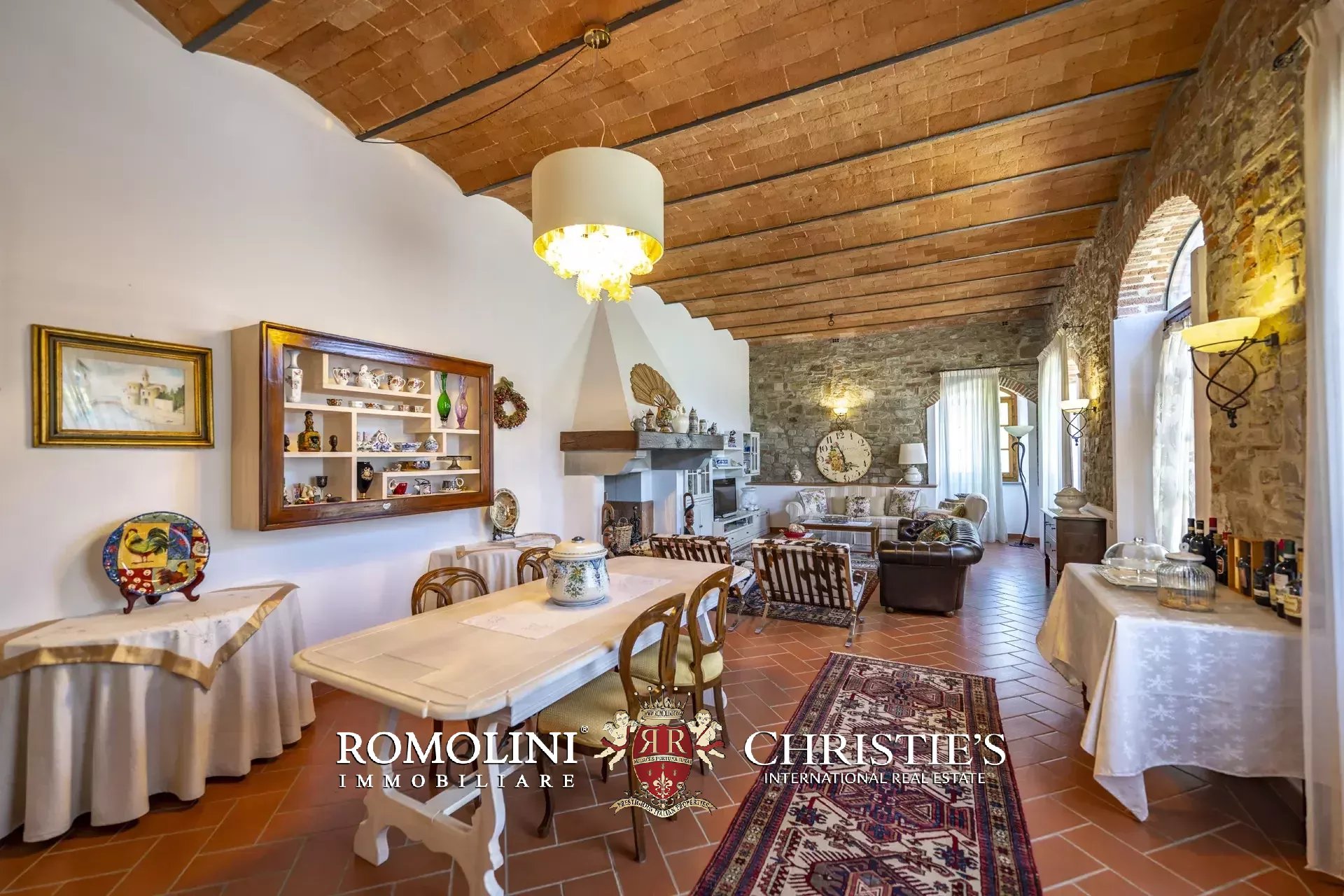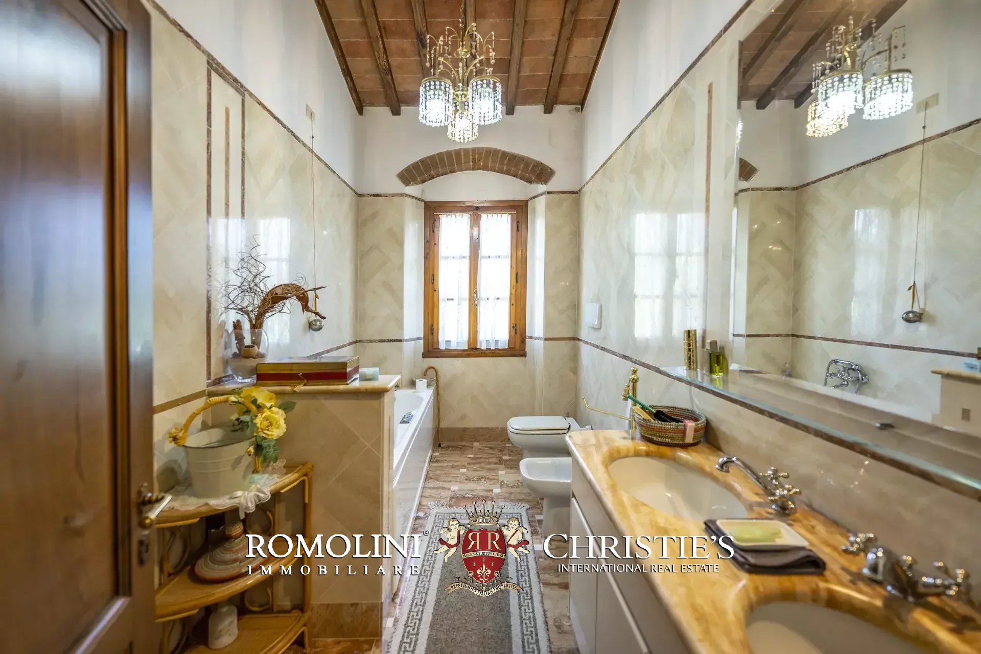 Il casale (458 m², 4 camere e 4 bagni), realizzato in pietra in tipico stile toscano, si articola su due livelli. Al piano terra si trova la zona giorno costituita da un grande soggiorno, due cucine, un salottino e un bagno di servizio oltre a due locali cantina, uno dei quali molto affascinante con soffitto a volta. Salendo al piano superiore si arriva invece alla zona notte costituita da quattro camere e tre bagni, oltre a una cucina di servizio con accesso indipendente e uno studio.
