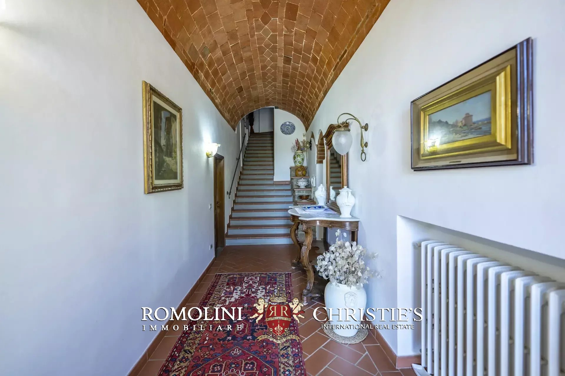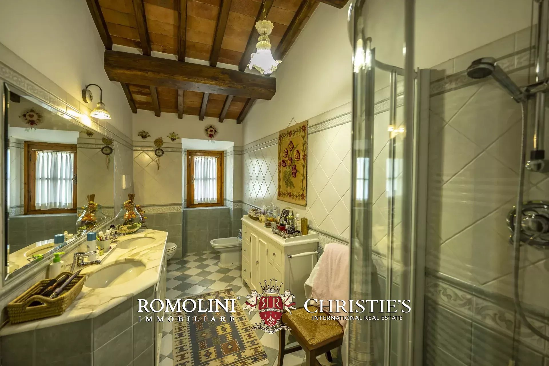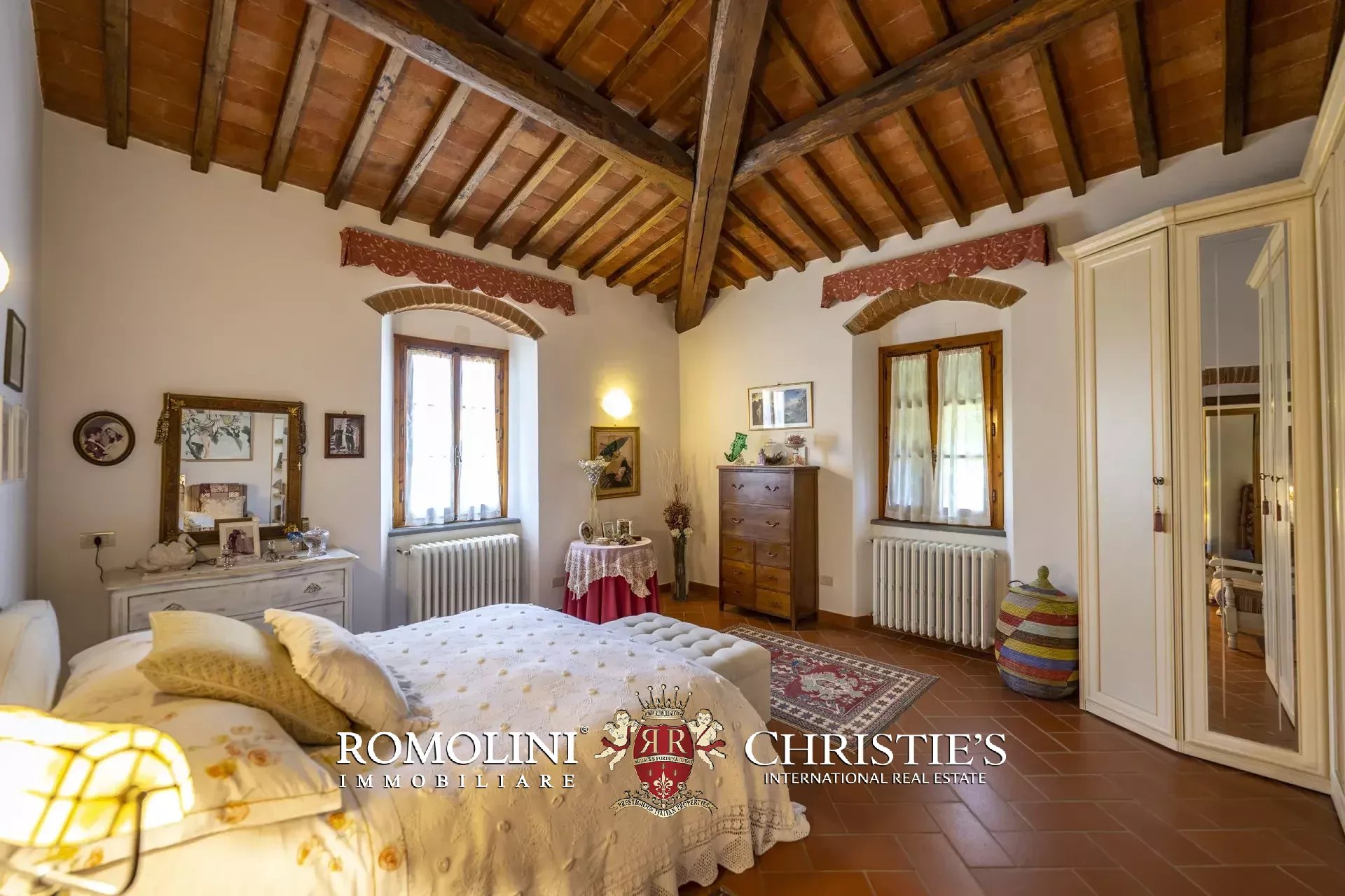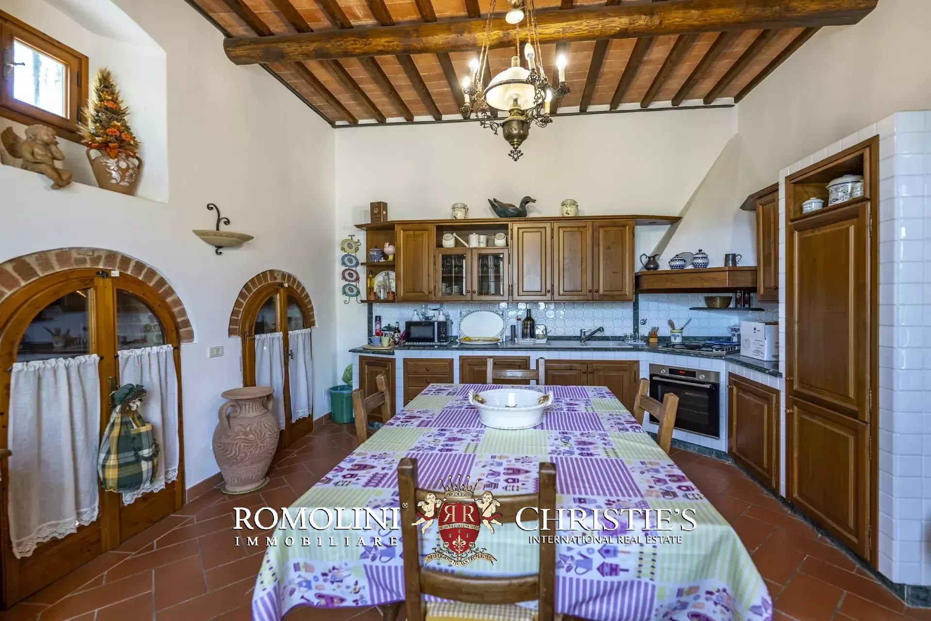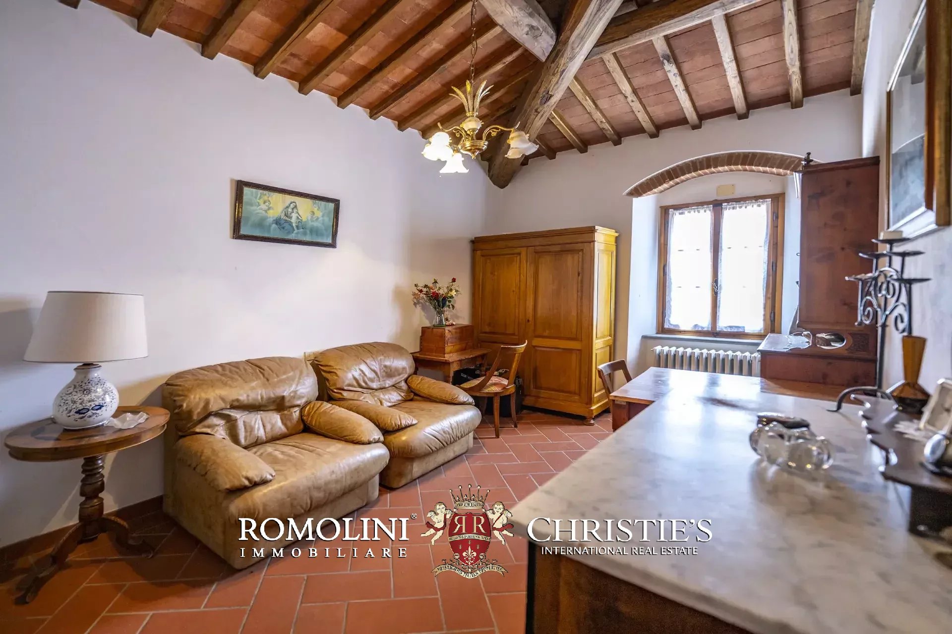 Il casale (458 m², 4 camere e 4 bagni), realizzato in pietra in tipico stile toscano, si articola su due livelli. Al piano terra si trova la zona giorno costituita da un grande soggiorno, due cucine, un salottino e un bagno di servizio oltre a due locali cantina, uno dei quali molto affascinante con soffitto a volta. Salendo al piano superiore si arriva invece alla zona notte costituita da quattro camere e tre bagni, oltre a una cucina di servizio con accesso indipendente e uno studio.