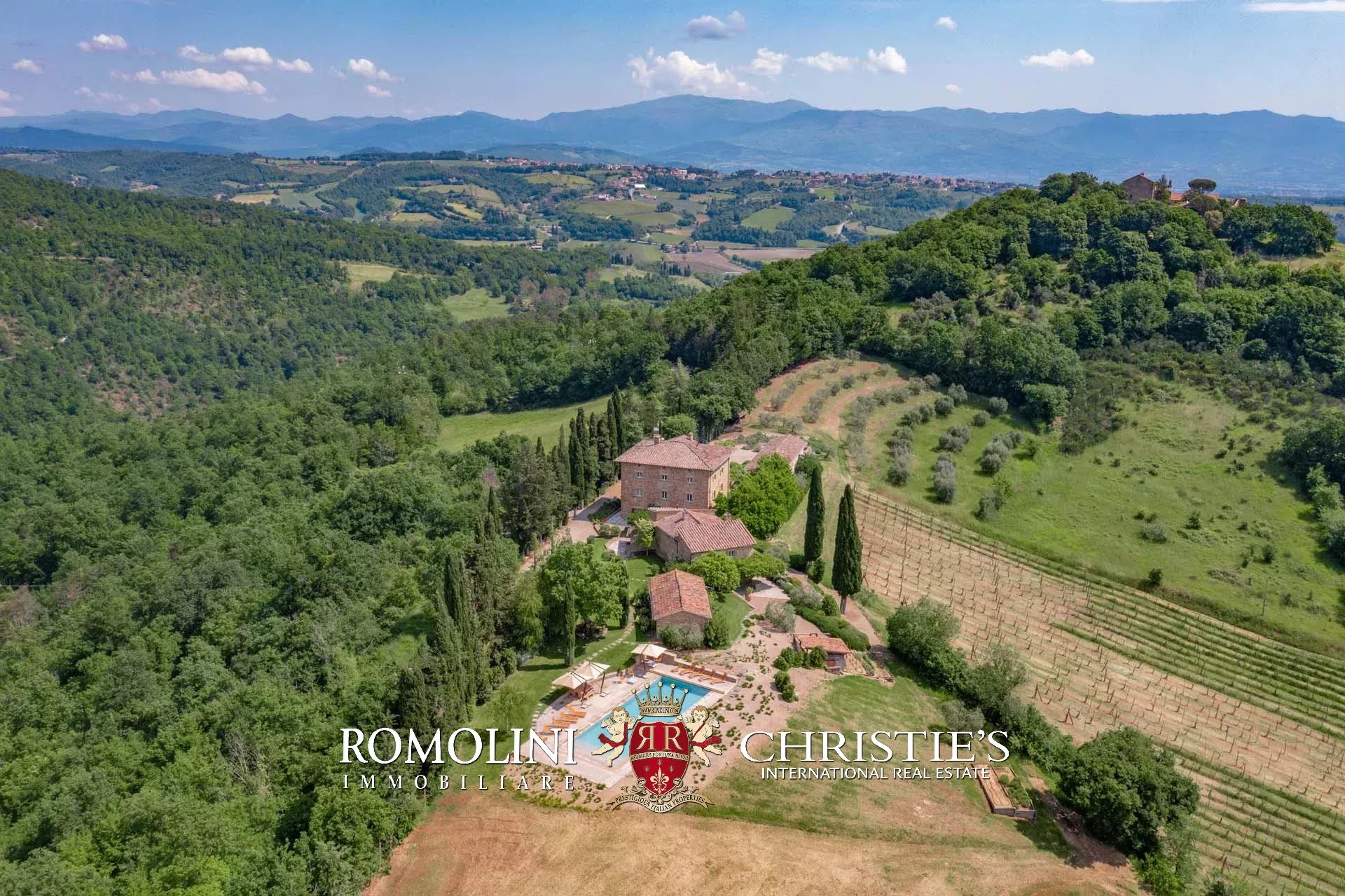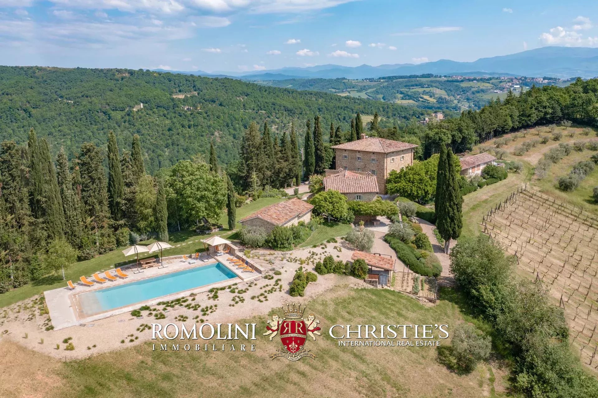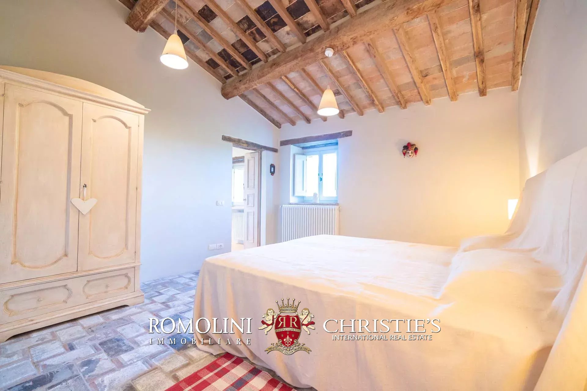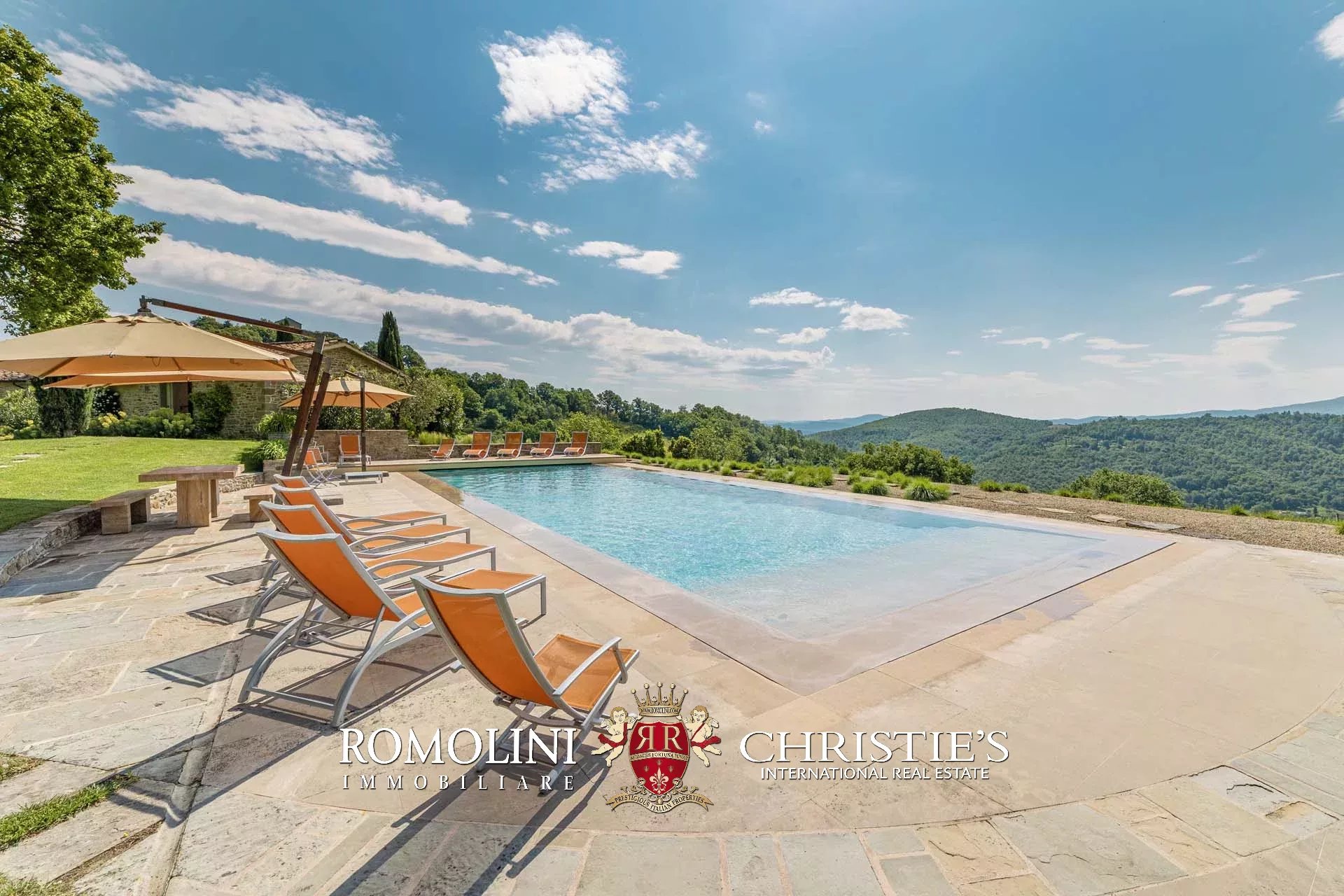 A pochi chilometri dal borgo medievale di Anghiari, in posizione panoramica, piccolo borgo con villa padronale in vendita. La proprietà (oltre 1.000 m² in totale) si compone di cinque edifici (con 9 camere totali) che includono due dependance, una pool house con palestra e una grande sala giochi molto adatta anche per eventi. All’esterno la proprietà copre un totale di 25,5 ettari che includono un piccolo vigneto e circa 300 piante di ulivo.