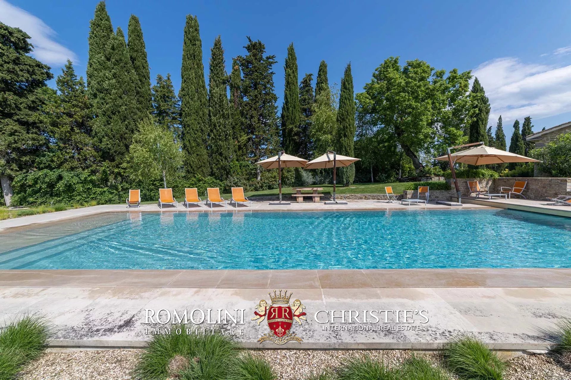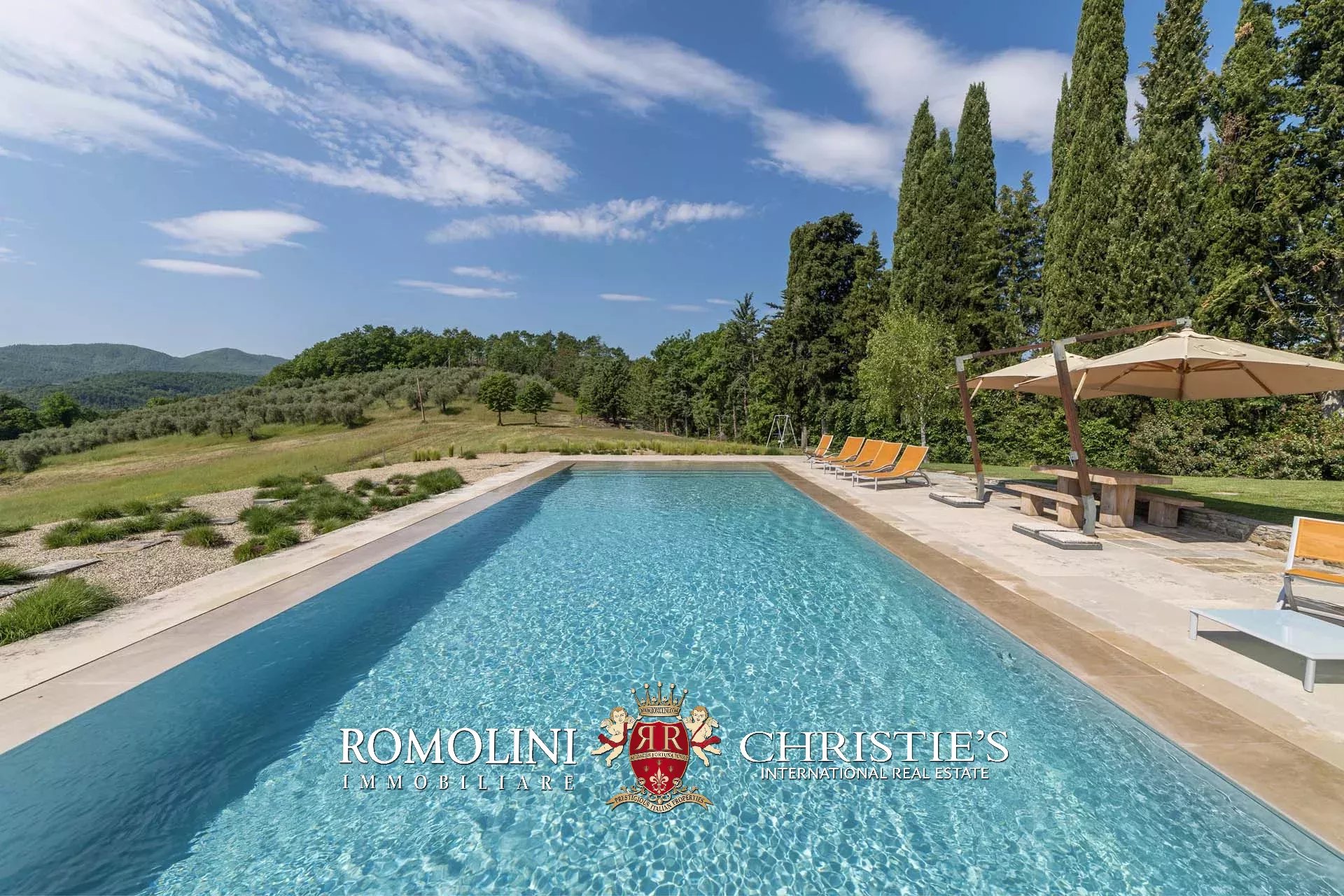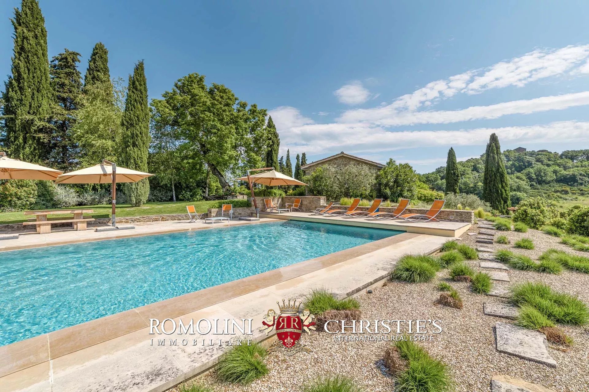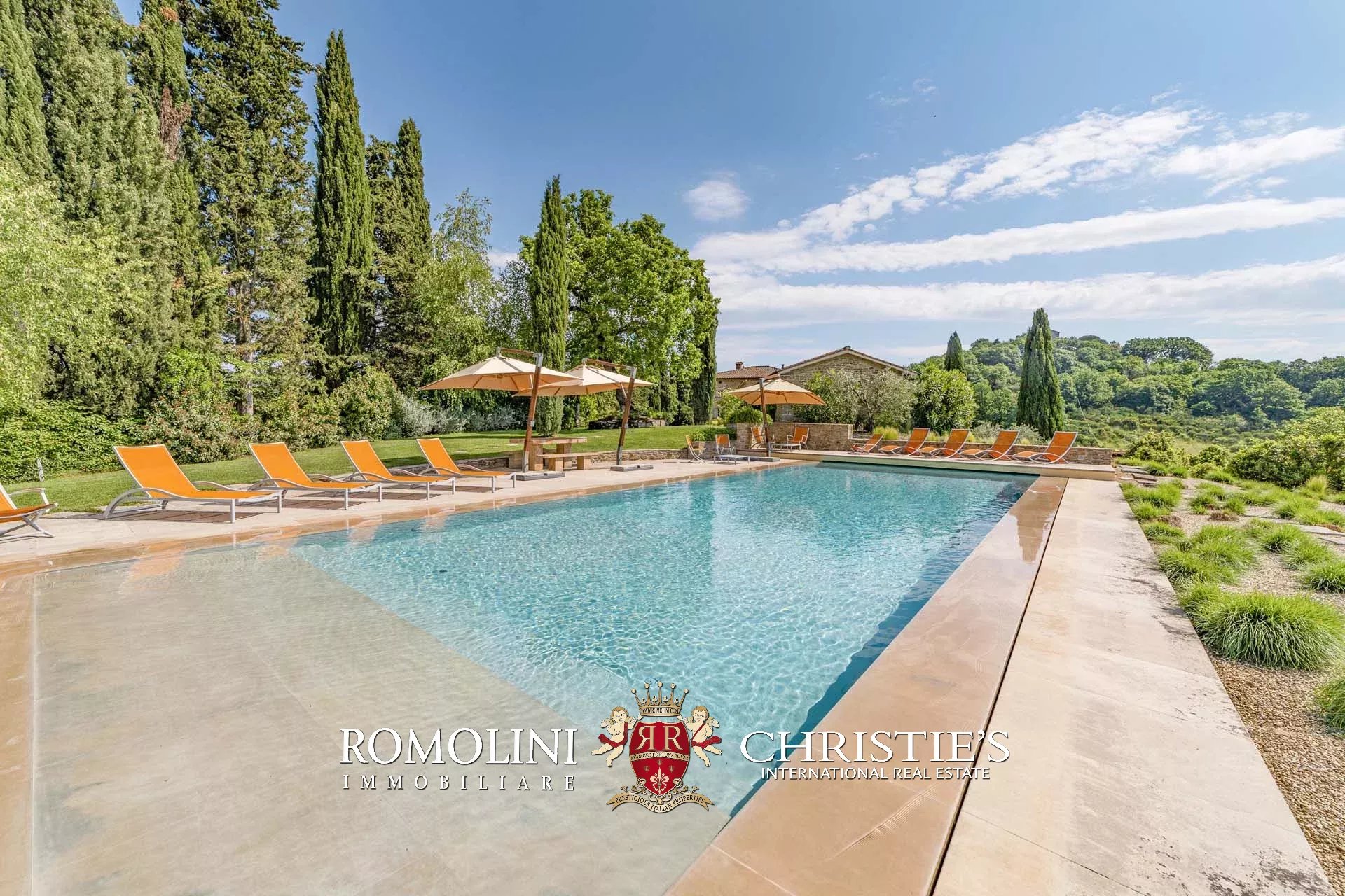 Oltre la pool house si trova infine la piscina 17 × 6 m, posta in un angolo panoramico della proprietà con vista aperta sulle colline circostanti. Il solarium in pietra che circonda la vasca è dotato di tendoni ombreggianti che forniscono un ottimo riparo dal sole in estate e assicurano un posto per cene e apertivi a bordo piscina.