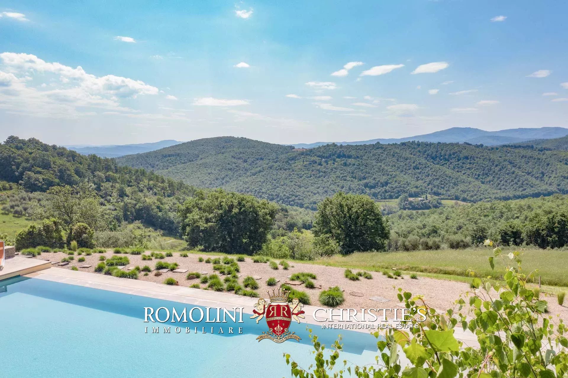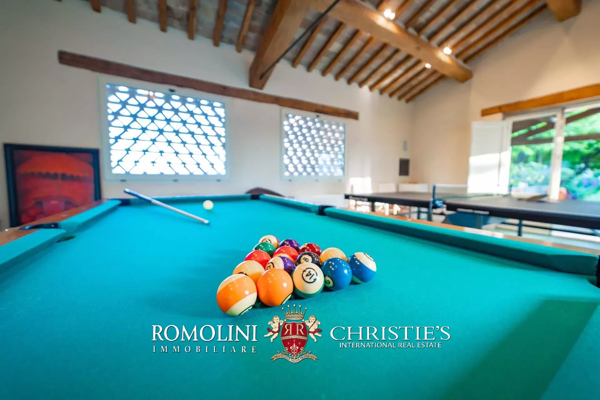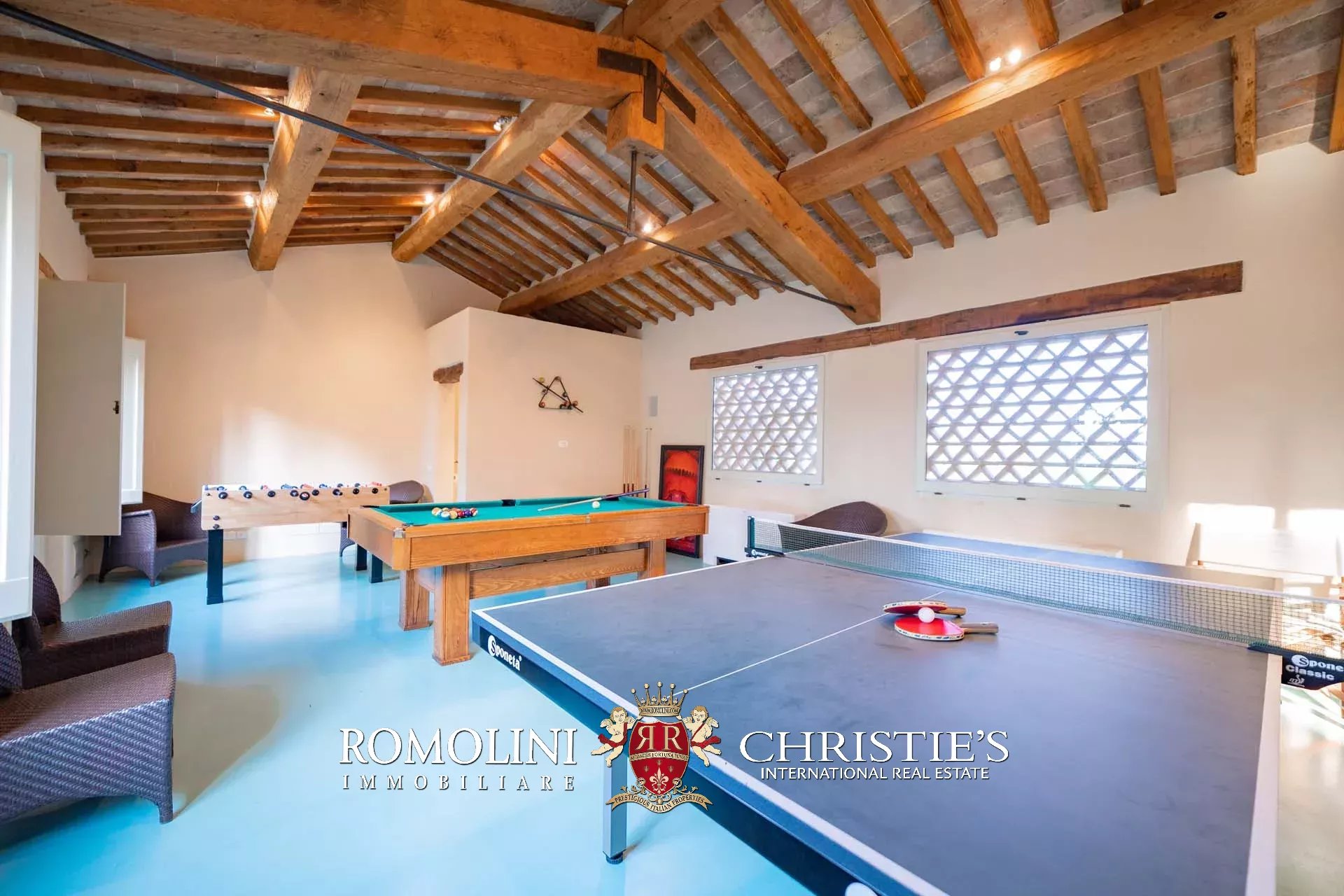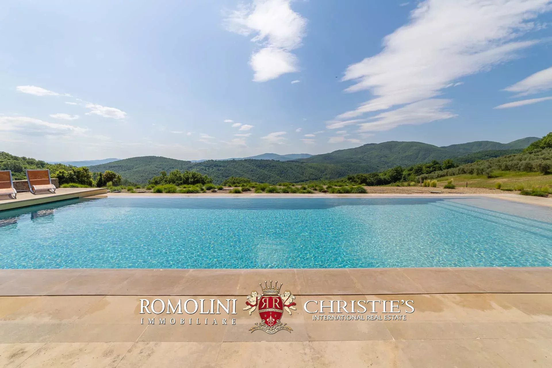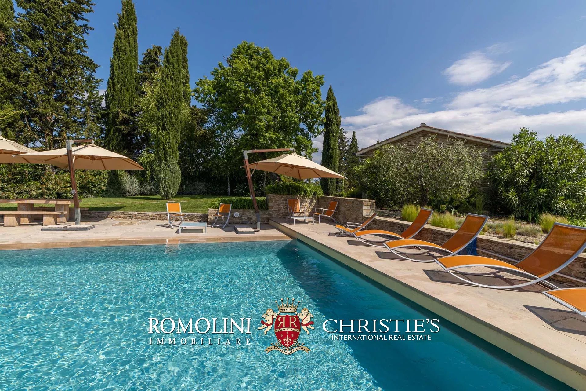 Oltre la pool house si trova infine la piscina 17 × 6 m, posta in un angolo panoramico della proprietà con vista aperta sulle colline circostanti. Il solarium in pietra che circonda la vasca è dotato di tendoni ombreggianti che forniscono un ottimo riparo dal sole in estate e assicurano un posto per cene e apertivi a bordo piscina.