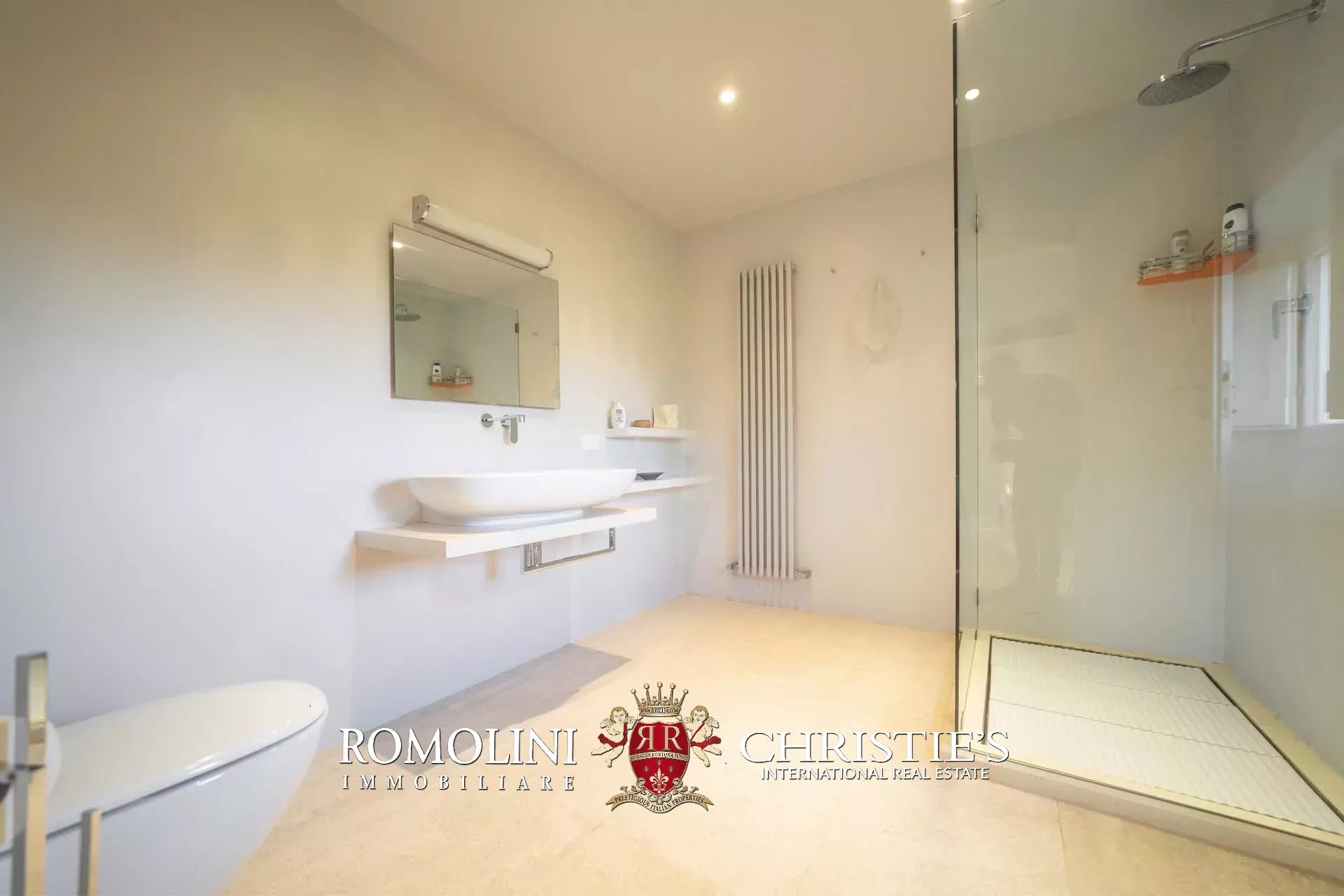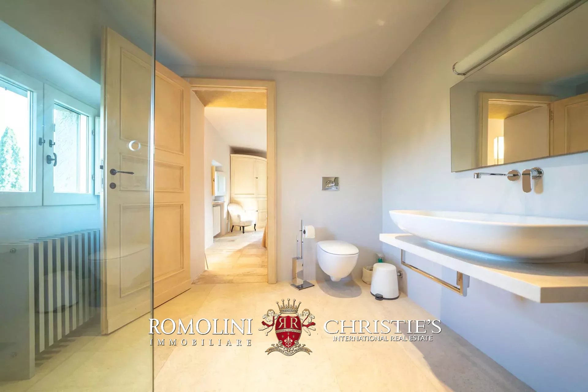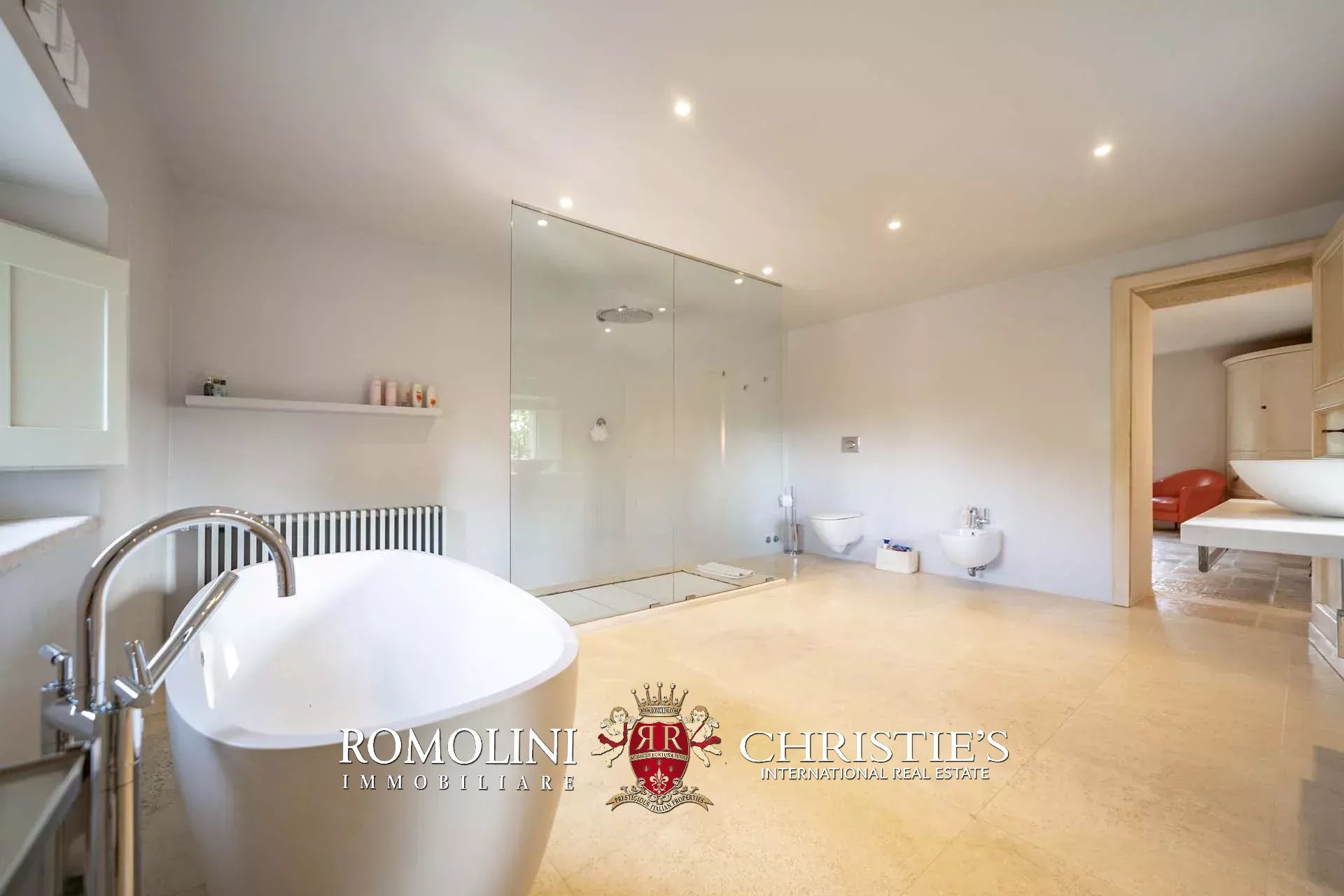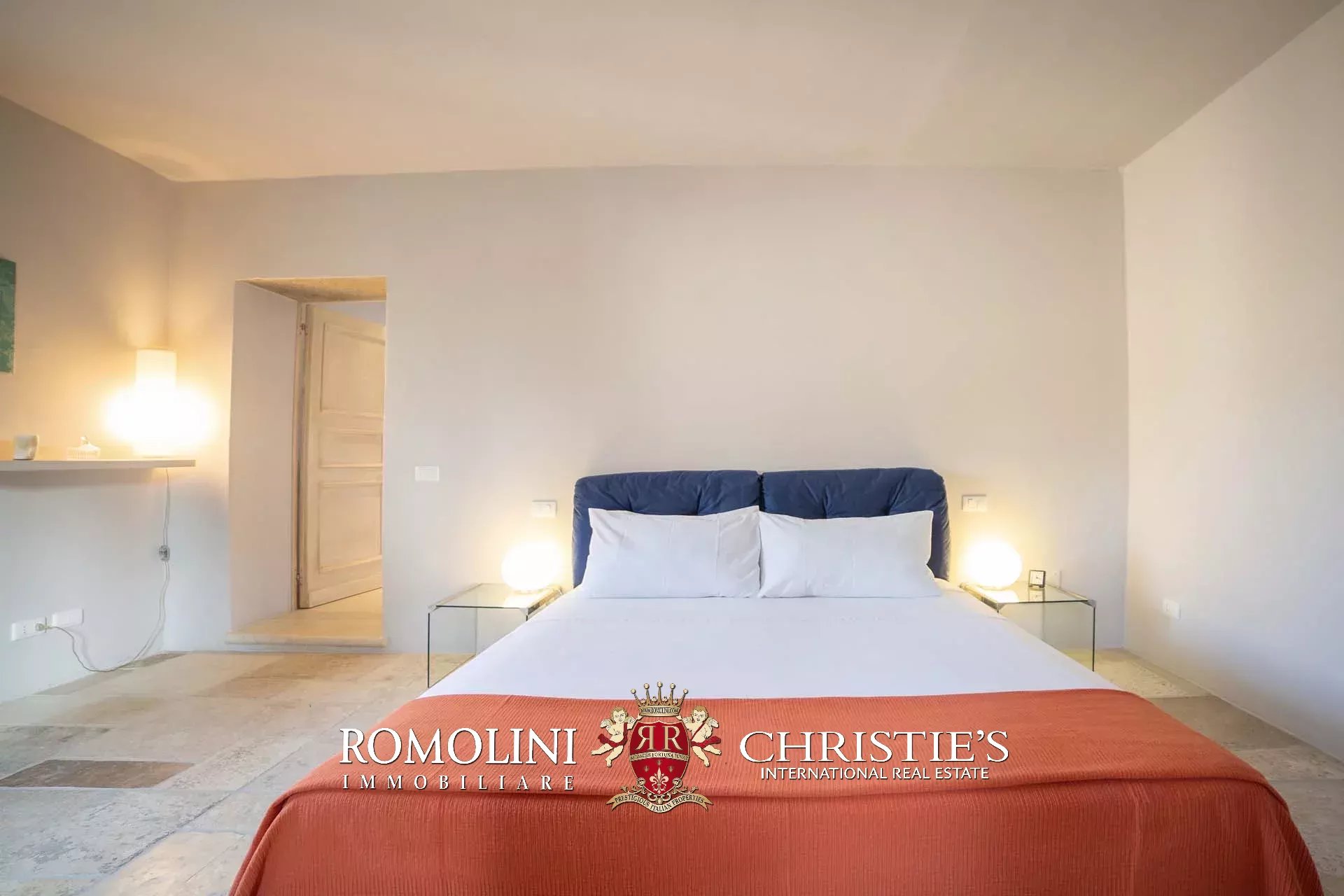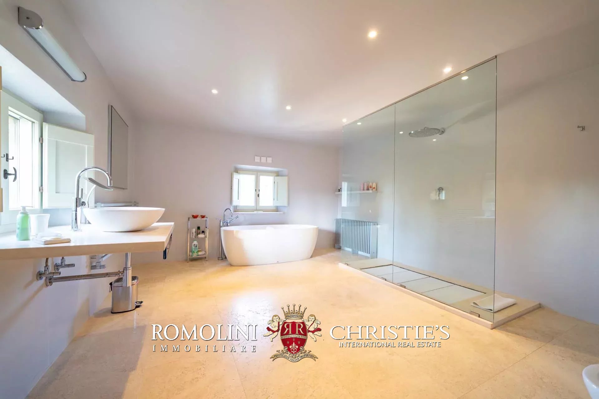 La villa padronale (608 m², 5 camere e 6 bagni) si struttura su quattro piani collegati da una scala interna posta al centro dell’edificio. Entrando al piano terra si trova la zona giorno dell’edificio costituita da un grande soggiorno con cucina a vista, sala da pranzo, sala lettura e bagno di servizio. Nel sottoscala si trova un piccolo ripostiglio molto utile anche come dispensa. Salendo al piano primo, il pianerottolo conduce da un lato alla camera padronale con bagno privato e cabina armadio, dall’altro a un salotto con camino che disimpegna una seconda camera con bagno.
