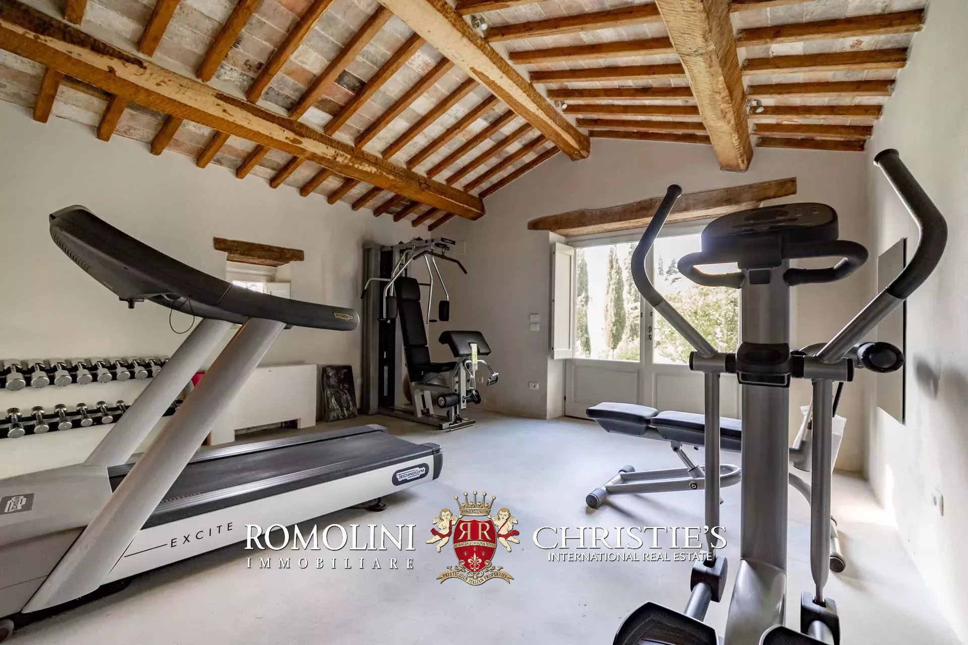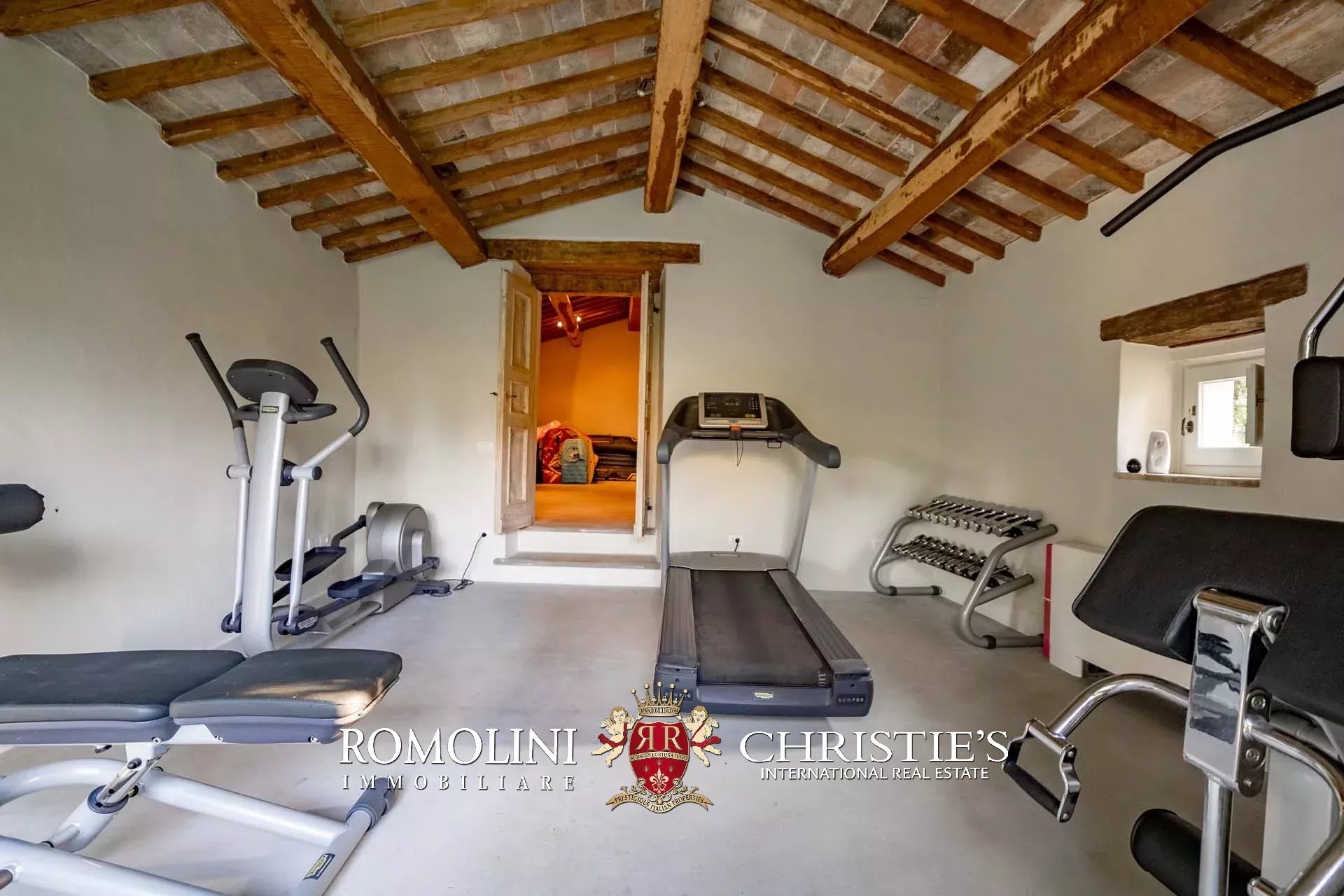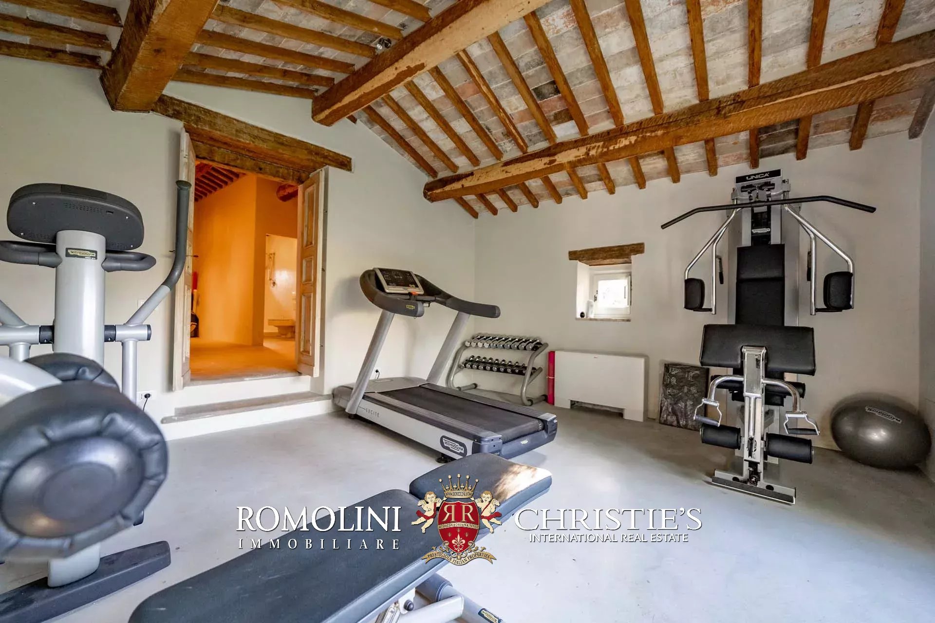 La pool house (50 m², 1 bagno) è invece divisa in due locali adibiti rispettivamente a palestra/zona fitness e spogliatoio con bagno e doccia.