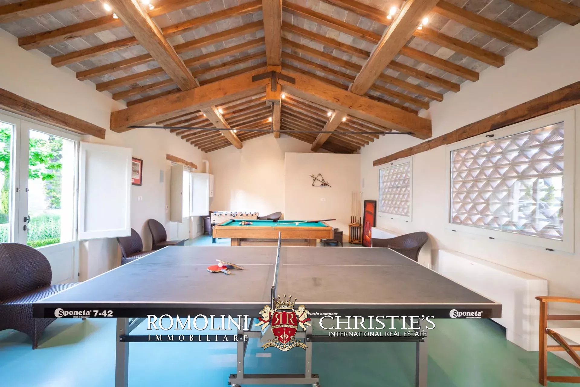 La sala eventi (84 m², 1 bagno) è un grande locale pluriuso composto di una grande stanza vetrata con bagno e portico (attualmente usata come zona biliardo) e da un magazzino con accesso indipendente dall’esterno.