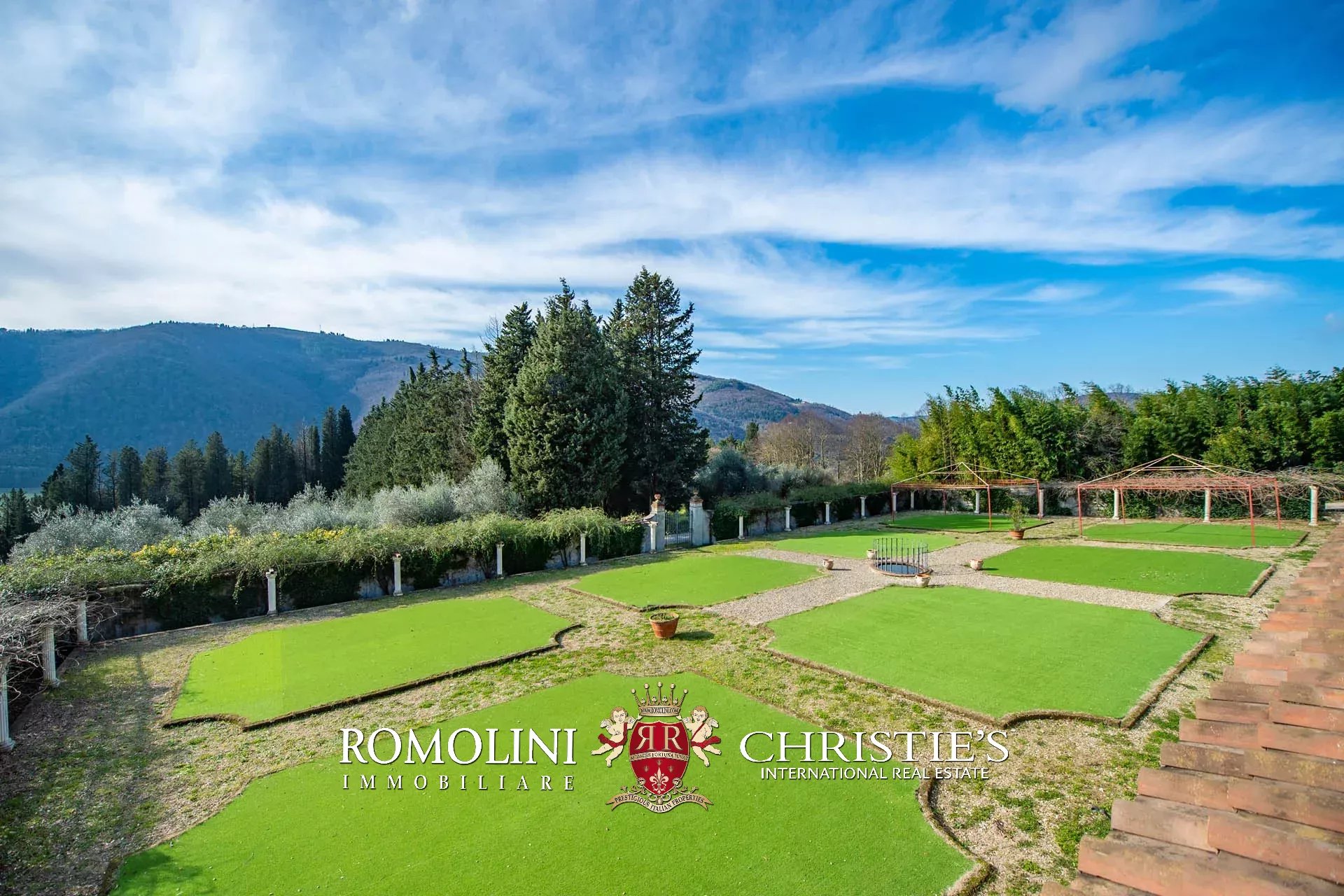 Il giardino all’italiana (1.200 m²) si trova invece sulla terrazza inferiore. Qui trovano posto otto aiuole, percorsi in ghiaia e tre fontane che assicurano uno sfondo elegante e adatto per cerimonie ed eventi.