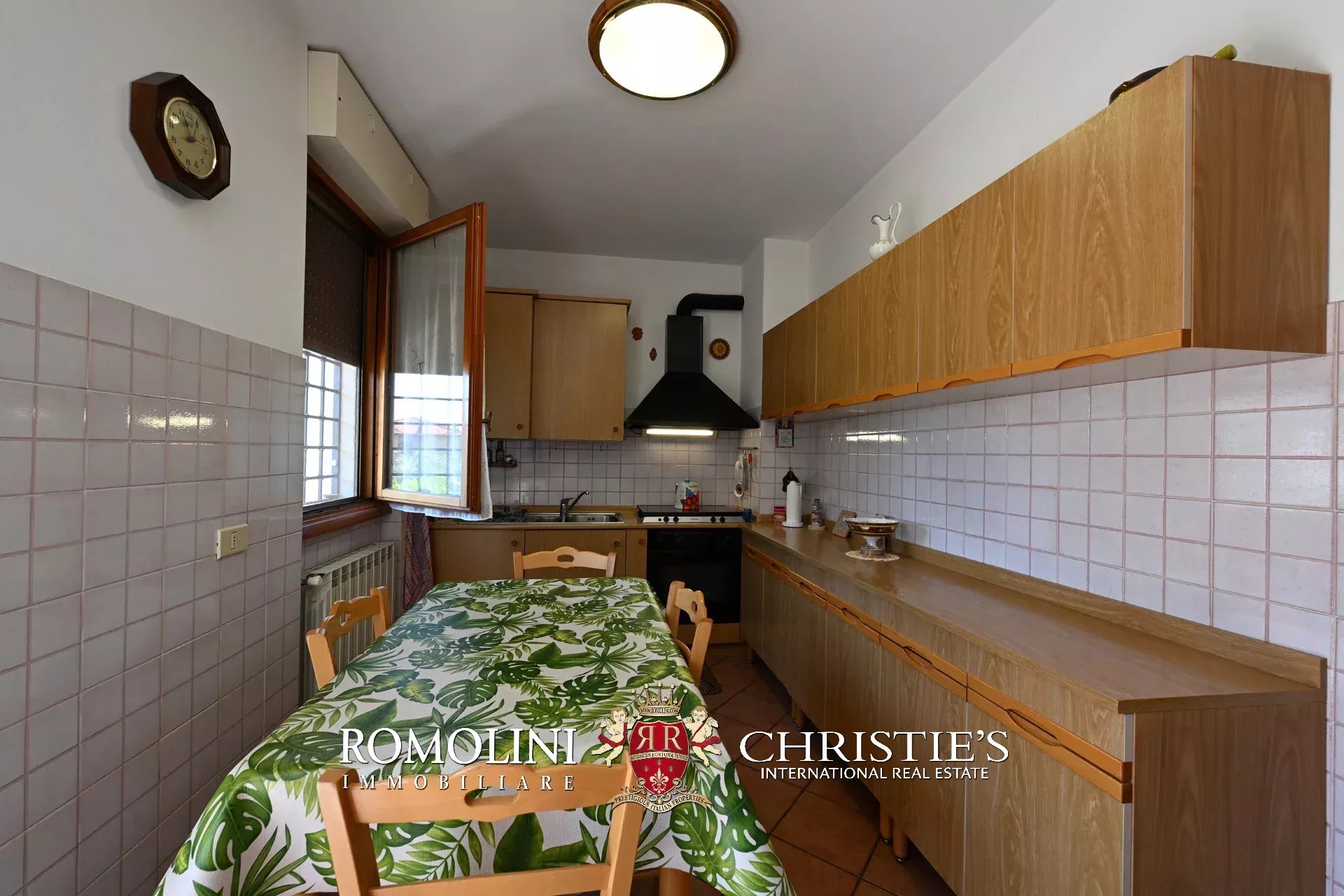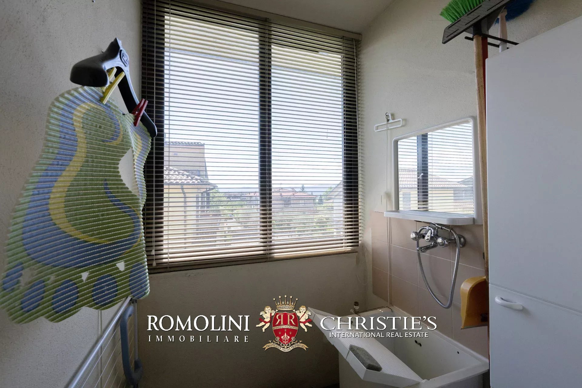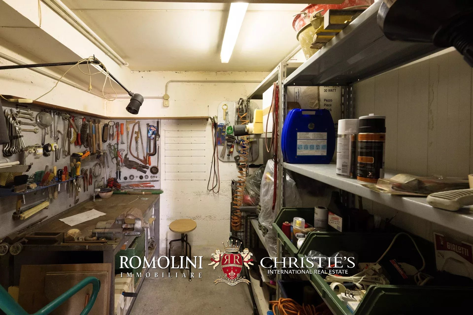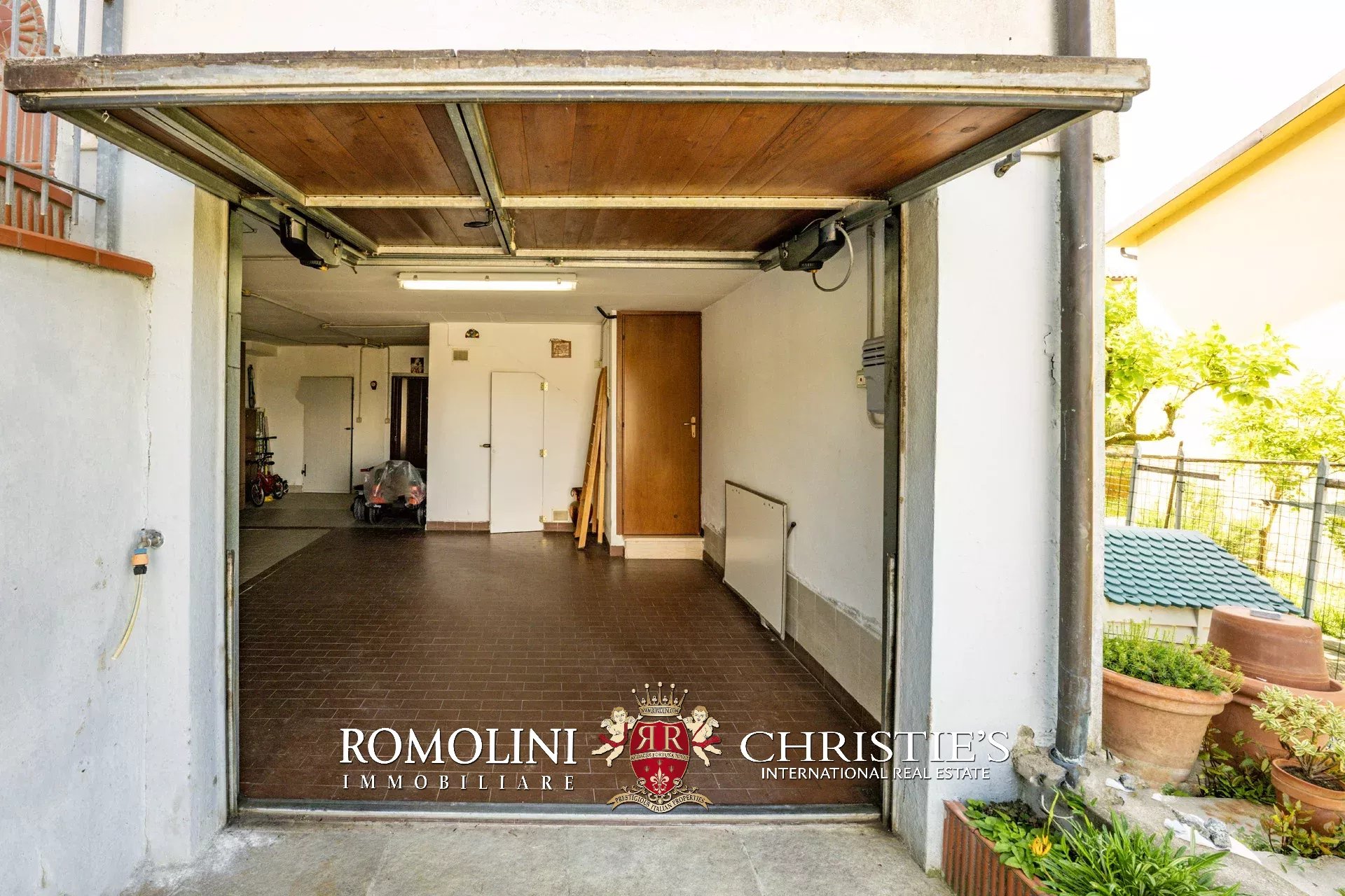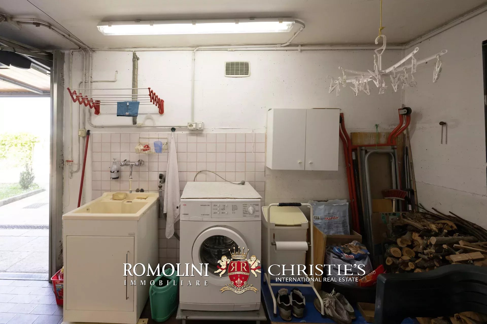 Completa la proprietà un ampio garage al piano seminterrato, dotato di porta basculante elettrica, angolo lavanderia attrezzato, area officina, vano deposito e un’ampia zona parcheggio privata.