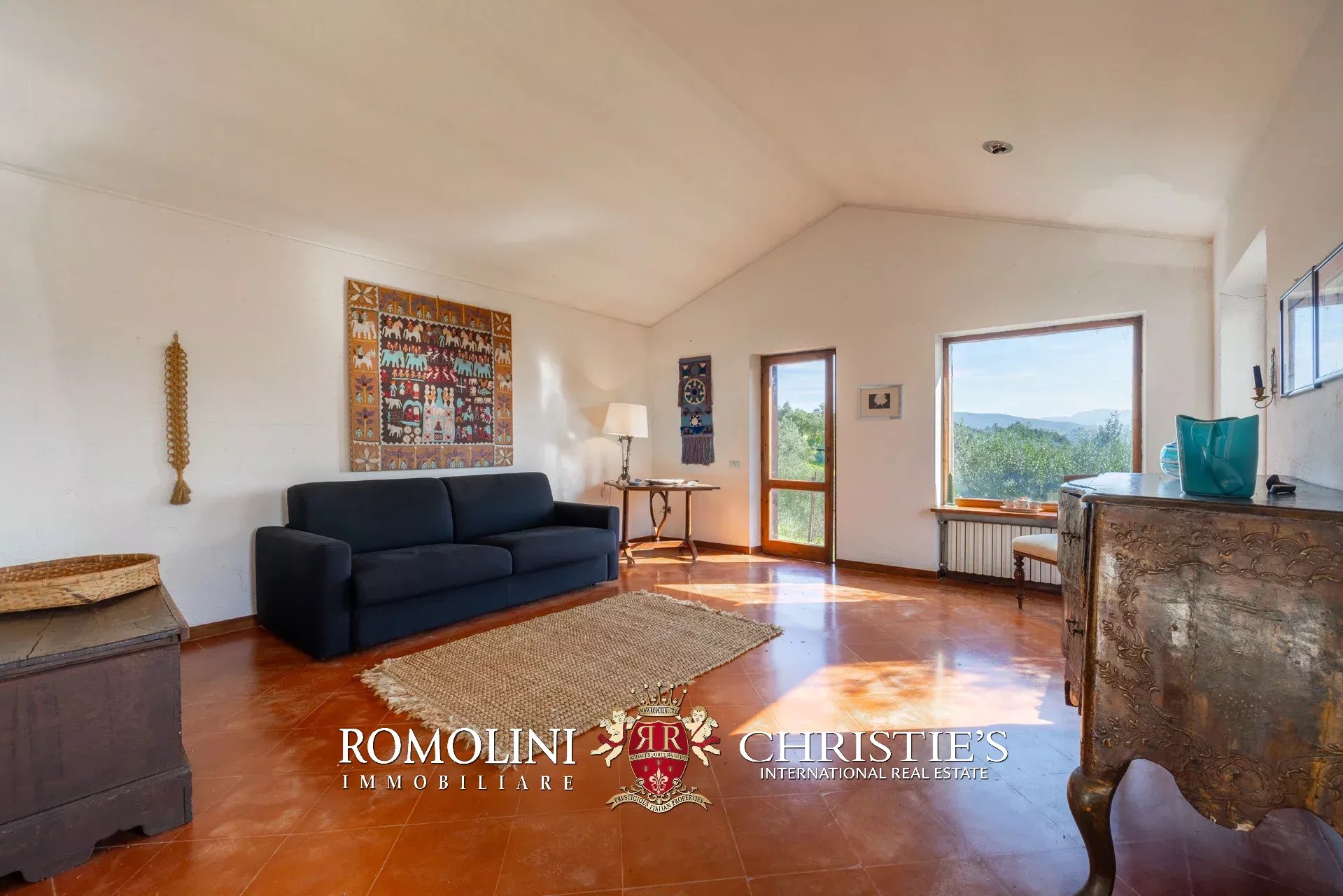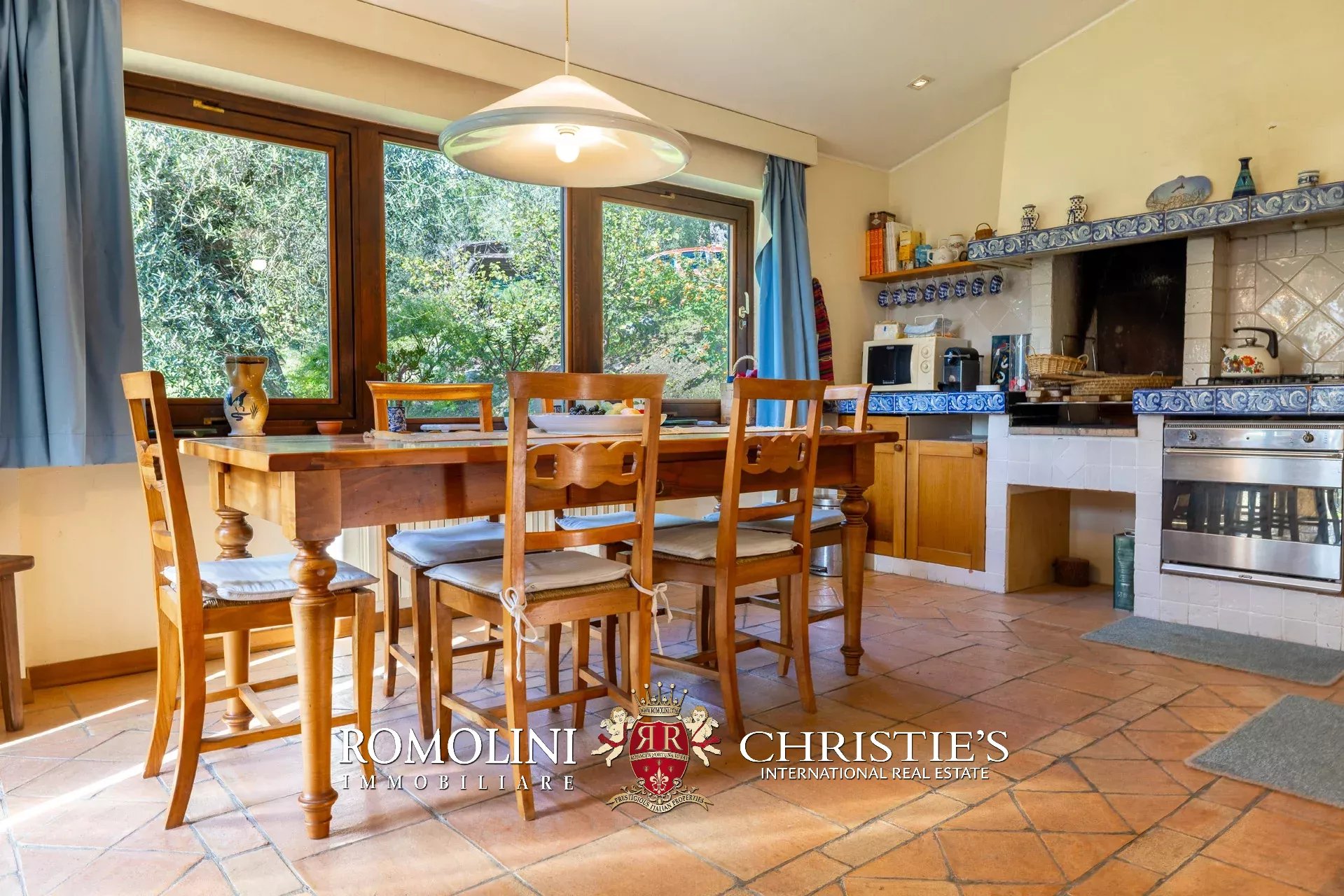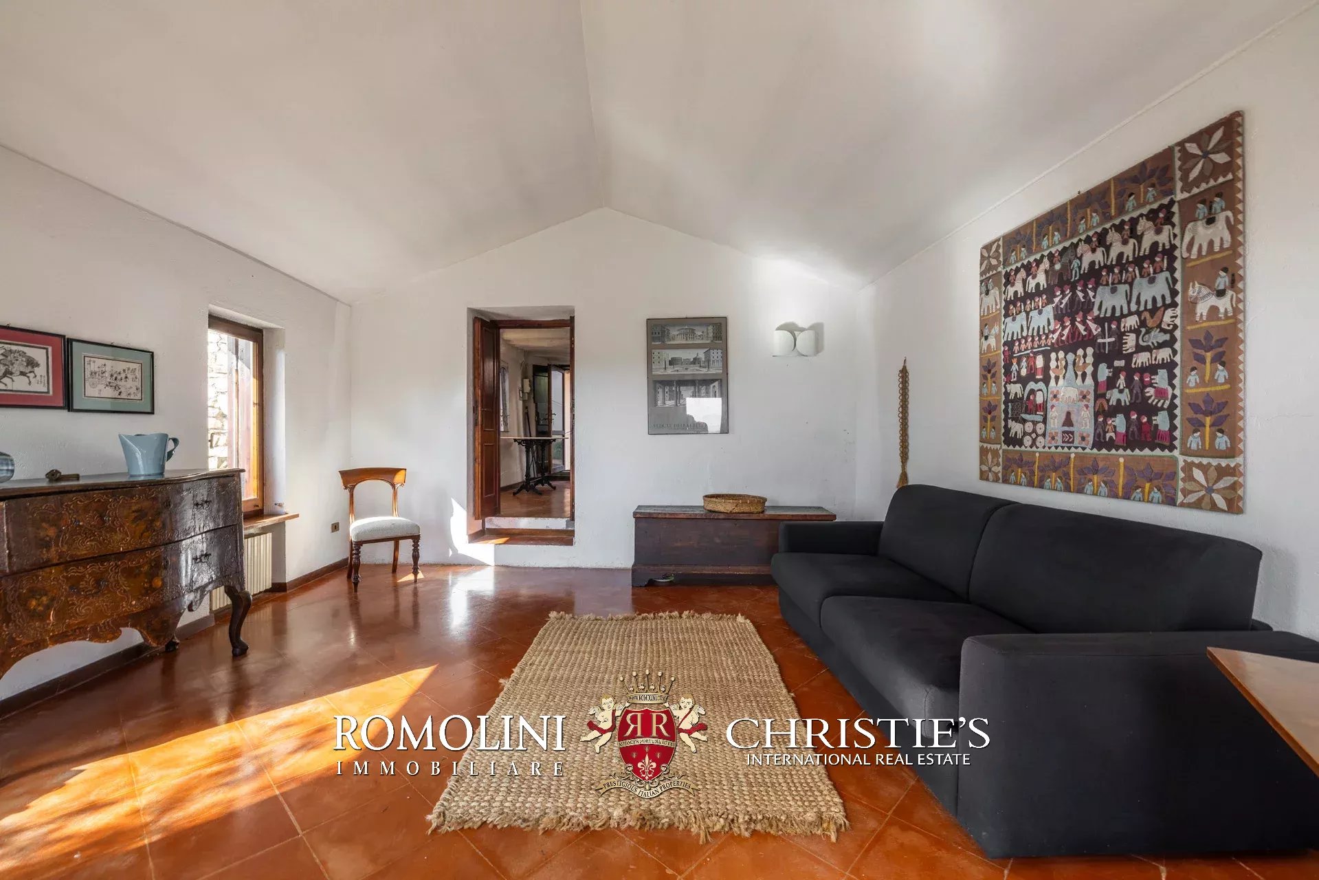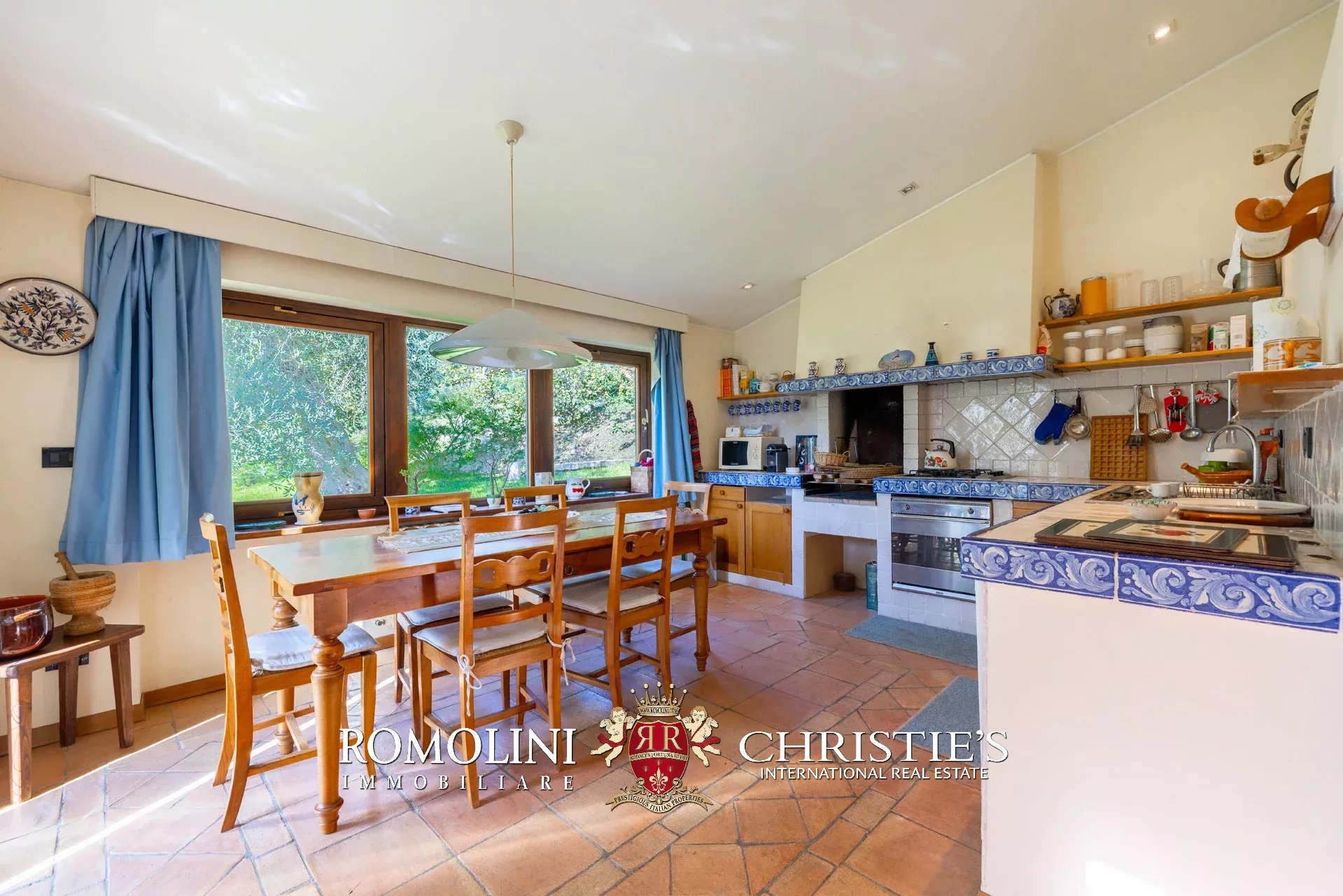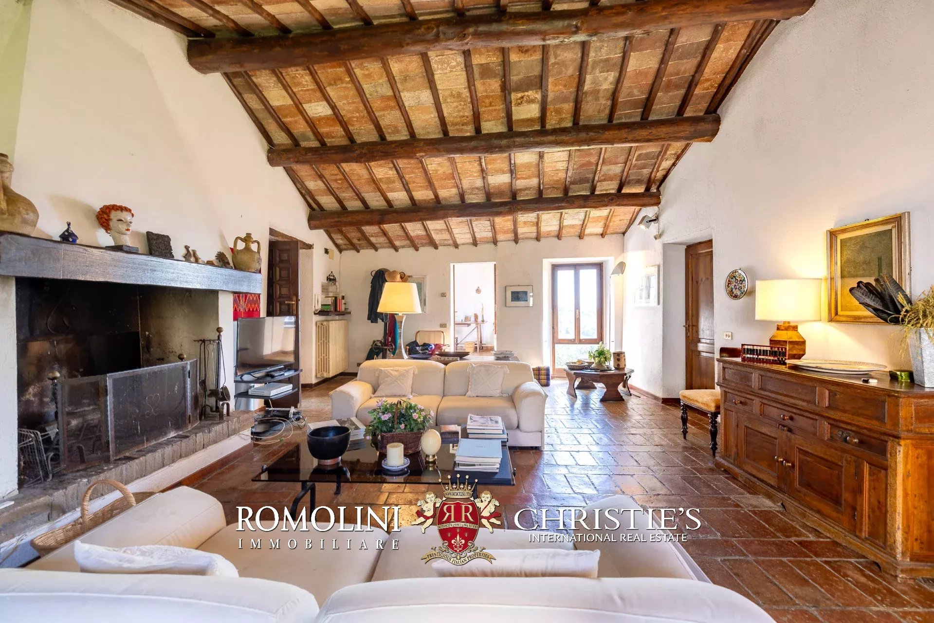 L’abitazione (266 m²), accogliente e strutturata negli anni Novanta in modo garbato nel rispetto dello stile originale, si sviluppa su due livelli ed è strutturata attorno a una torre di avvistamento del Seicento. L’ingresso avviene attraverso un ampio portico con un suggestivo tavolo in pietra peperino e un grande forno a legna, ideale per cene all’aperto. Da qui si accede a un luminoso salone con camino in pietra, caratterizzato da panorami che si aprono su due lati opposti. Adiacente al salone si trova una cucina abitabile in muratura, completa di camino, decorazioni in maiolica e spaziosi piani di lavoro.