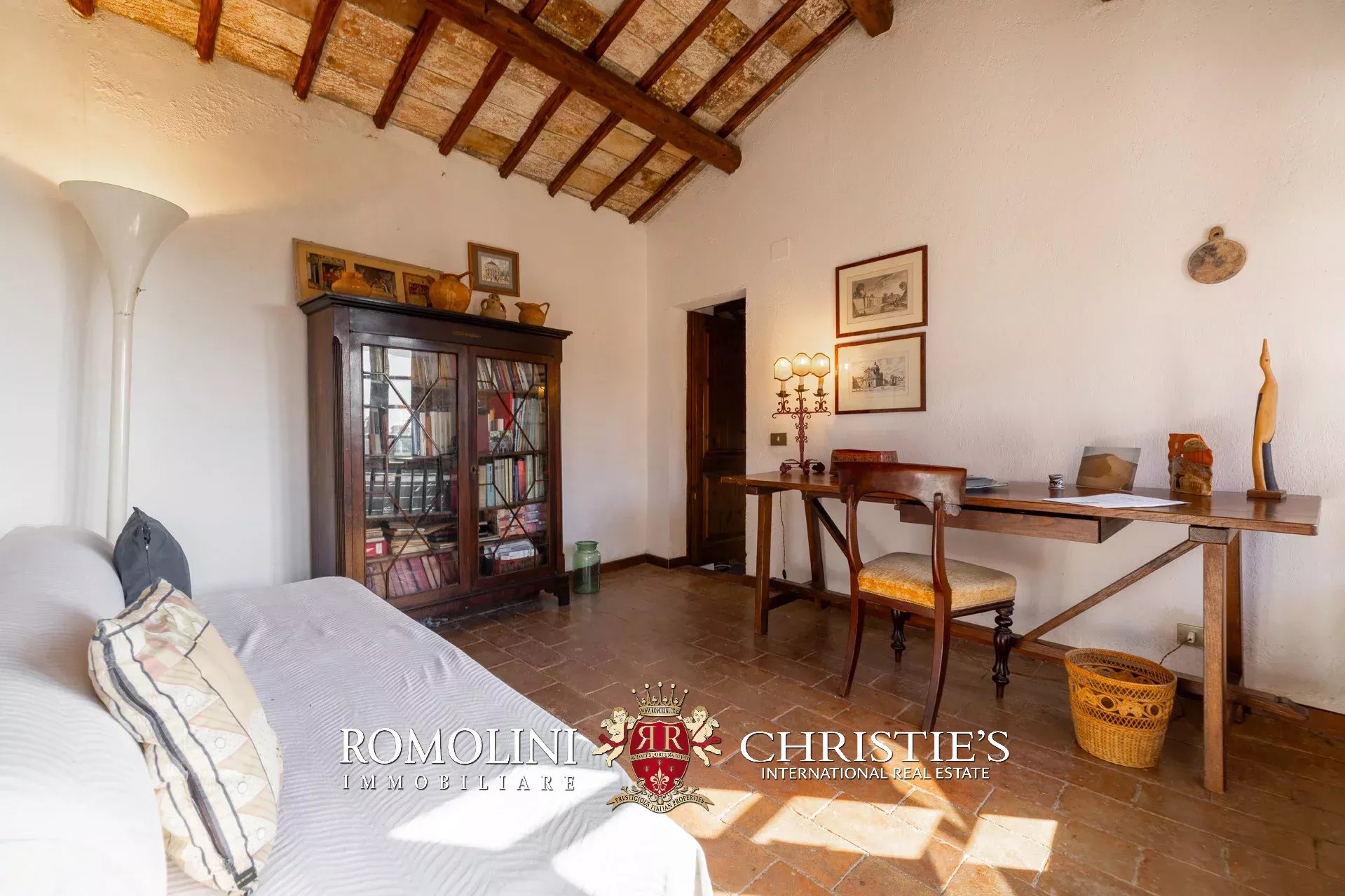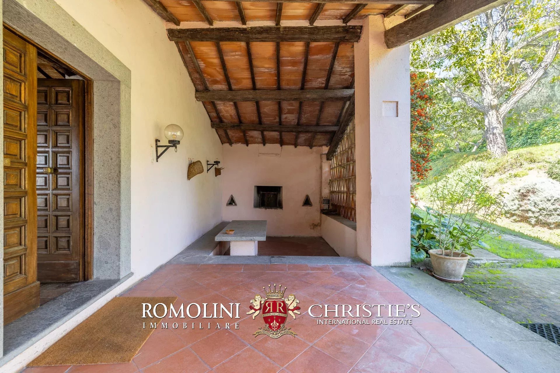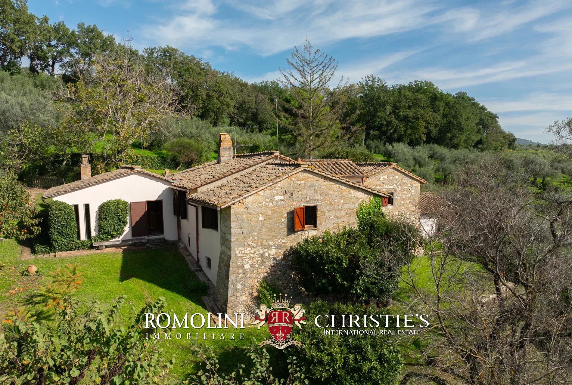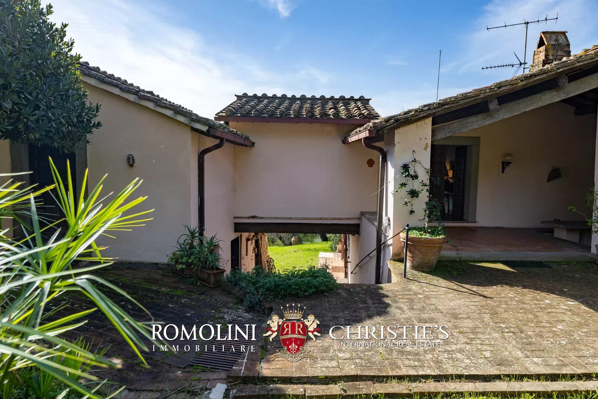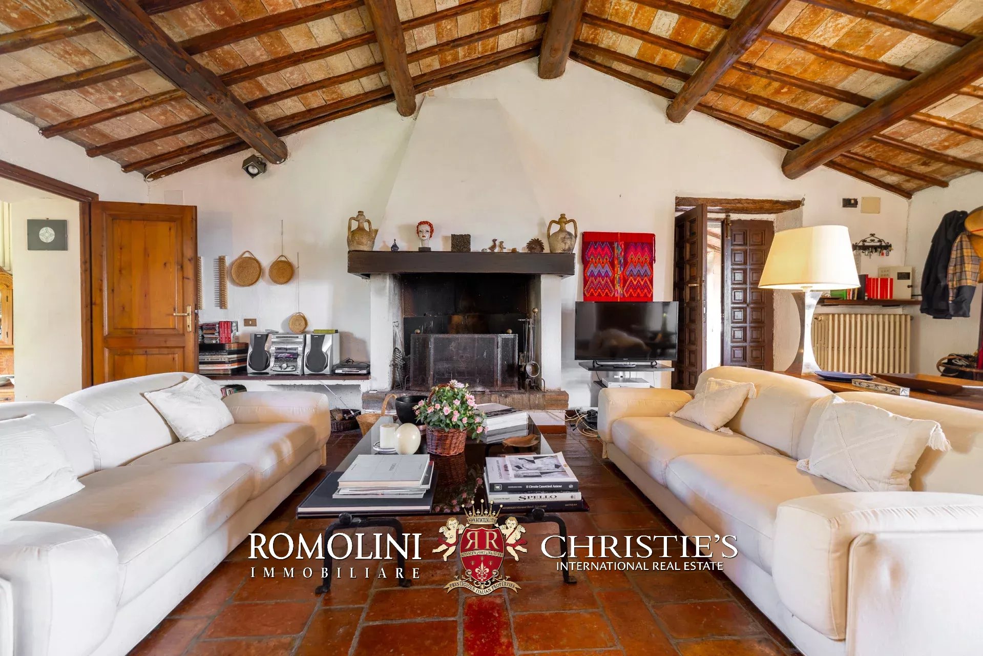 L’abitazione (266 m²), accogliente e strutturata negli anni Novanta in modo garbato nel rispetto dello stile originale, si sviluppa su due livelli ed è strutturata attorno a una torre di avvistamento del Seicento. L’ingresso avviene attraverso un ampio portico con un suggestivo tavolo in pietra peperino e un grande forno a legna, ideale per cene all’aperto. Da qui si accede a un luminoso salone con camino in pietra, caratterizzato da panorami che si aprono su due lati opposti. Adiacente al salone si trova una cucina abitabile in muratura, completa di camino, decorazioni in maiolica e spaziosi piani di lavoro.
