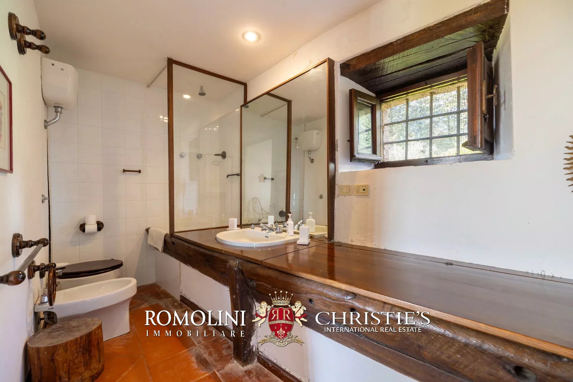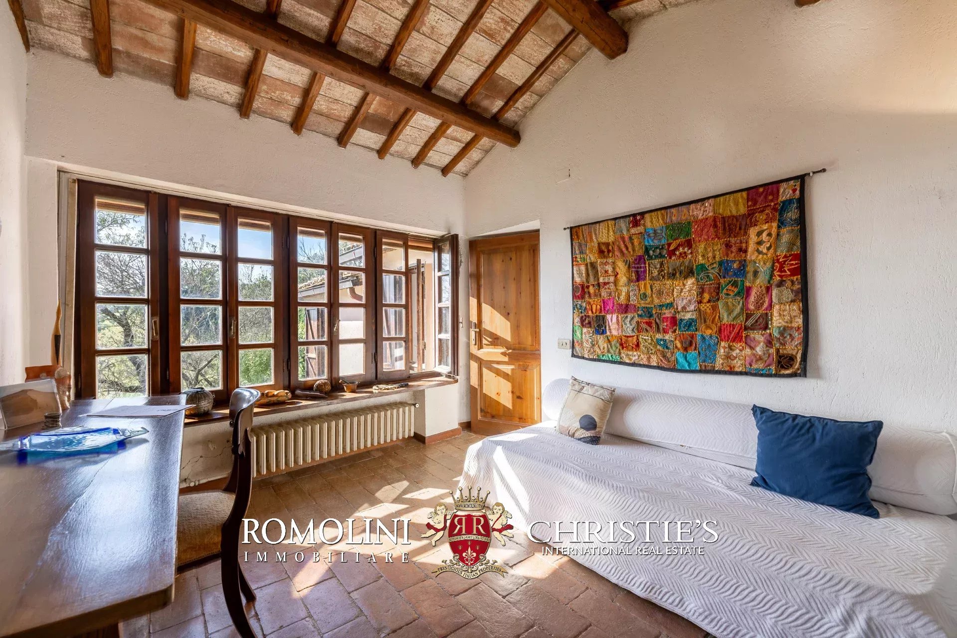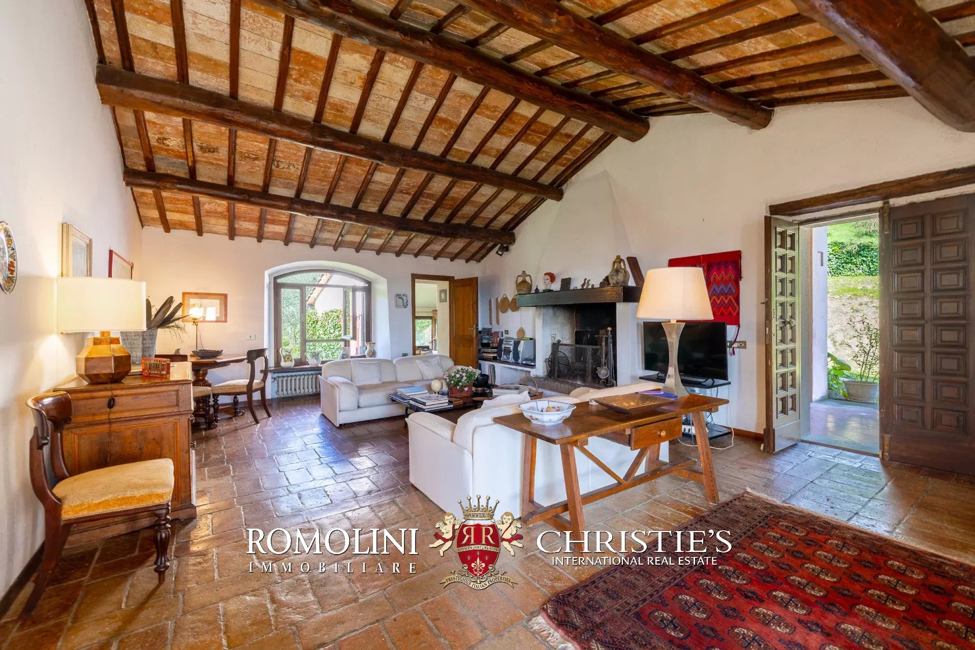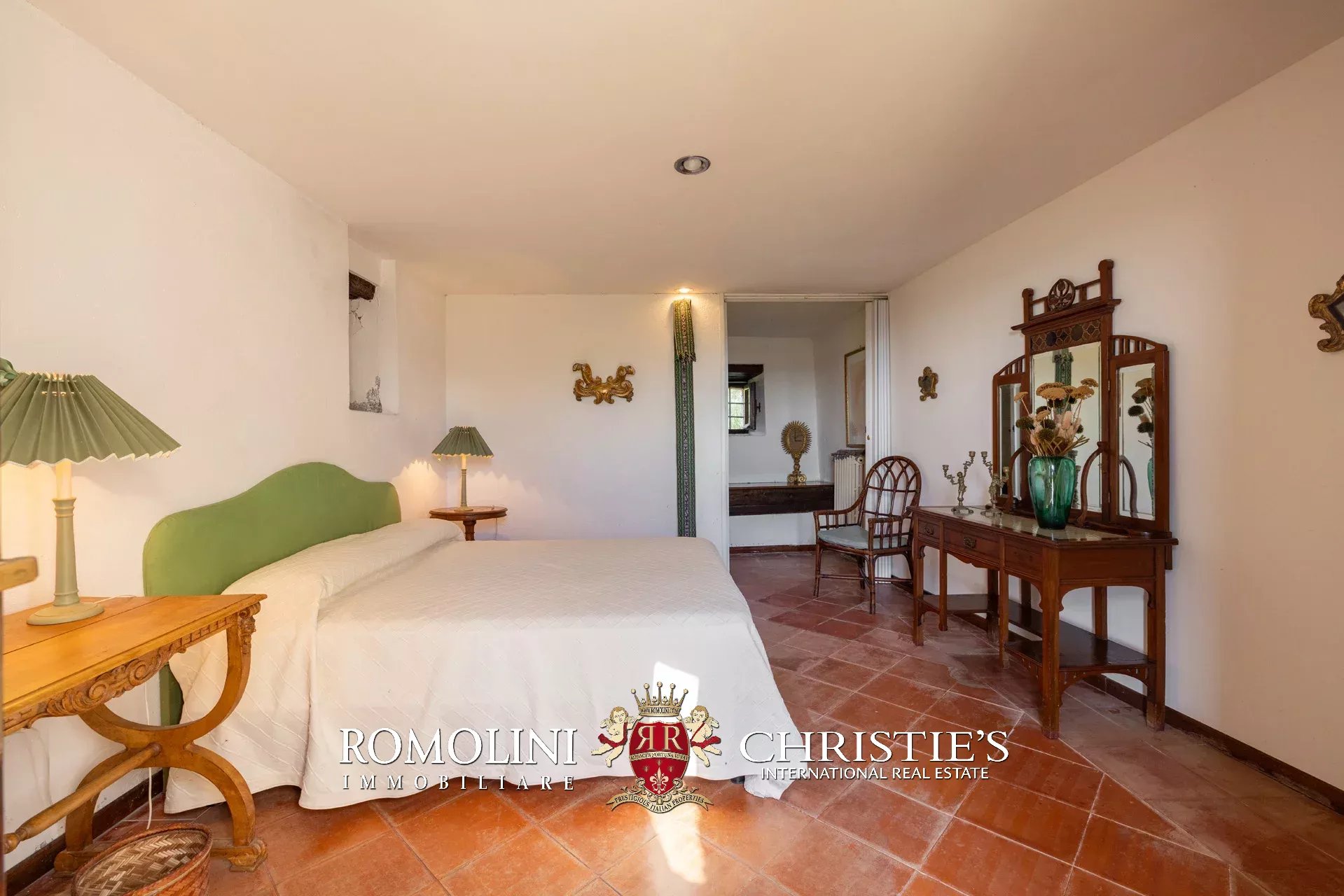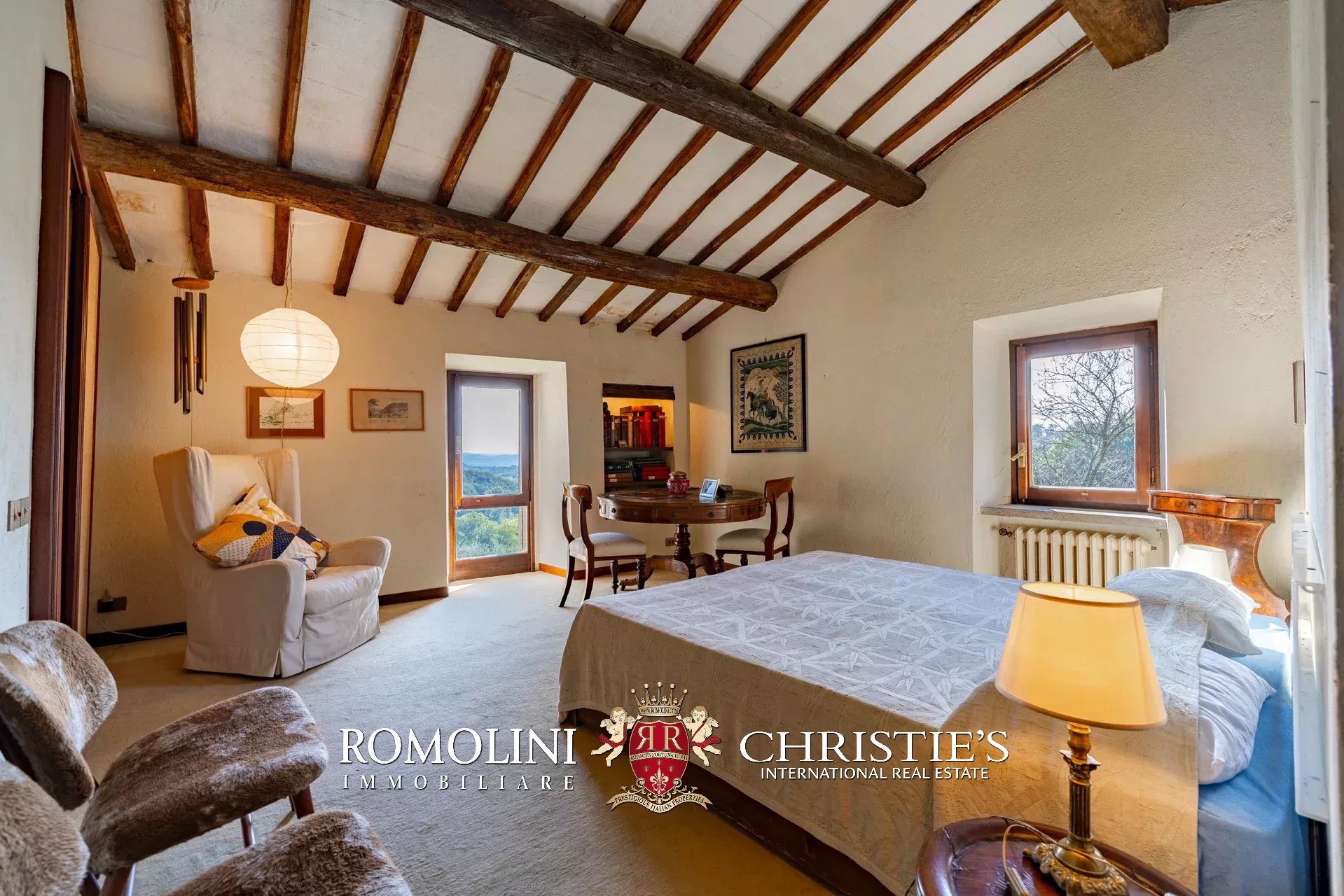 L’abitazione (266 m²), accogliente e strutturata negli anni Novanta in modo garbato nel rispetto dello stile originale, si sviluppa su due livelli ed è strutturata attorno a una torre di avvistamento del Seicento. L’ingresso avviene attraverso un ampio portico con un suggestivo tavolo in pietra peperino e un grande forno a legna, ideale per cene all’aperto. Da qui si accede a un luminoso salone con camino in pietra, caratterizzato da panorami che si aprono su due lati opposti. Adiacente al salone si trova una cucina abitabile in muratura, completa di camino, decorazioni in maiolica e spaziosi piani di lavoro.