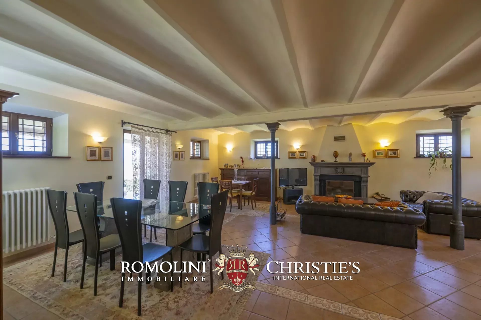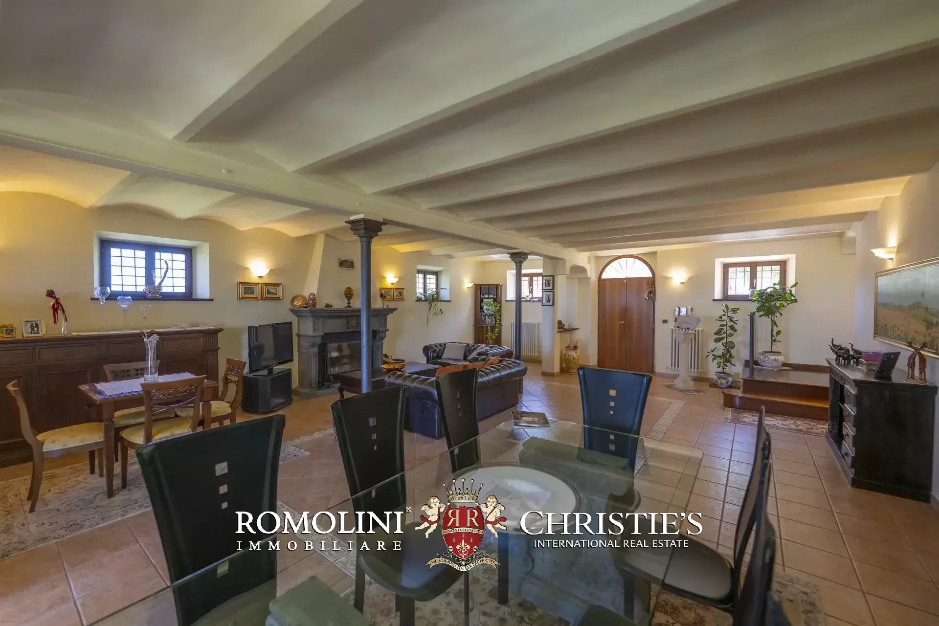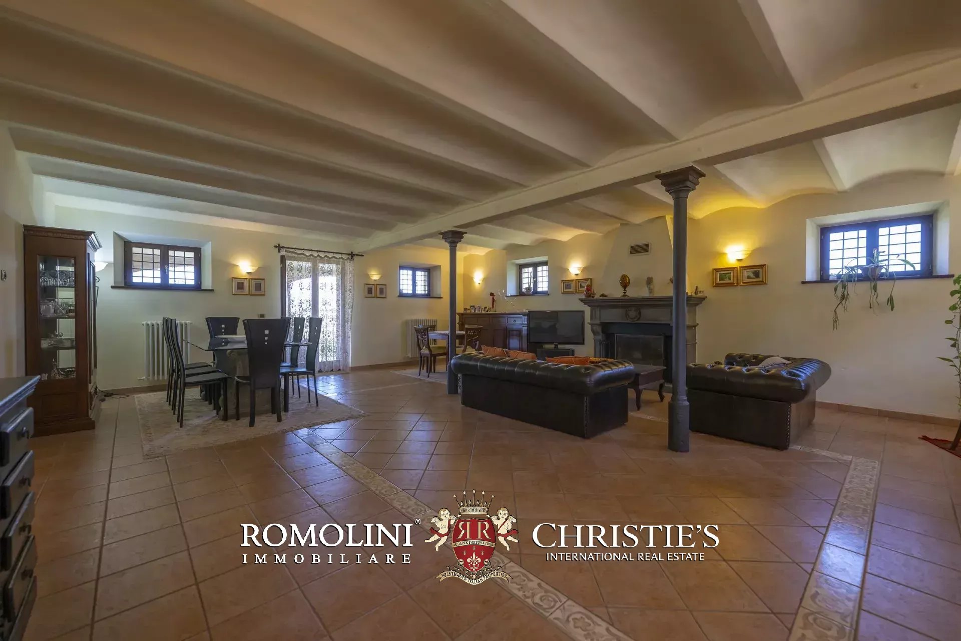 - Piano terra: ampio soggiorno con grande camino e zona pranzo, cucina abitabile, bagno, lavanderia e garage. Le porte finestra poste in soggiorno e in cucina permettono di accedere al porticato dove attualmente si trovano un’area soggiorno e un comodo tavolo da pranzo per poter godere dello splendido panorama;