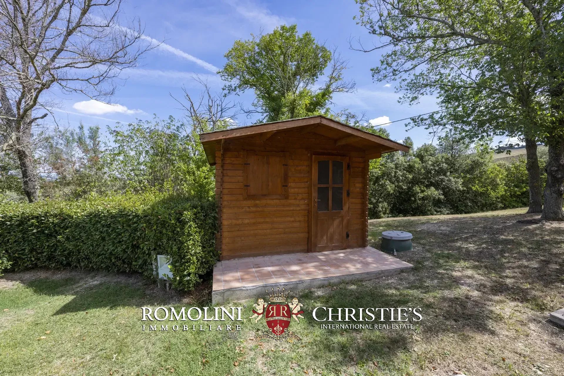 All’esterno si trova un giardino di 7.900 m² contornato da siepe e punteggiato da piante ad alto fusto che assicurano ombra anche nelle calde giornate estive. Il verde è dotato di illuminazione esterna e impianto di irrigazione alimentato da pozzo e cisterna per la raccolta di acqua piovana.