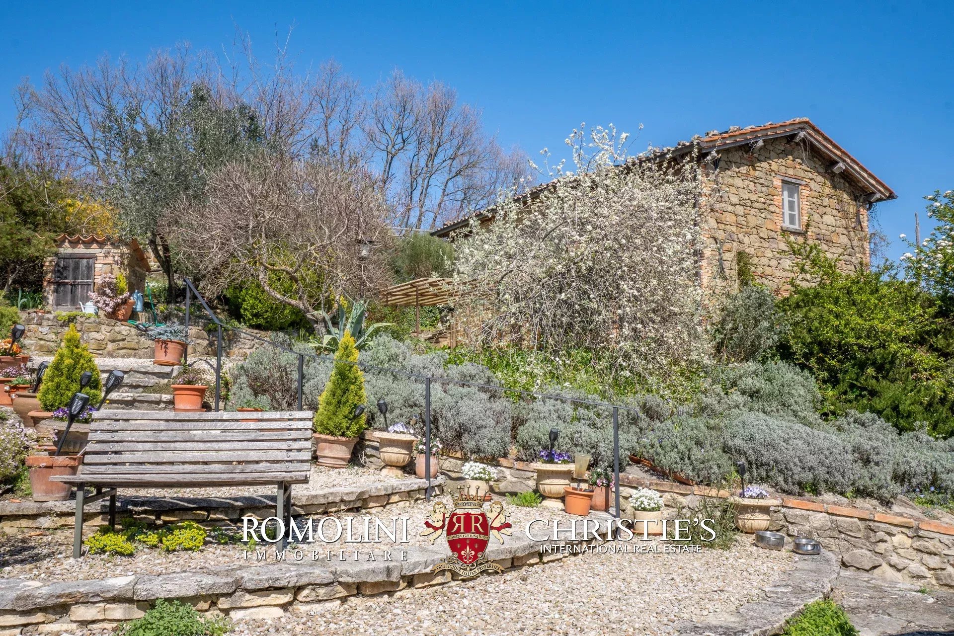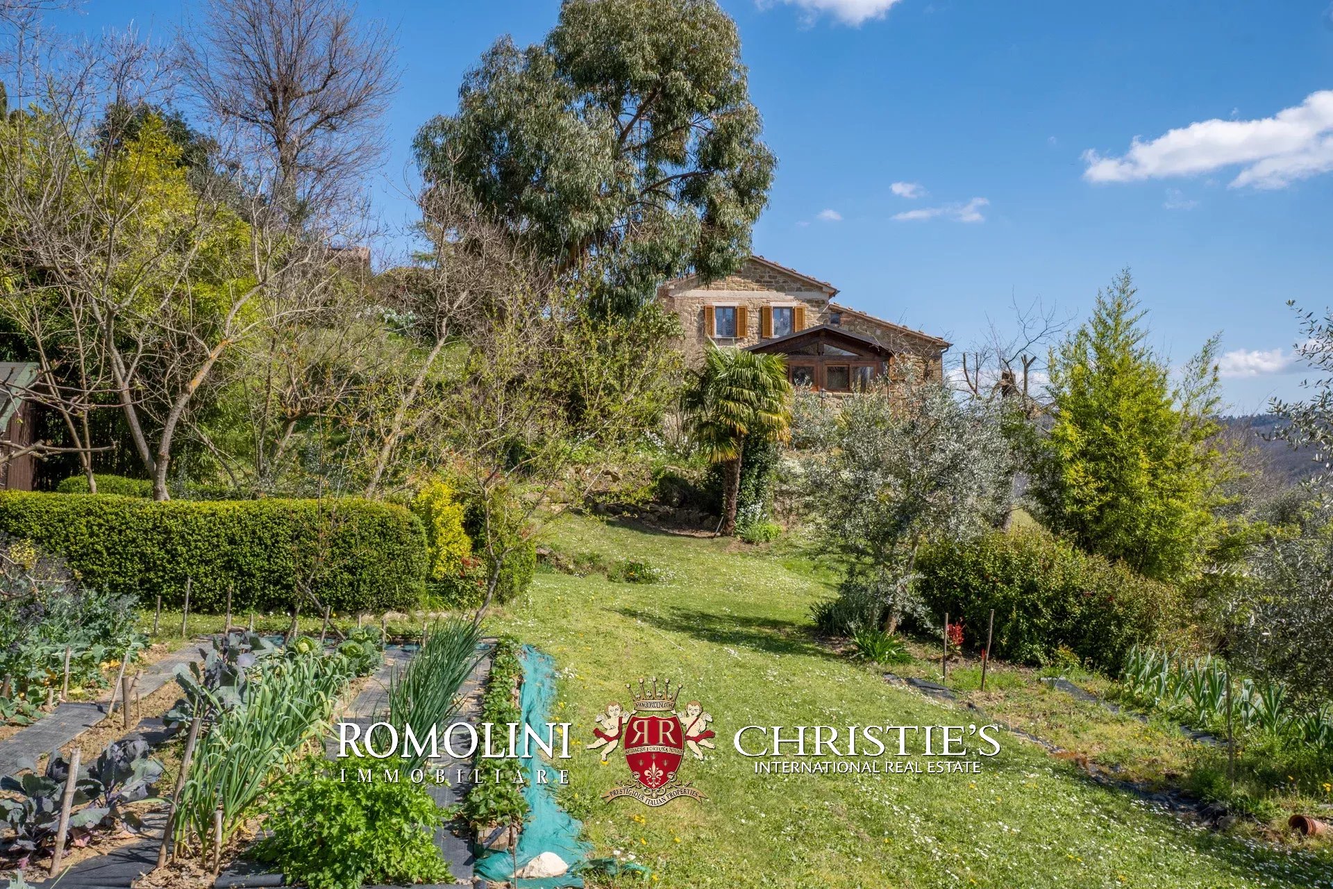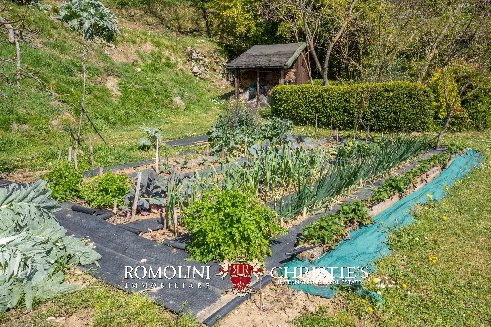 Il giardino di 12.000 m² che circonda gli edifici è interamente recintato e arricchito da ulivi, alberi secolari tipici della zona e piante decorative. La proprietà conta anche un’ampia varietà di piante da frutto oltre a un angolo di giardino con tre serre per la coltivazione di verdure biologiche.