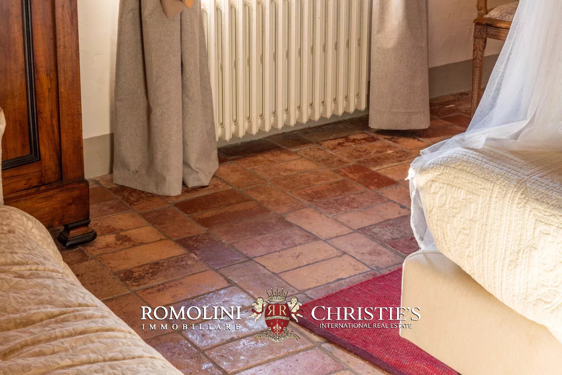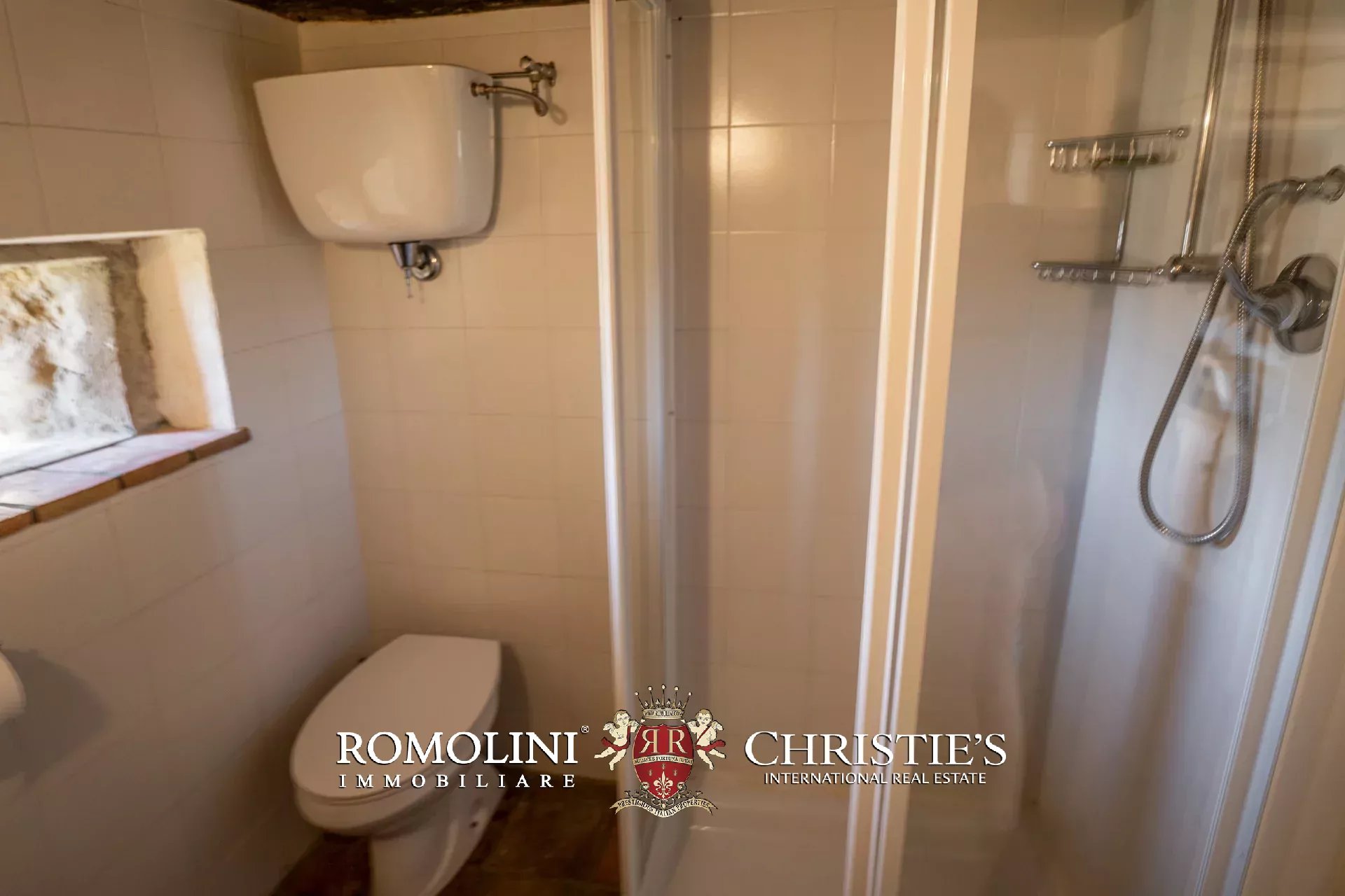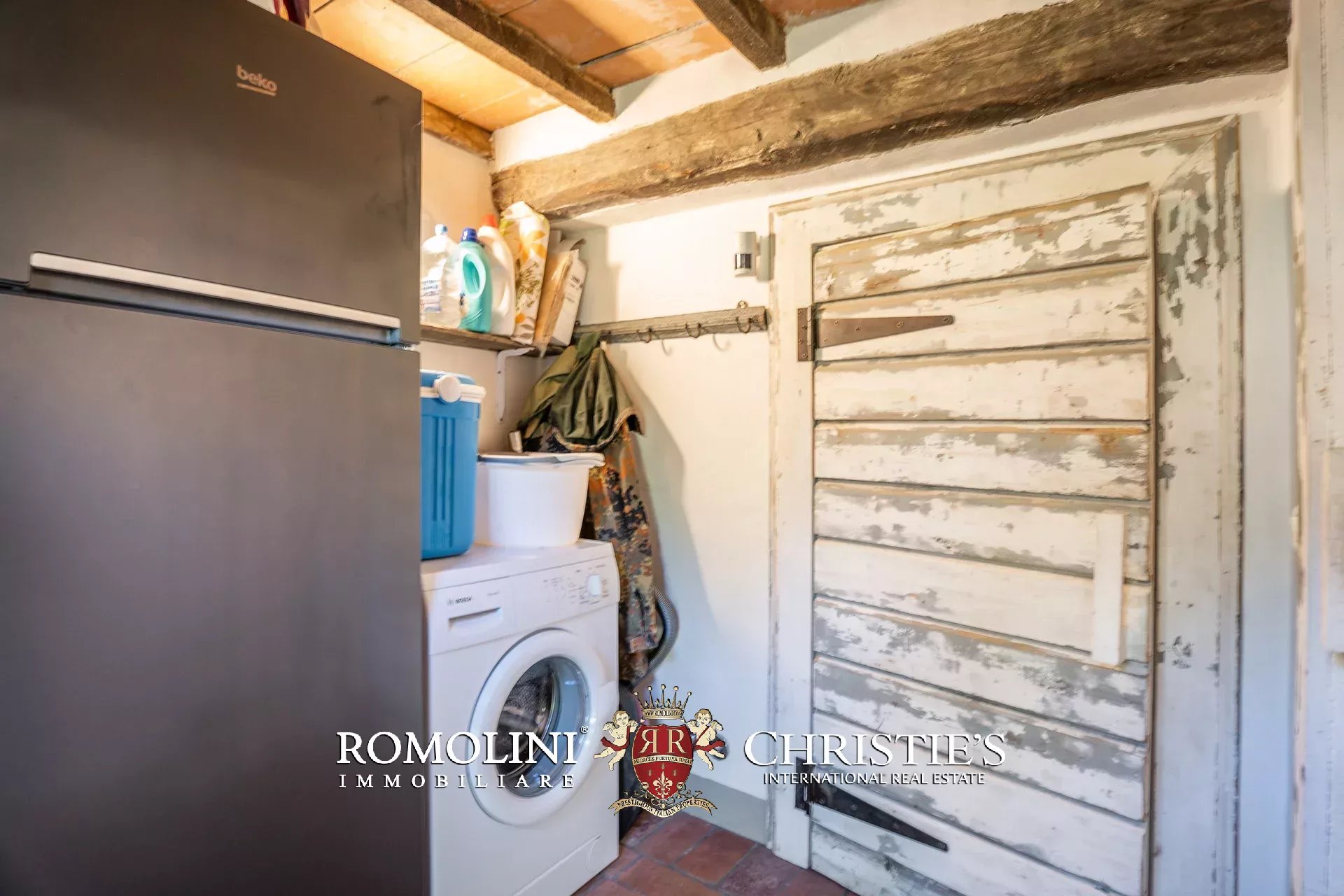 Il casale (179 m², 2 camere e 2 bagni) si sviluppa su due livelli e offre ambienti caldi e autentici: due ampie camere, due bagni, una zona giorno accogliente con camino a legna e cucina abitabile. I pavimenti in terracotta, i soffitti con travi in legno a vista e l’antico forno per il pane testimoniano il sapiente restauro che ha valorizzato l’anima storica della proprietà senza però rinunciare al comfort moderno.