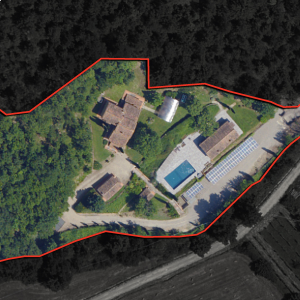 Gli edifici sono immersi in un parco privato di 4.000 m², interamente recintato e disposto su terrazze per sfruttare la massimo la superficie disponibile. A breve distanza dalla casa si trova la piscina 12 × 6 m circondata dal solarium in pietra e con vista sulla campagna circostante. A fianco della vasca si trova la lavanderia.