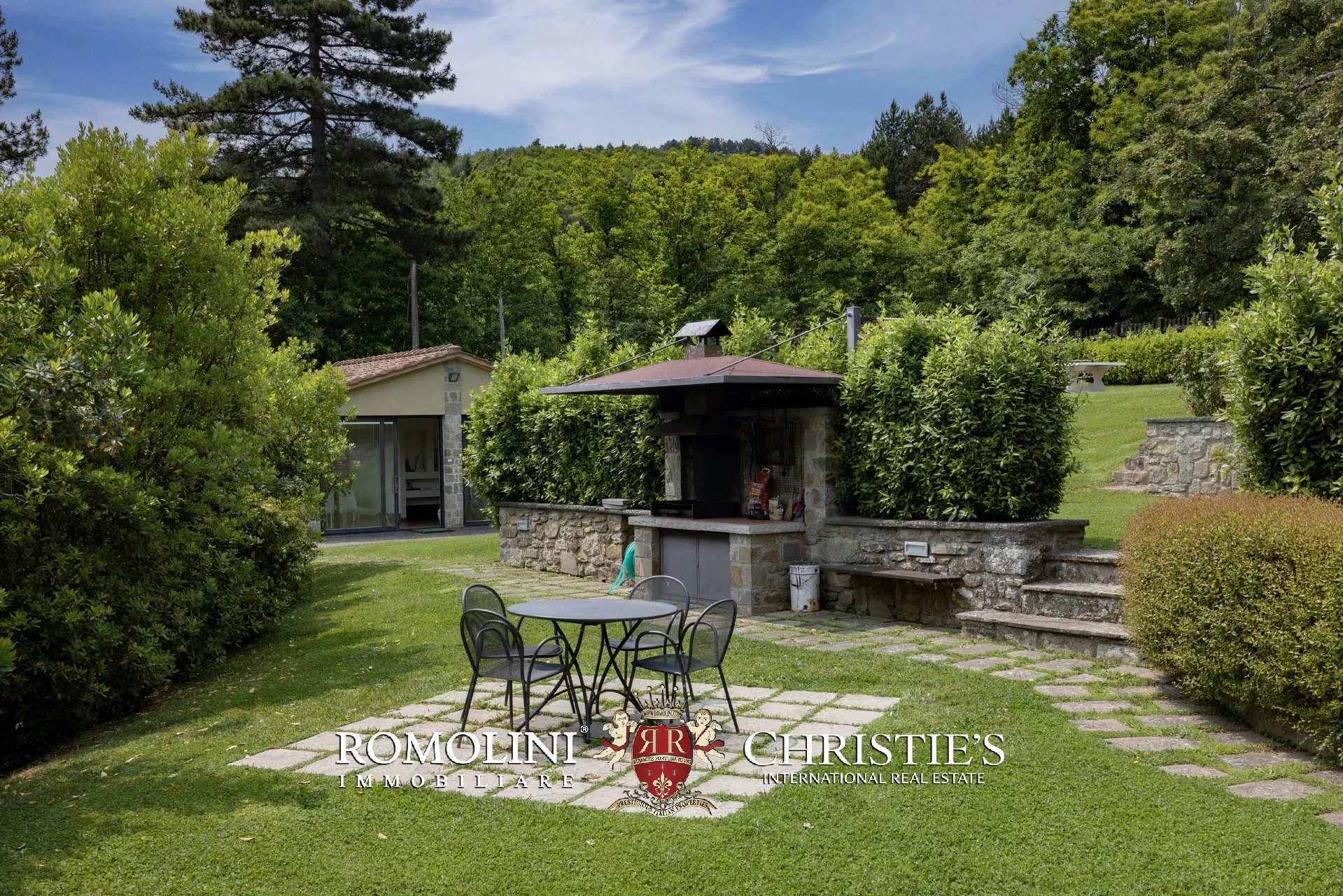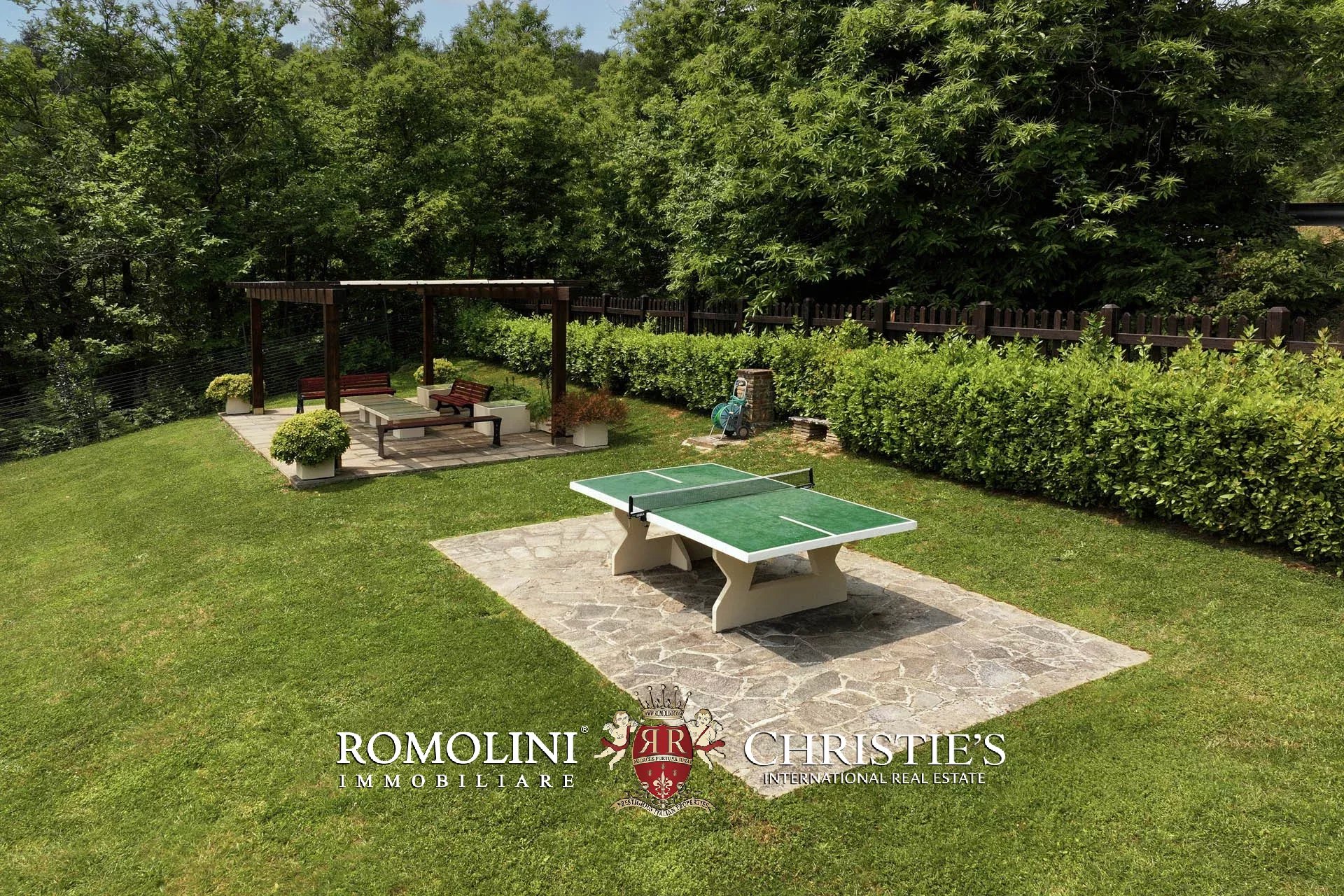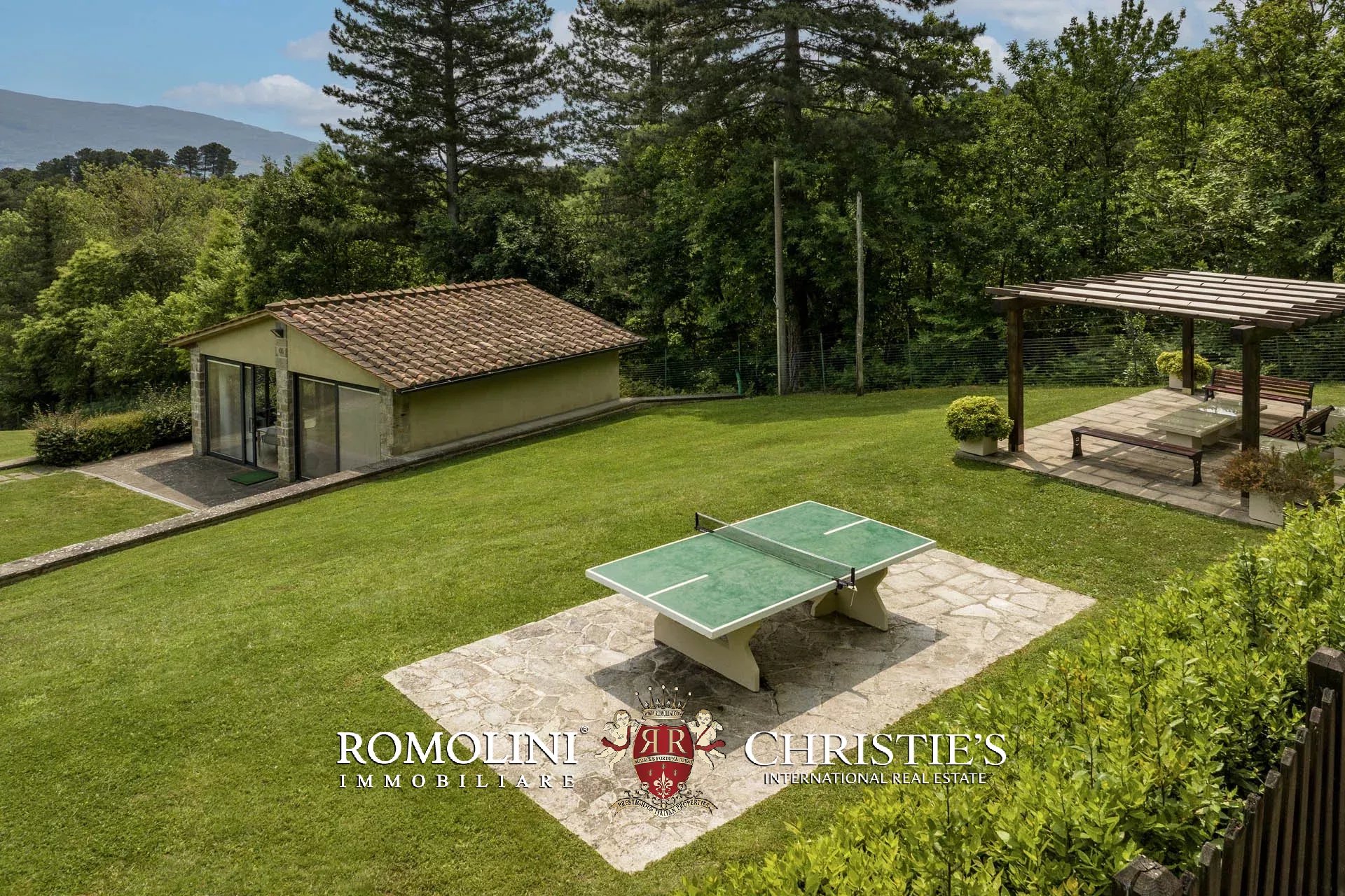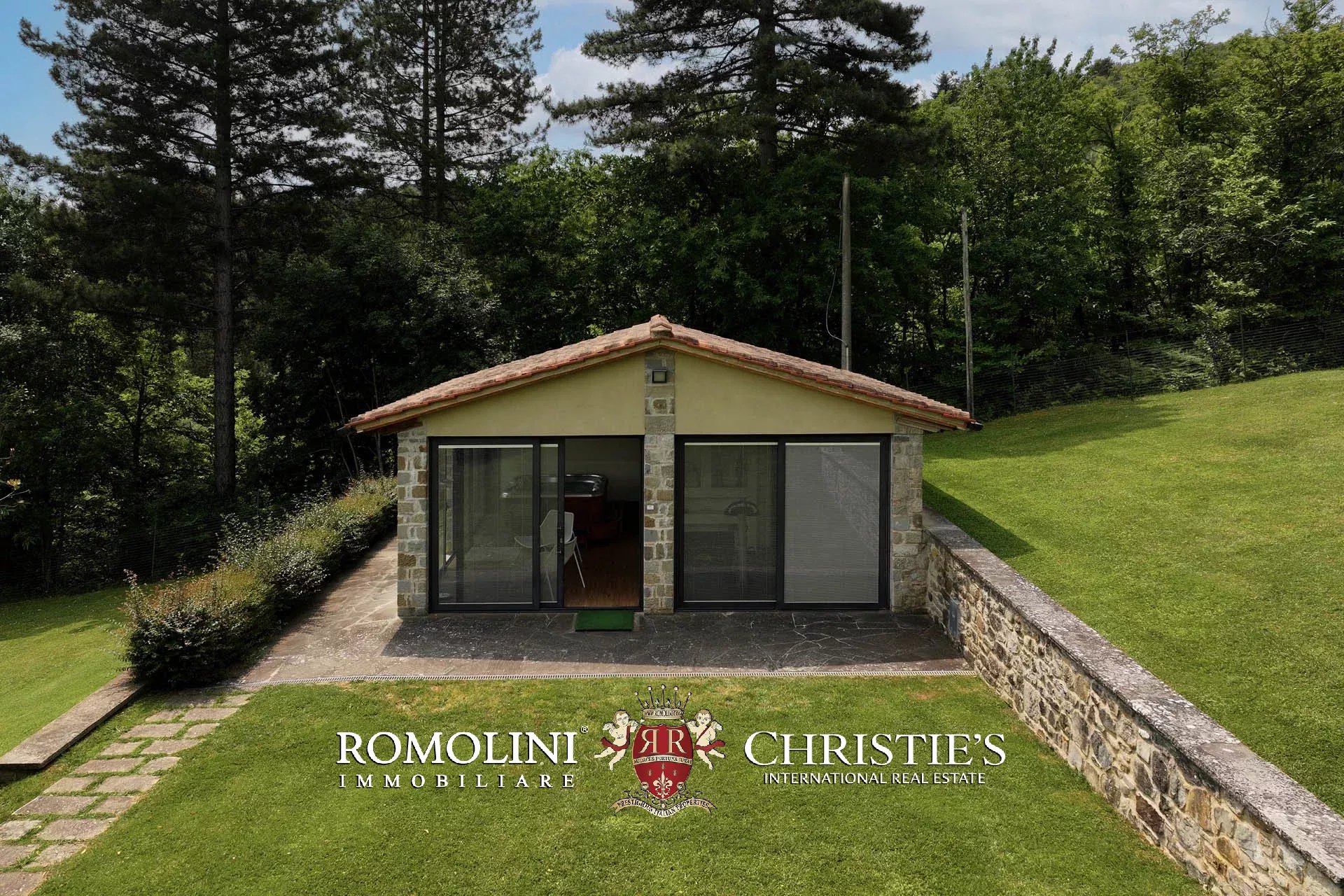Attualmente il collegamento al piano inferiore della villa è realizzato attraverso una scala esterna accessibile dal soggiorno e dalla cucina, nel pianerottolo di accesso alle scale è presente un forno a legna perfettamente funzionante. Al piano inferiore sono presenti due camere con bagno en-suite e due spaziose suite con bagno. Tutte le camere hanno accesso indipendente al grande parco che degrada dolcemente verso valle.