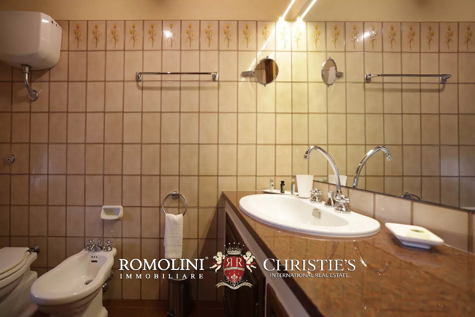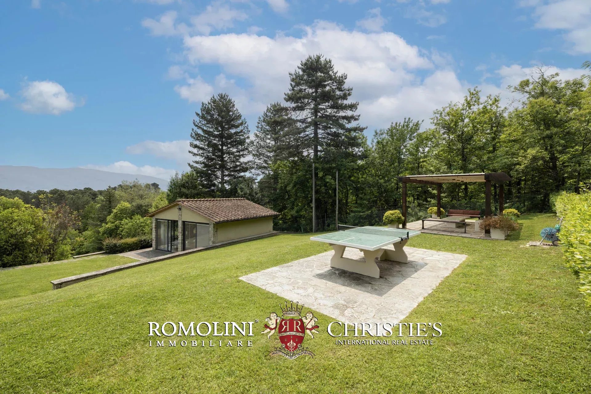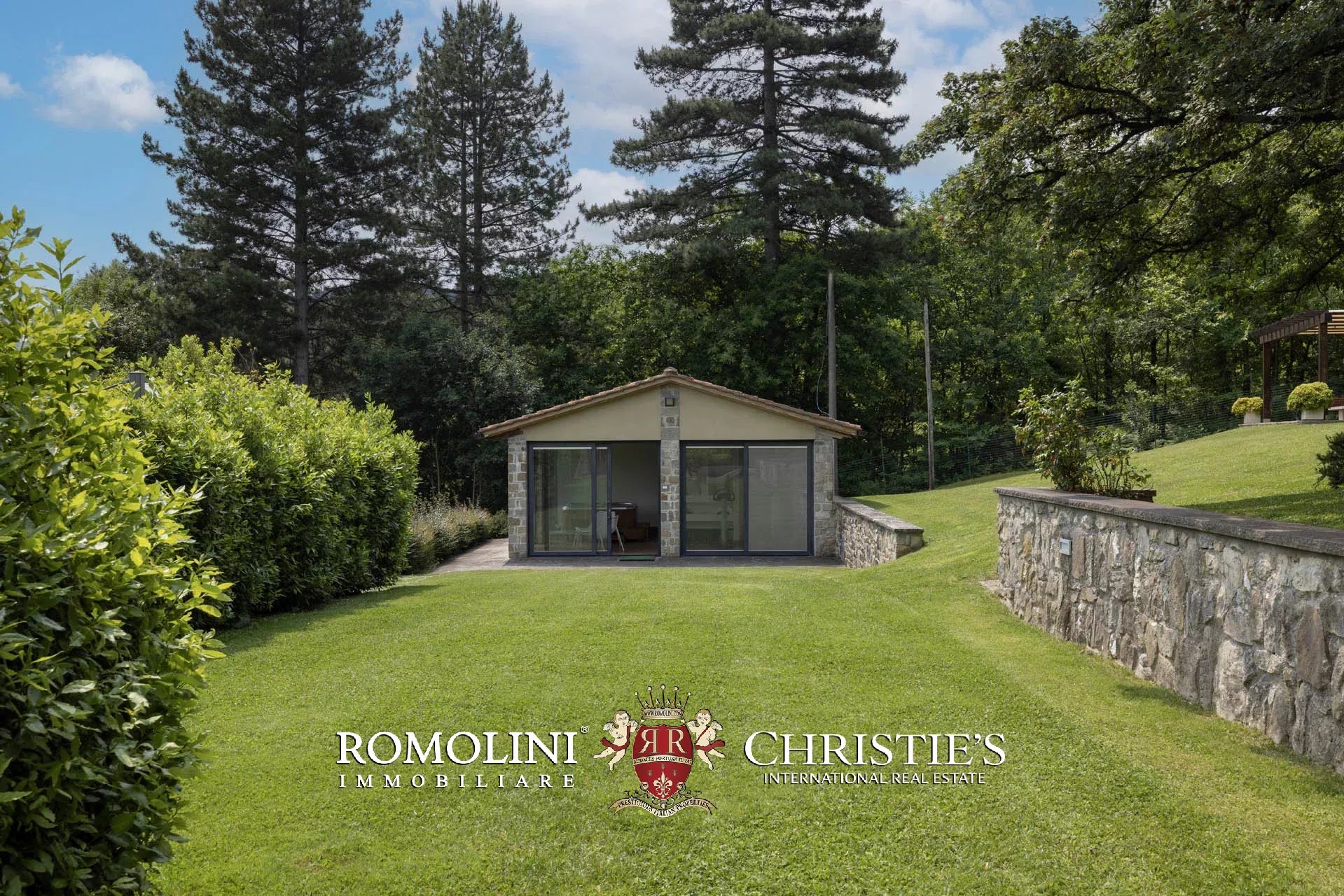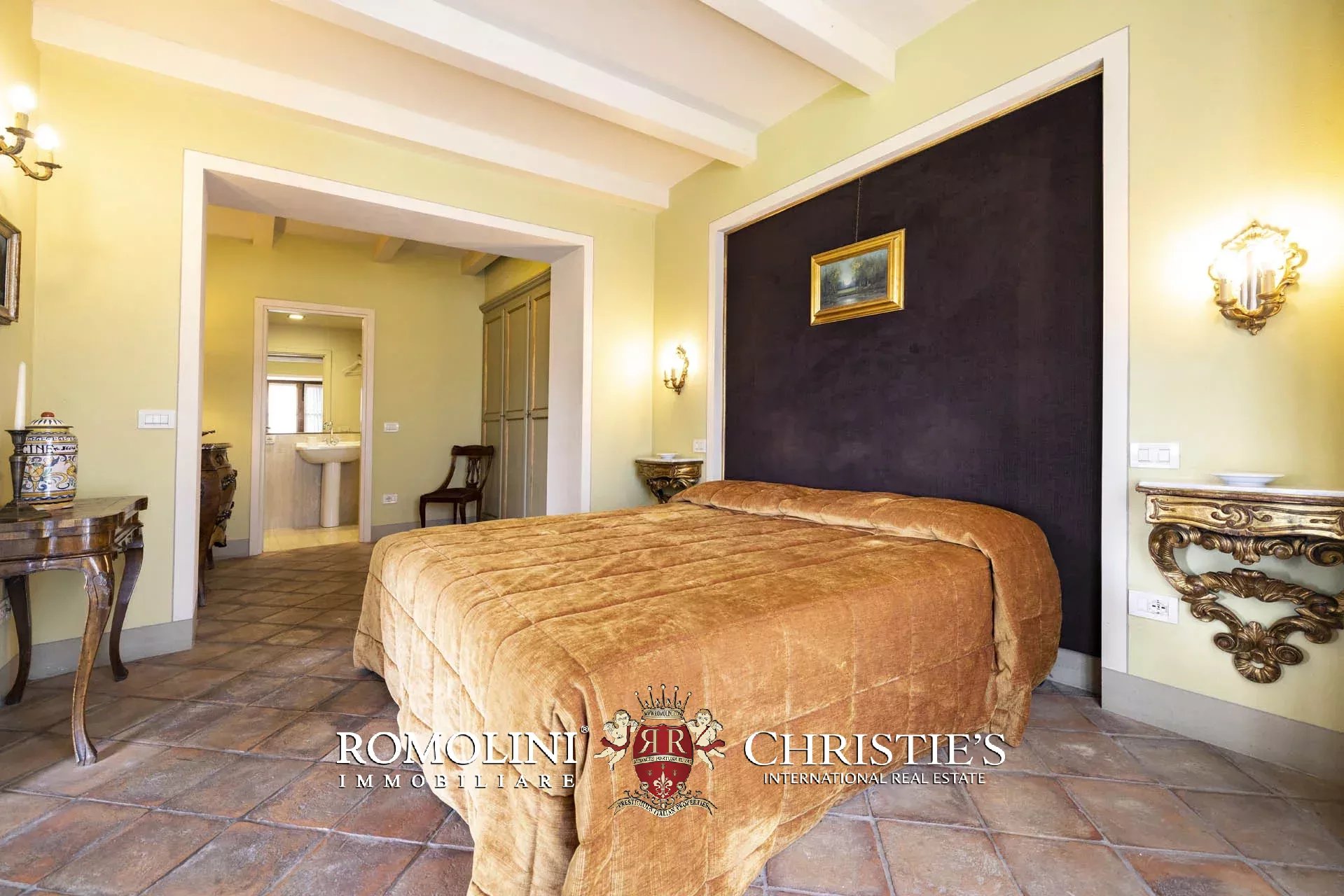 Attualmente il collegamento al piano inferiore della villa è realizzato attraverso una scala esterna accessibile dal soggiorno e dalla cucina, nel pianerottolo di accesso alle scale è presente un forno a legna perfettamente funzionante. Al piano inferiore sono presenti due camere con bagno en-suite e due spaziose suite con bagno. Tutte le camere hanno accesso indipendente al grande parco che degrada dolcemente verso valle.