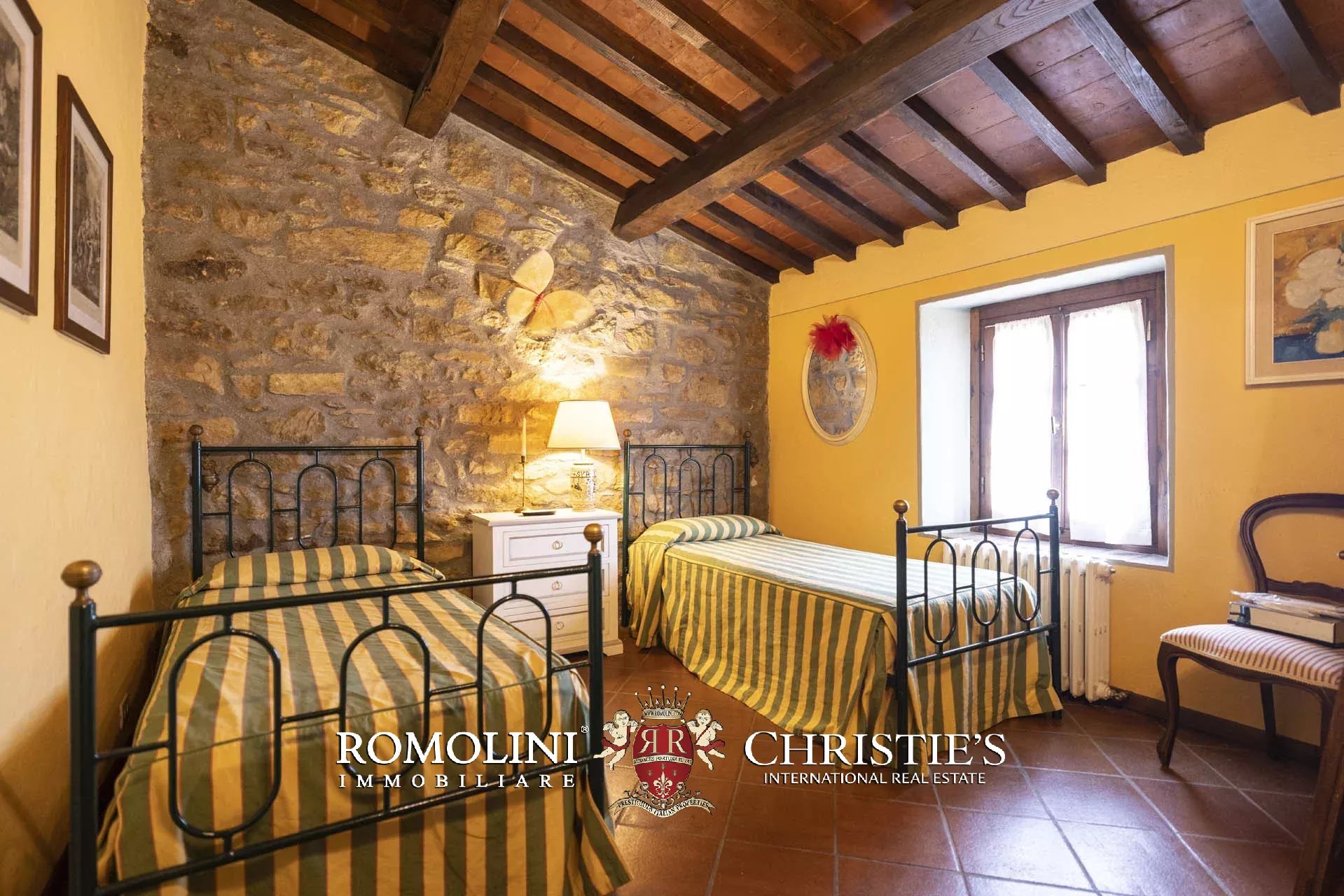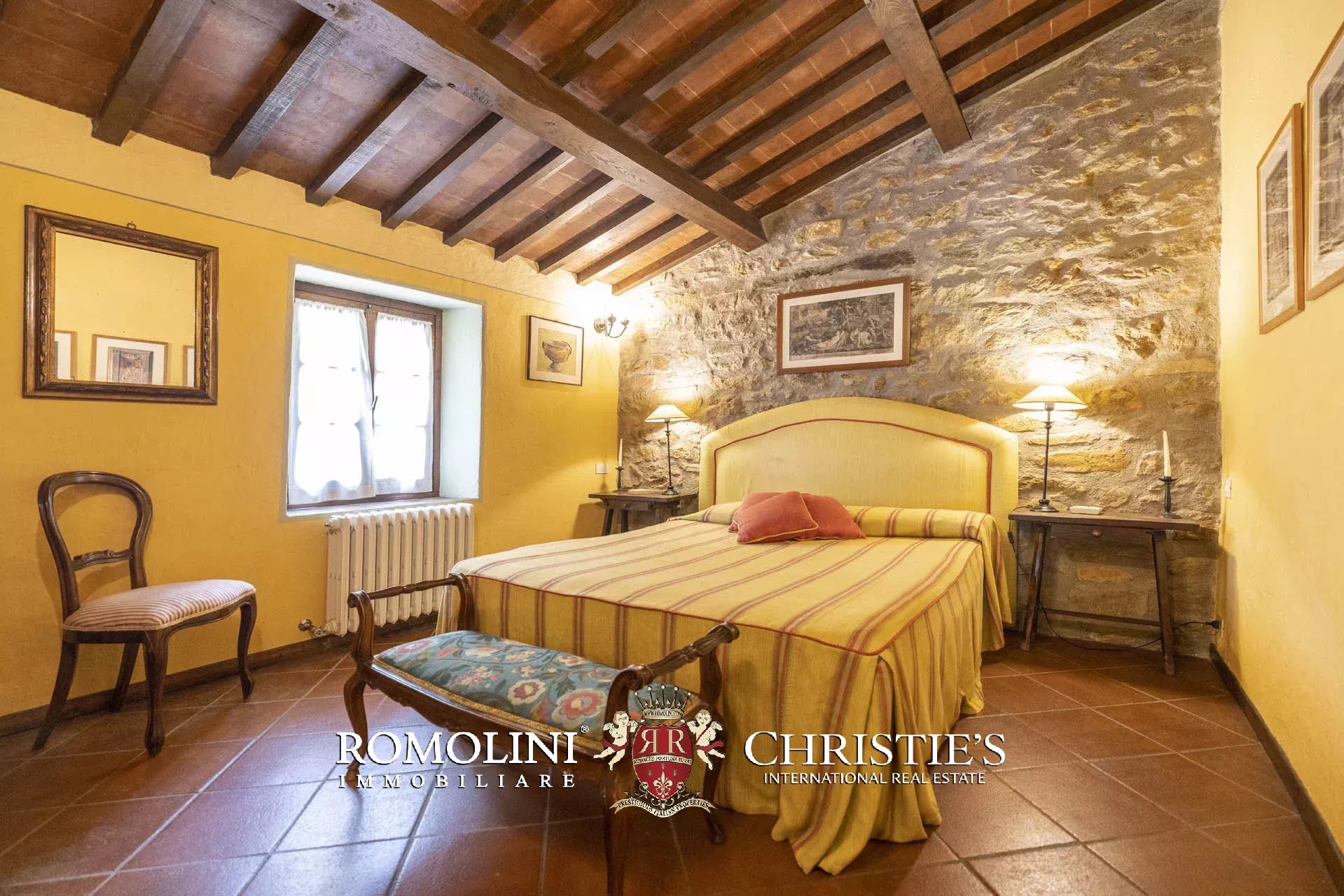 Il casale (330 m², 6 camere e 7 bagni) è disposto su due livelli. Dall’ingresso principale si accede a un ampio soggiorno dove un antico camino riscalda l’ambiente. Una grande loggia panoramica con le aperture tamponate con vetri rimovibili è il naturale completamento della zona giorno che include anche una cucina ben attrezzata. A questo piano sono presenti anche due camere con bagno en-suite ed un ulteriore bagno di servizio.