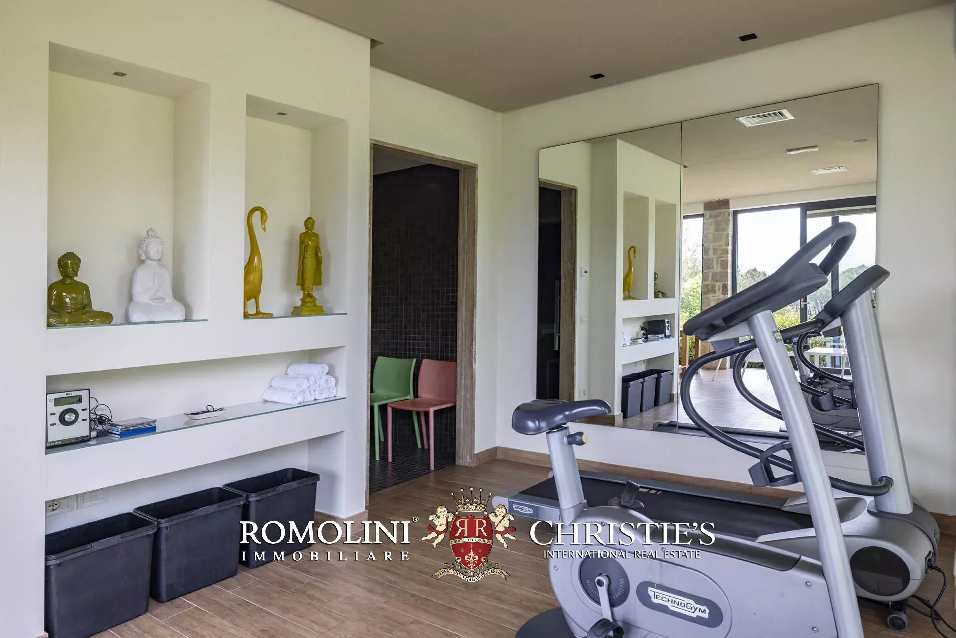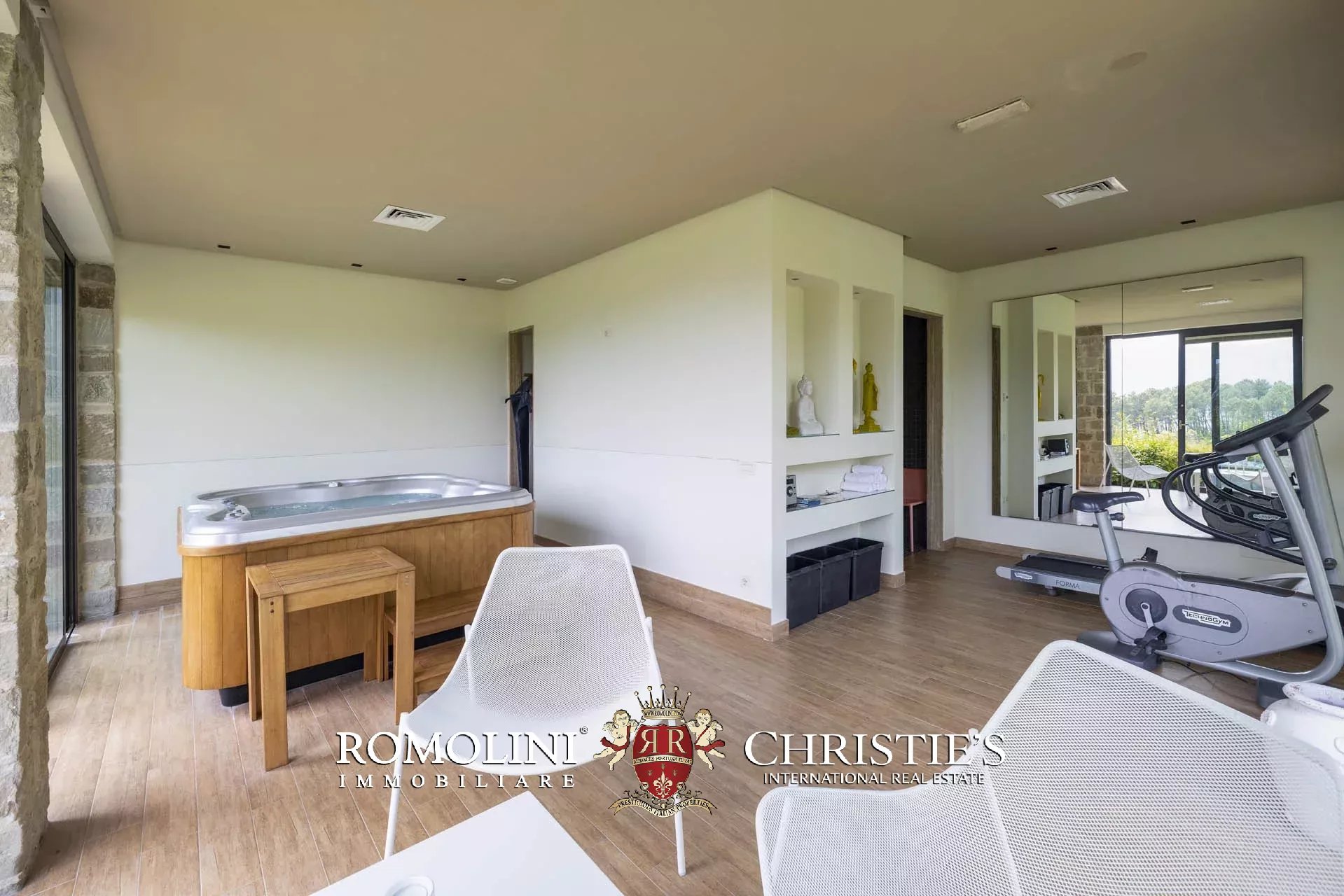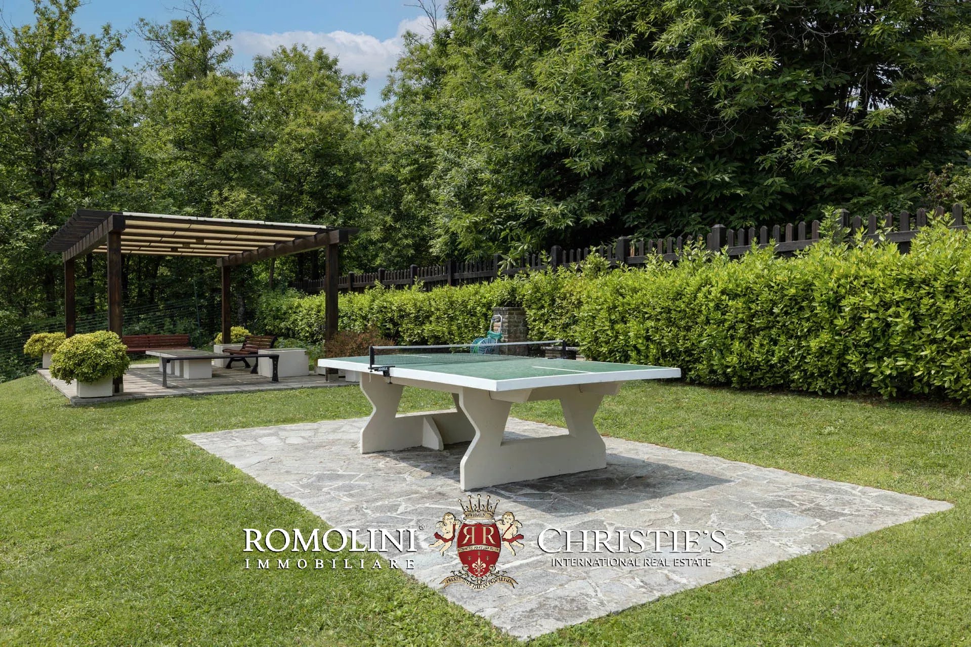 La proprietà include un parco di 11,800 m² dove, oltre alla villa, trovano collocazione una piscina 10 × 5 m riscaldata, una rimessa per gli attrezzi (36 m²) e un piccolo centro benessere (45 m², 1 bagno) attrezzato con vasca idromassaggio Jacuzzi, doccia emozionale, hammam con cromoterapia e strumenti Technogym. Una piccola porzione di bosco (1,7 ha) completa la proprietà sul lato nord.