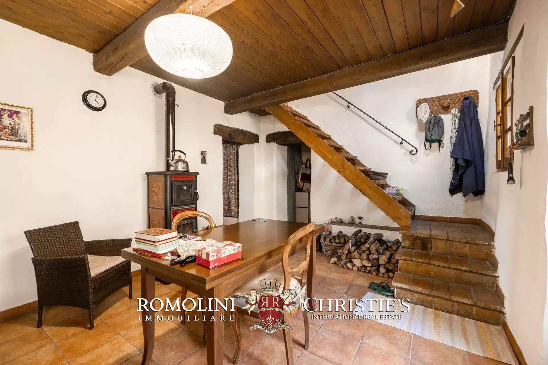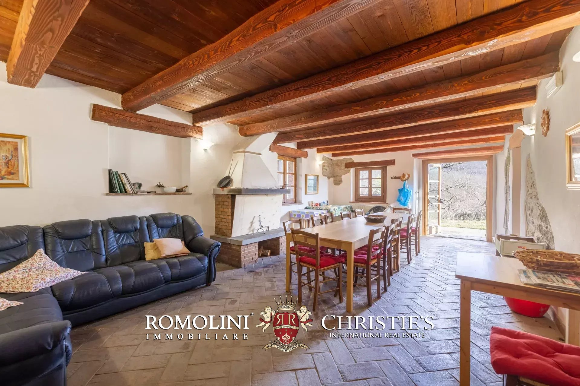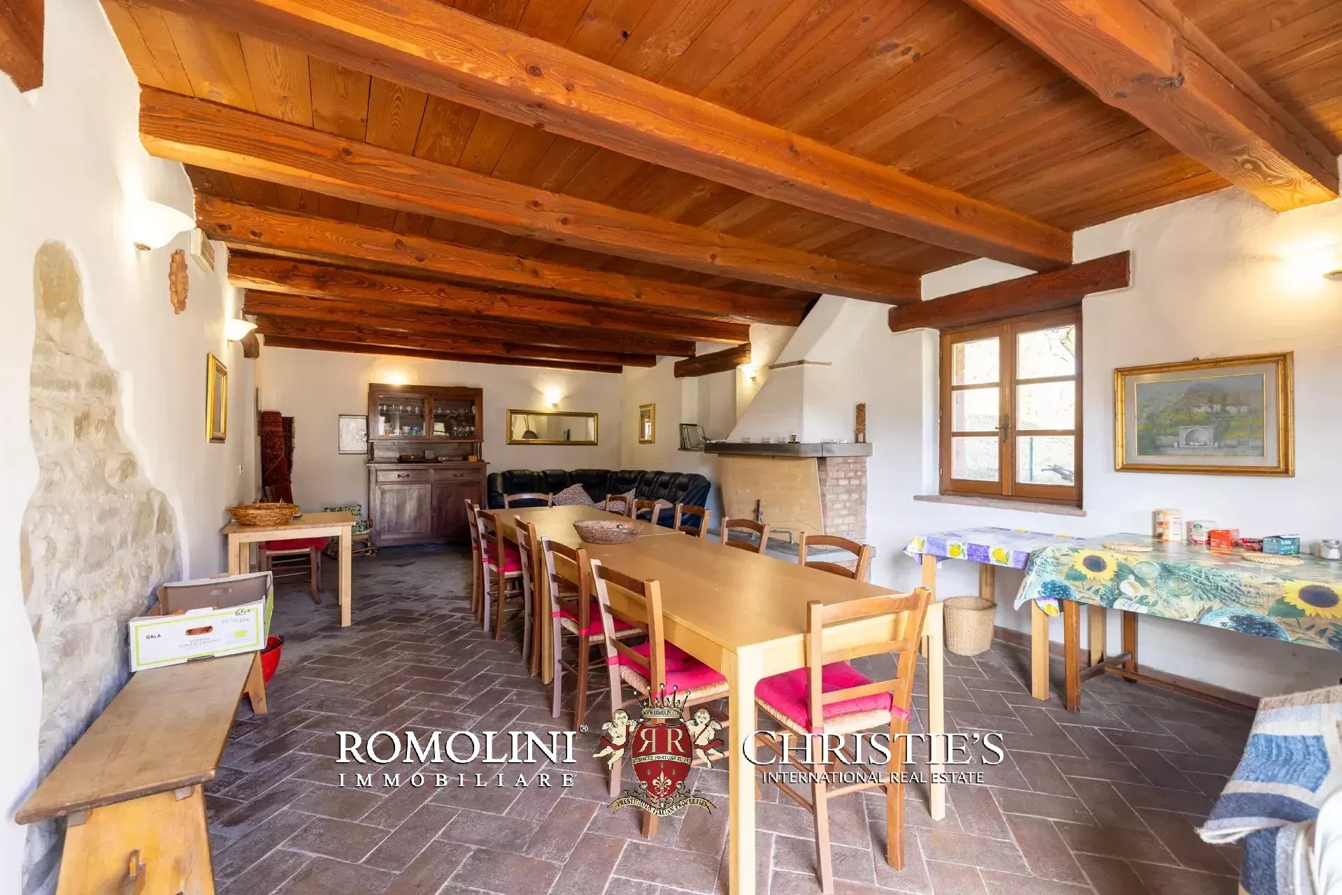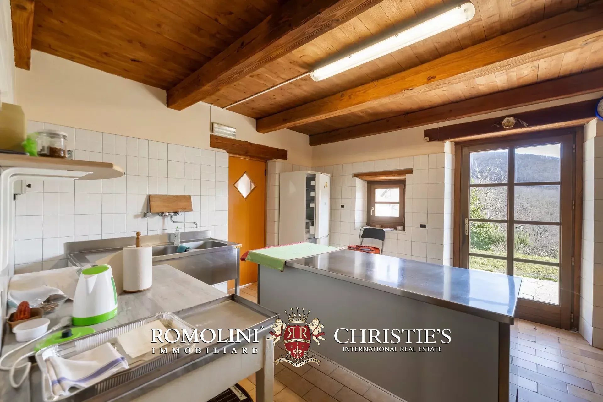 Il piano terra accoglie poi una spaziosa cucina industriale attrezzata, un grande forno, la dispensa e un’accogliente sala da pranzo con camino, perfetta per eventi e cene in compagnia. La proprietà è dotata di una centrale termica con caldaia a legna che garantisce efficienza energetica e sostenibilità. L’acqua è invece fornita da tre sorgenti naturali.