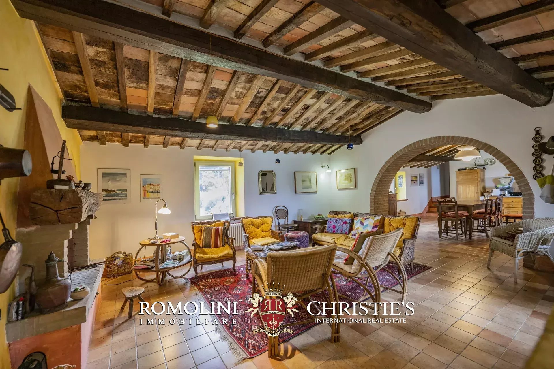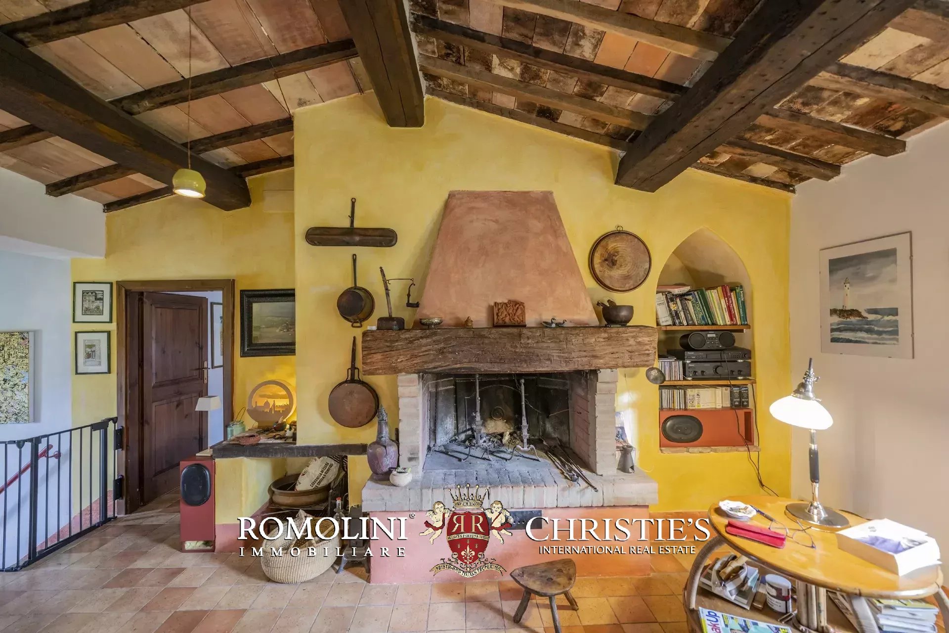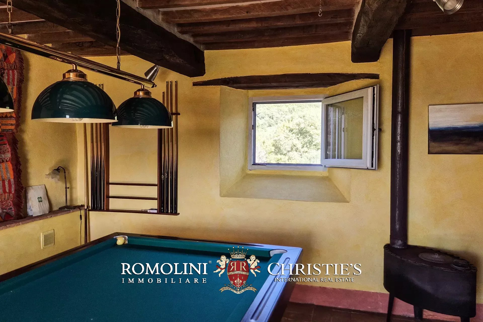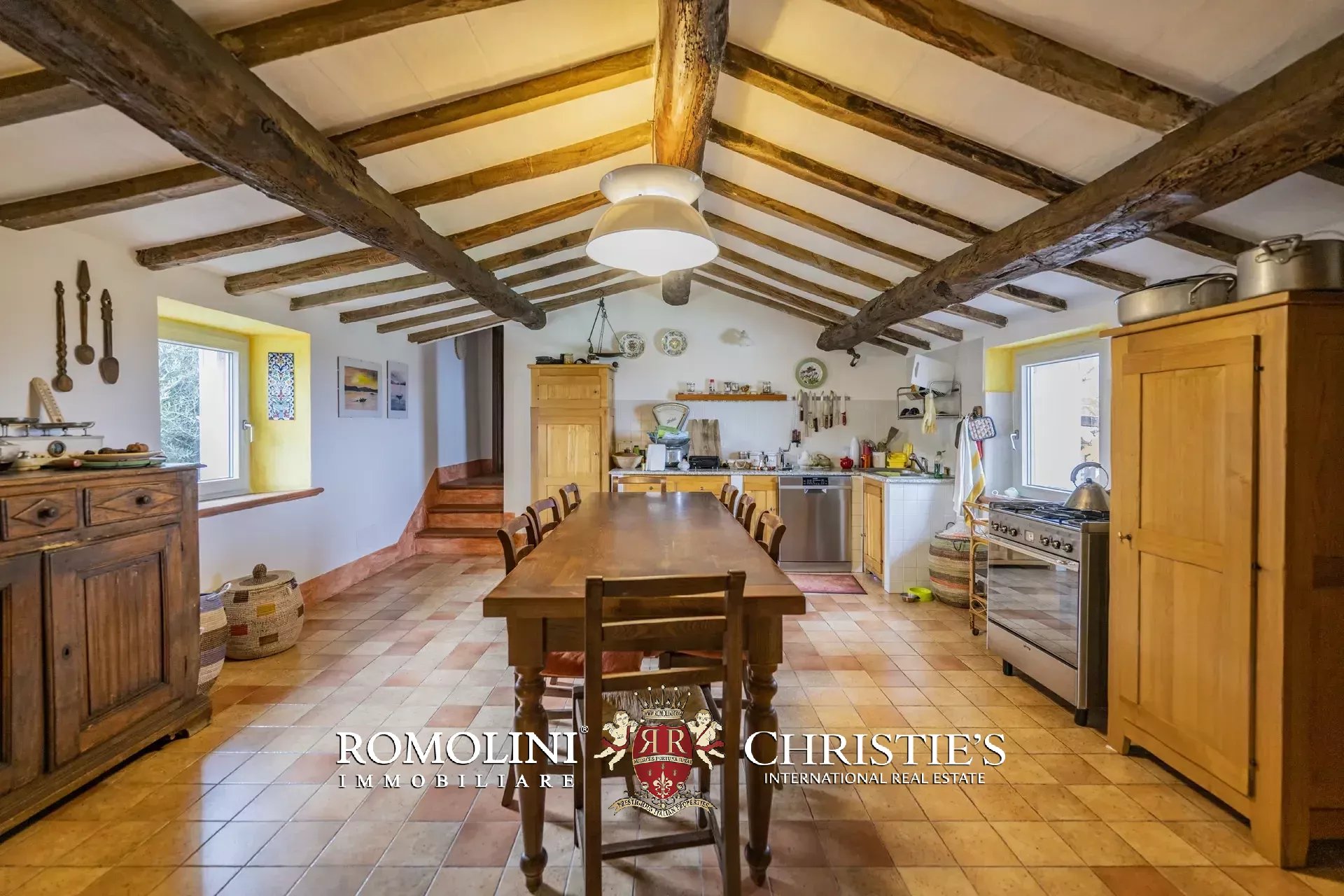 Al piano terra si trovano un grande soggiorno con biliardo e una camera servita da un bagno. All’estremità sud dell’edificio, con accesso indipendente, si trova un’ampia cantina/magazzino. Salendo al primo piano (accessibile anche direttamente dall’esterno tramite una caratteristica scala con forno antico) troviamo invece la sala da pranzo con annessa cucina, due camere e un bagno.