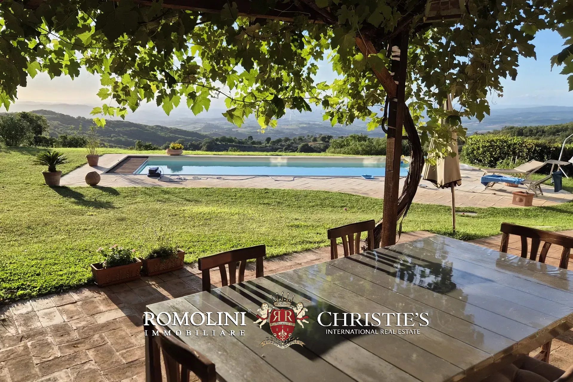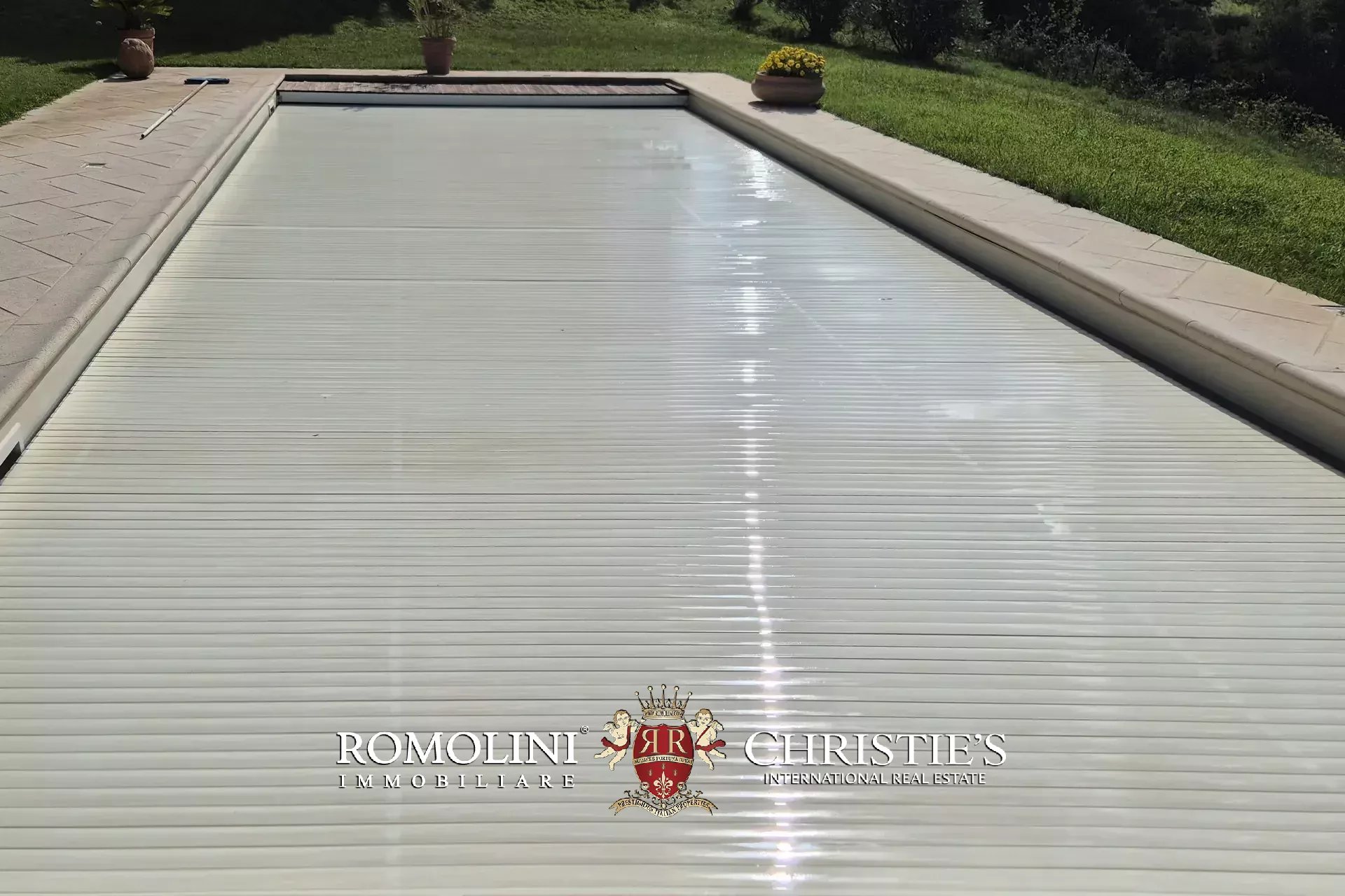 A breve distanza dalla casa si trova la piscina 12,5 × 5 m, sterilizzata con sale marino e riscaldata tramite pompa di calore indipendente. La vasca è dotata di impianto d’illuminazione subacqueo e sistema di copertura automatizzato e viene rabboccata usando l’acqua del pozzo. Il solarium ospita, oltre a letti prendisole, una doccia solare a servizio della piscina.