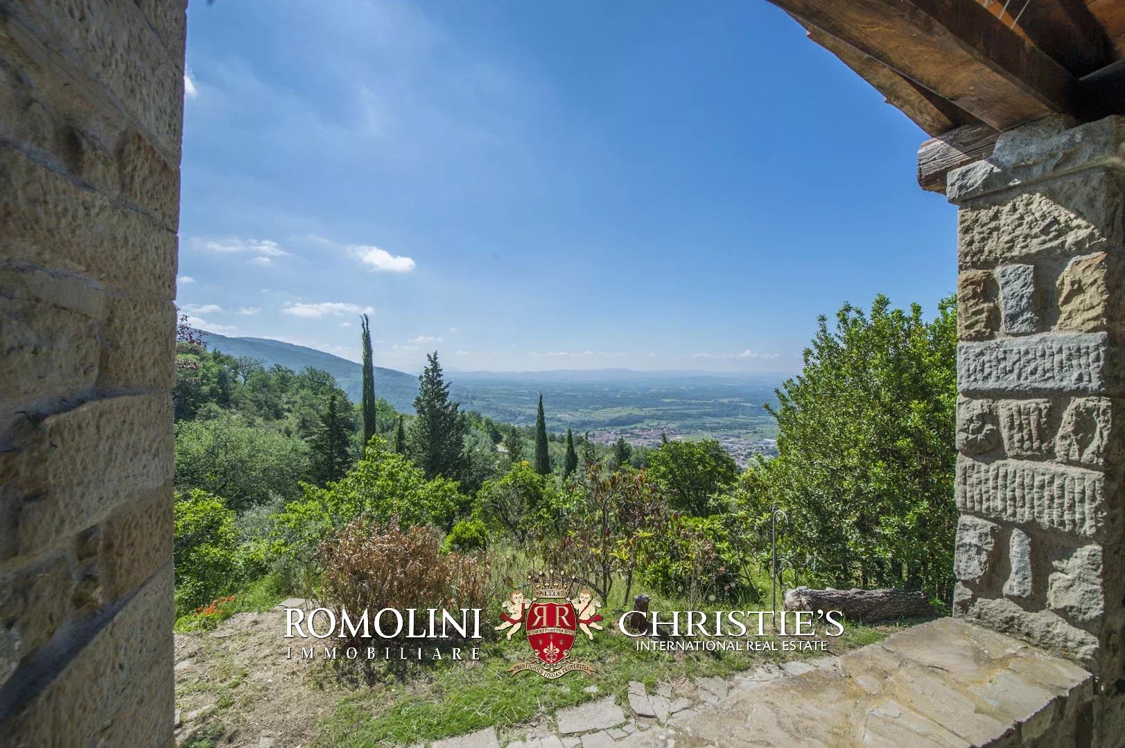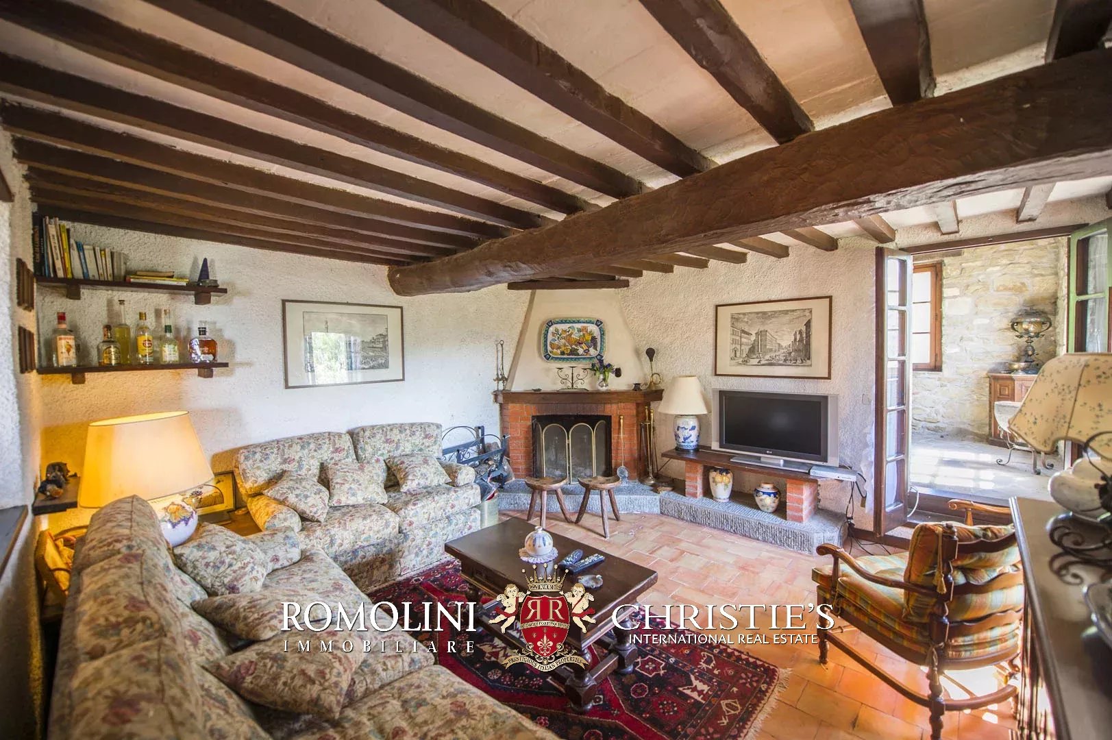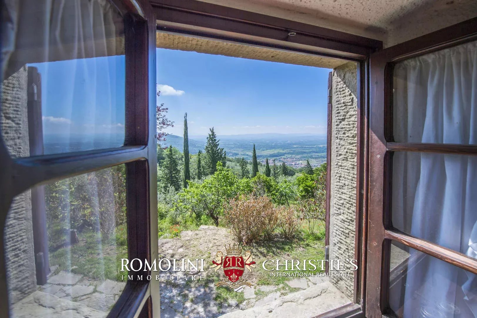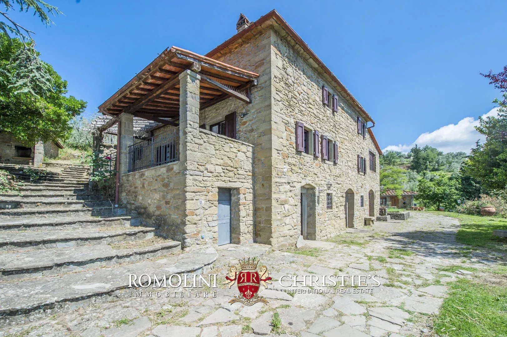 Sulle colline del Valdarno, in posizione panoramica, casale in pietra con 4,5 ettari di terreno e oliveta. L'edificio (300 m²) è stato ristrutturato negli anni Ottanta ed è strutturato su due piani: