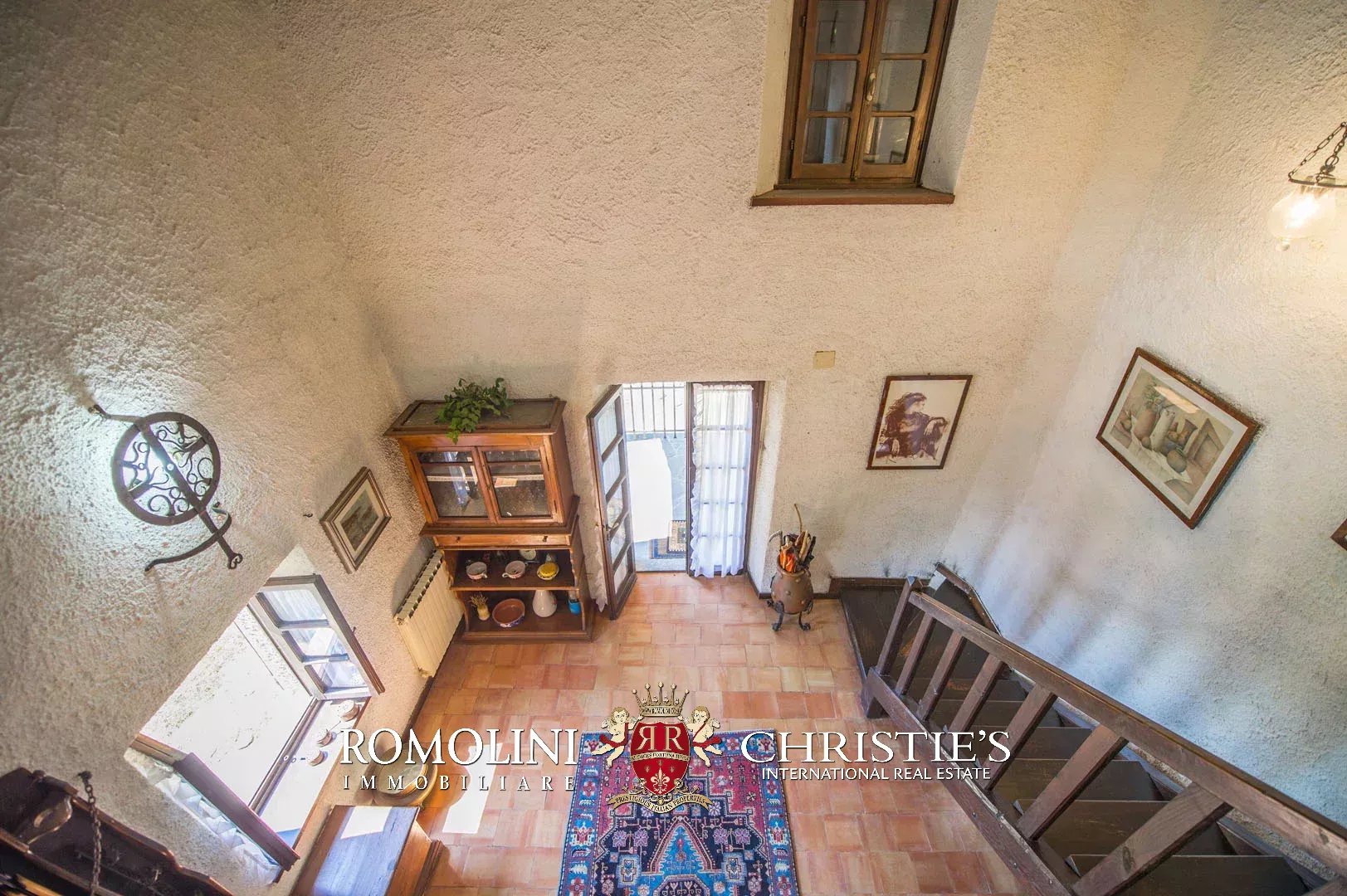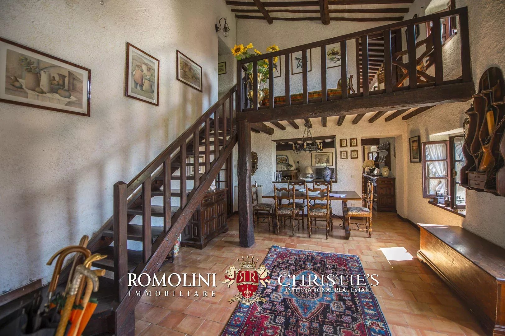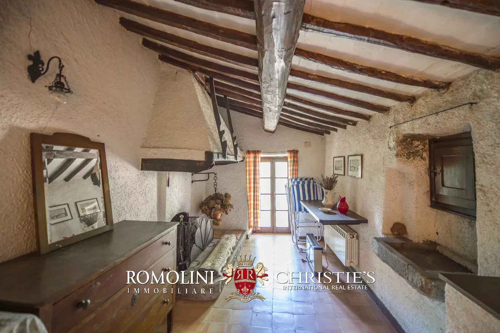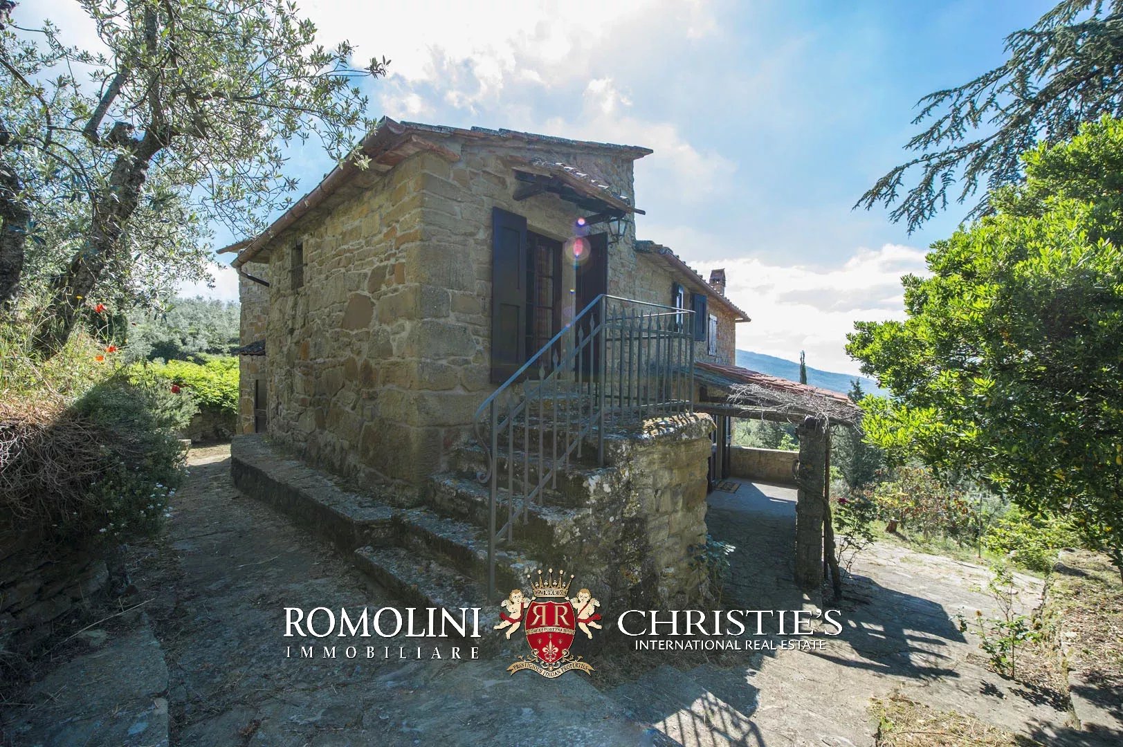 Sulle colline del Valdarno, in posizione panoramica, casale in pietra con 4,5 ettari di terreno e oliveta. L'edificio (300 m²) è stato ristrutturato negli anni Ottanta ed è strutturato su due piani: