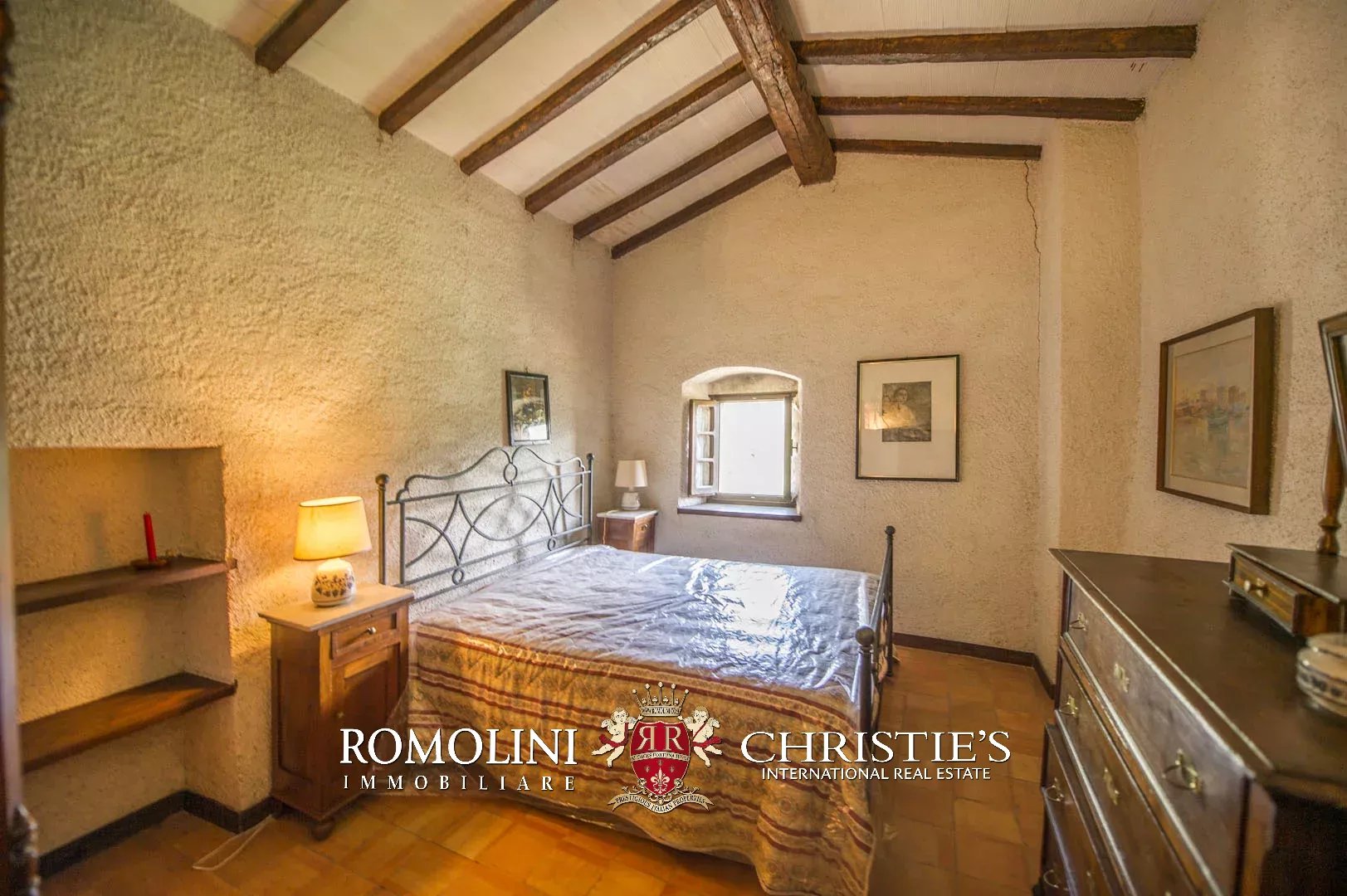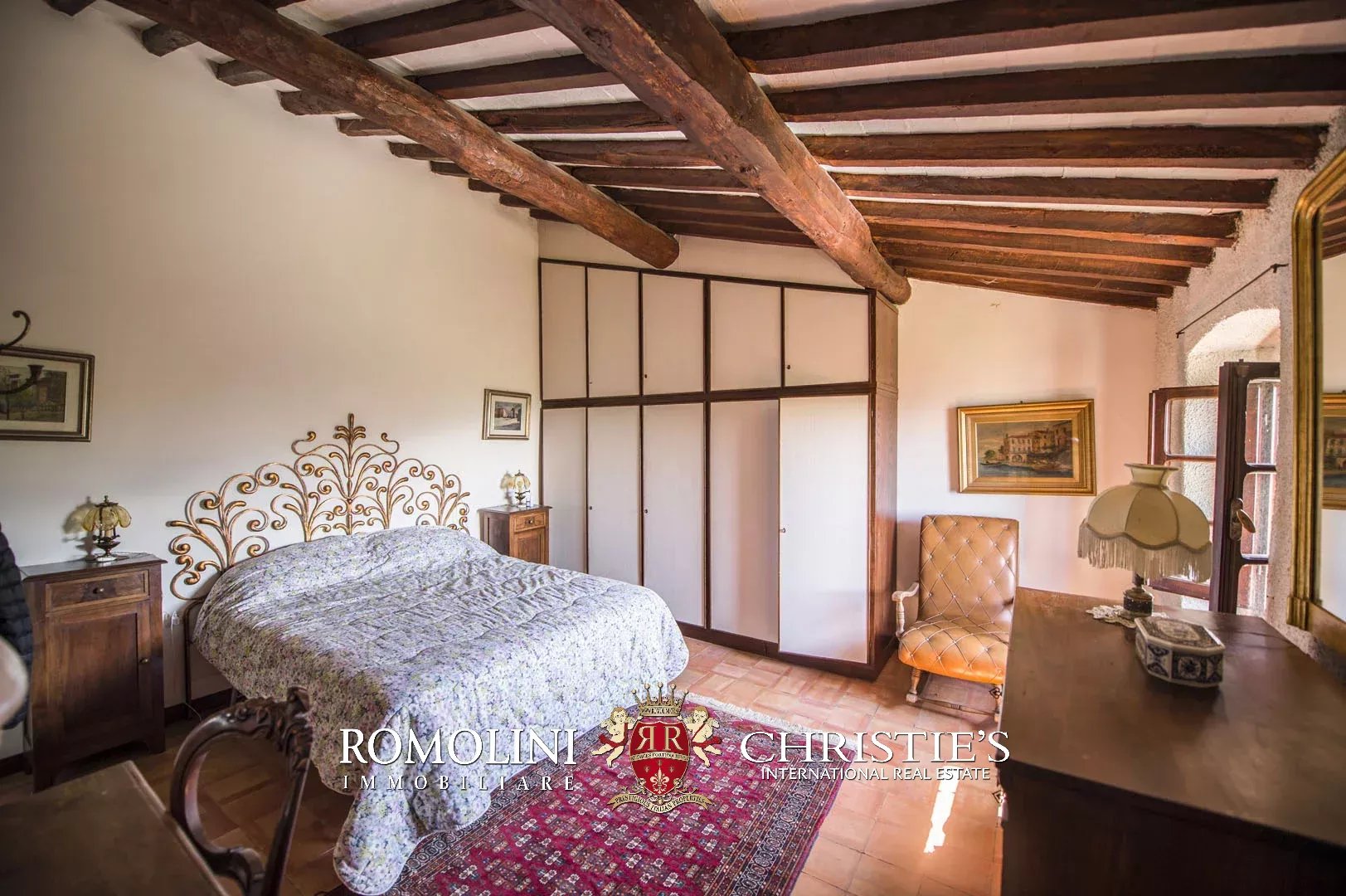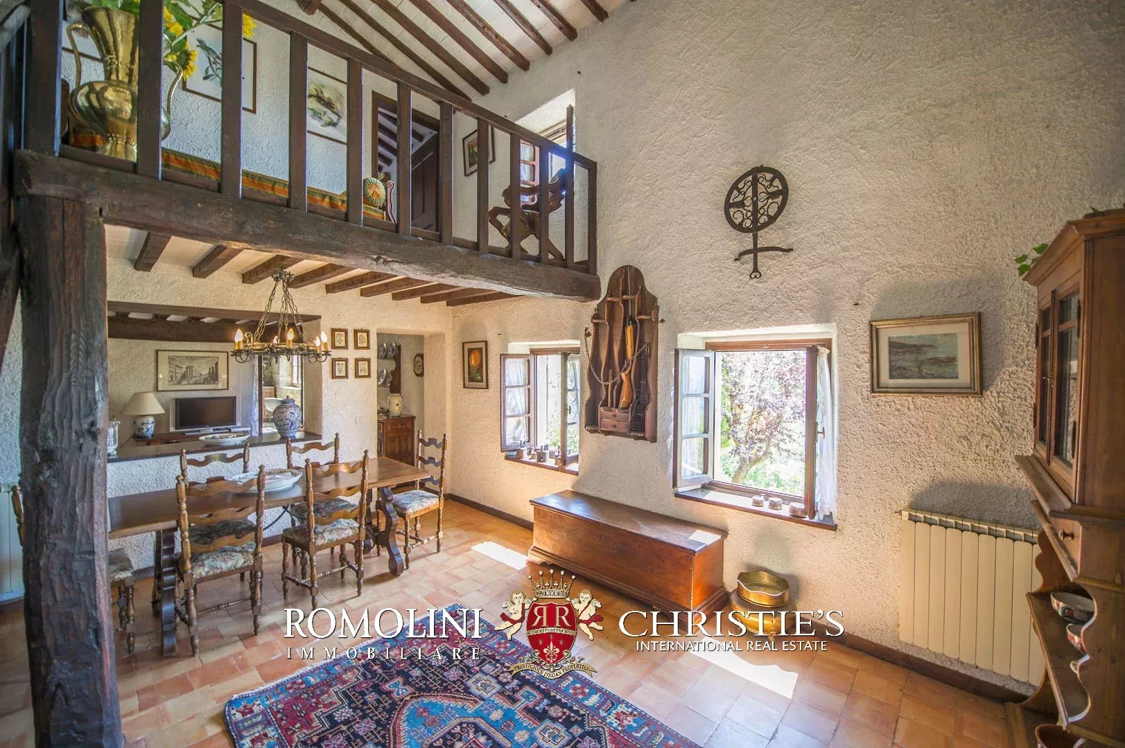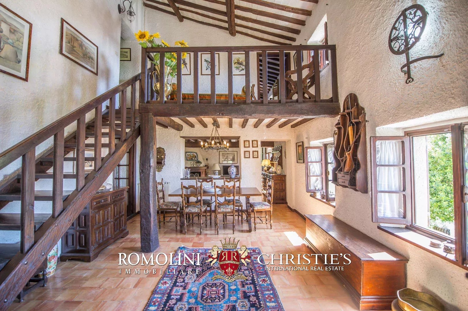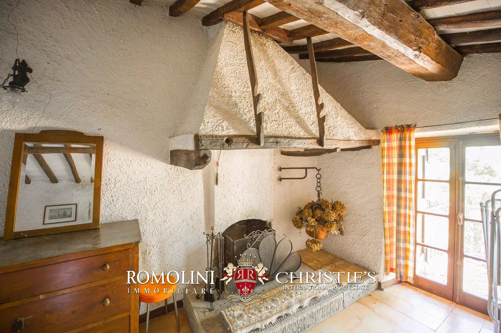 Sulle colline del Valdarno, in posizione panoramica, casale in pietra con 4,5 ettari di terreno e oliveta. L'edificio (300 m²) è stato ristrutturato negli anni Ottanta ed è strutturato su due piani: