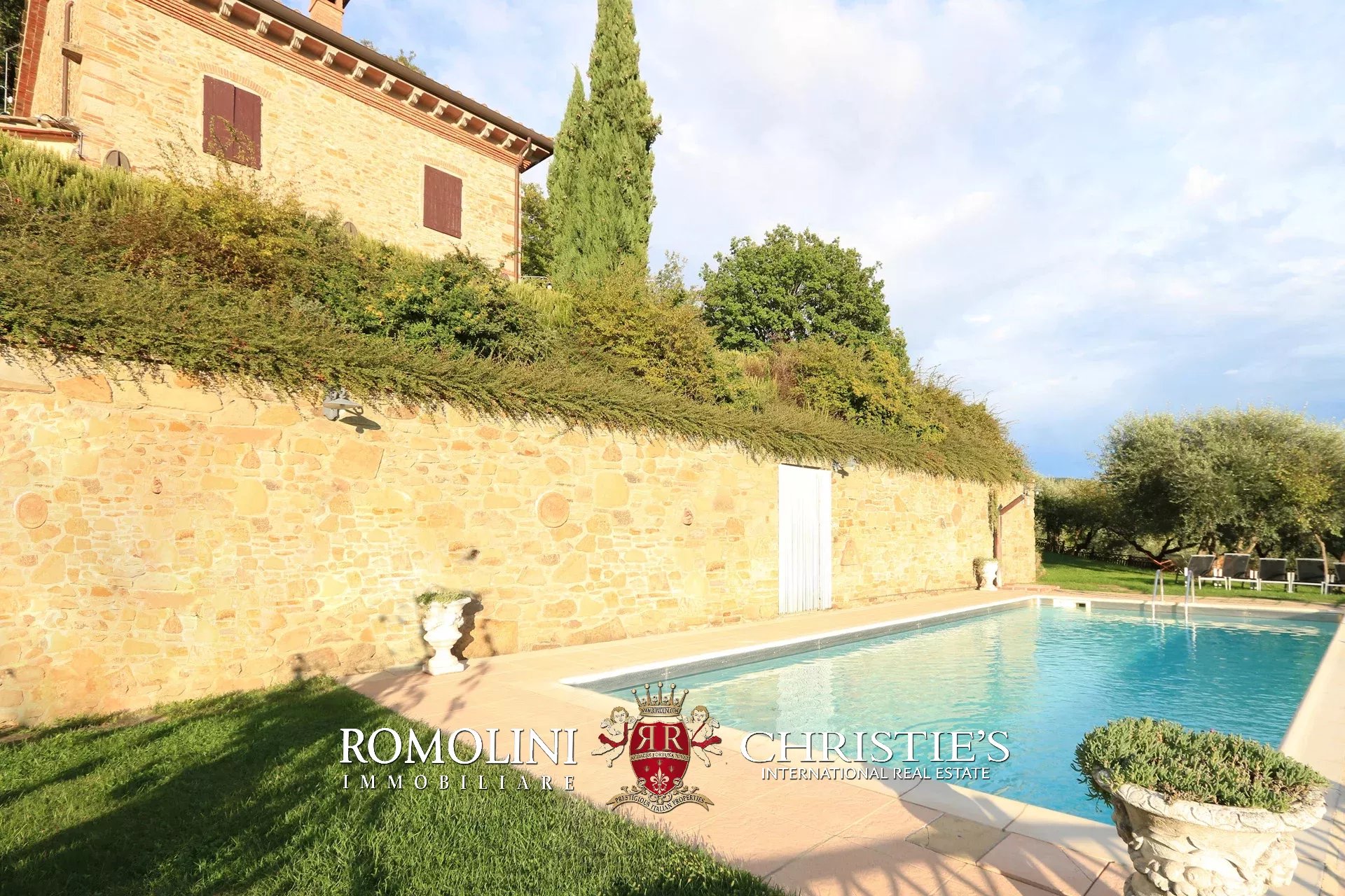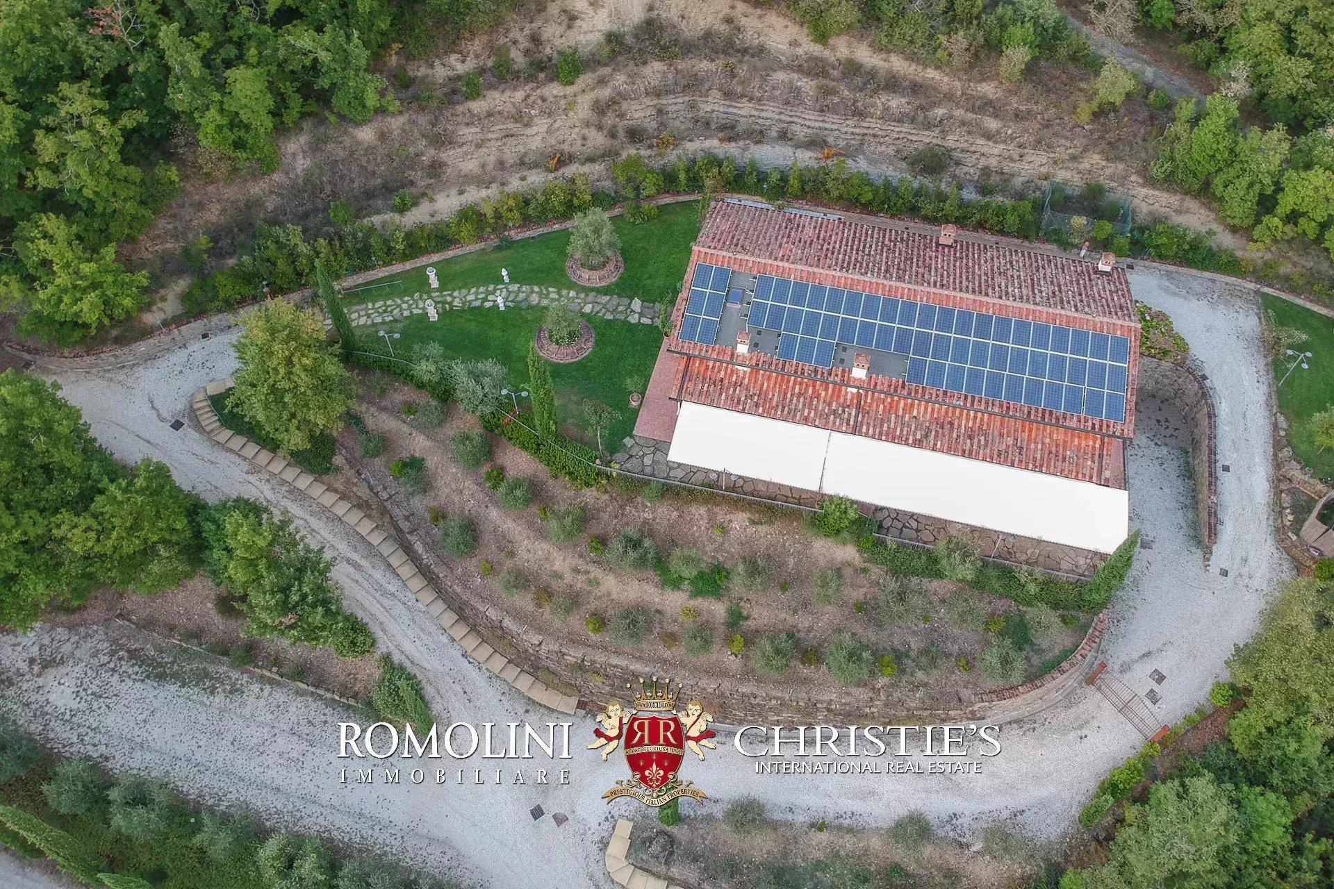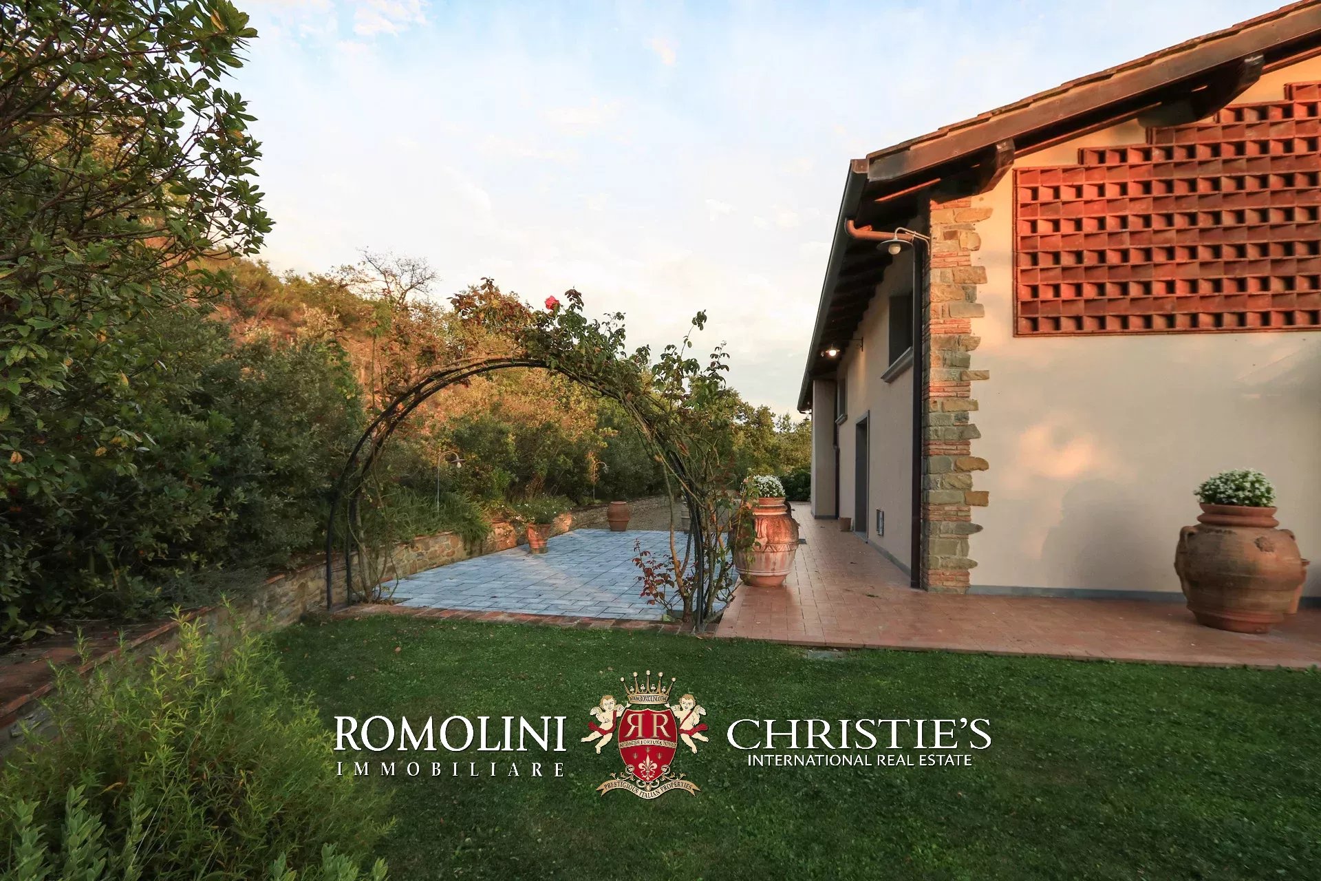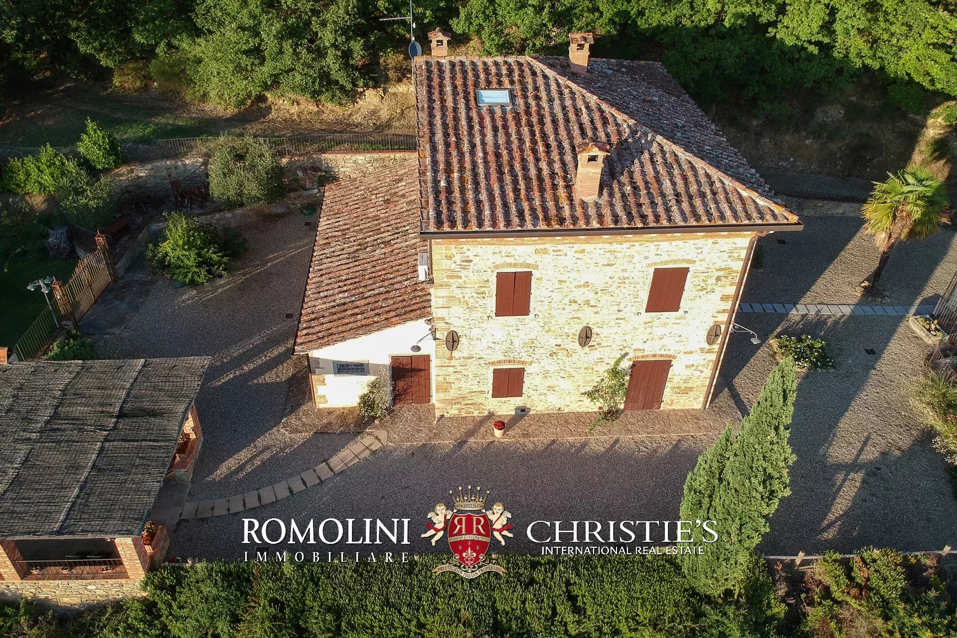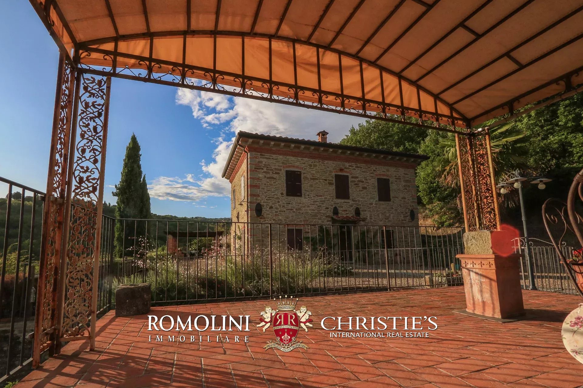 Il casale è circondato da 4.700 m² di giardino ben curato, interamente recintato e piantumato con siepi e fiori ornamentali. Sulla terrazza inferiore, proprio sotto al casale, si trova la piscina panoramica 11 × 5 m che gode di una vista splendida sulle colline circostanti. Adiacente alla location per eventi è stato poi realizzato un comodo parcheggio privato (circa 2.500 m²) in grado di accogliere fino a cinquanta veicoli.