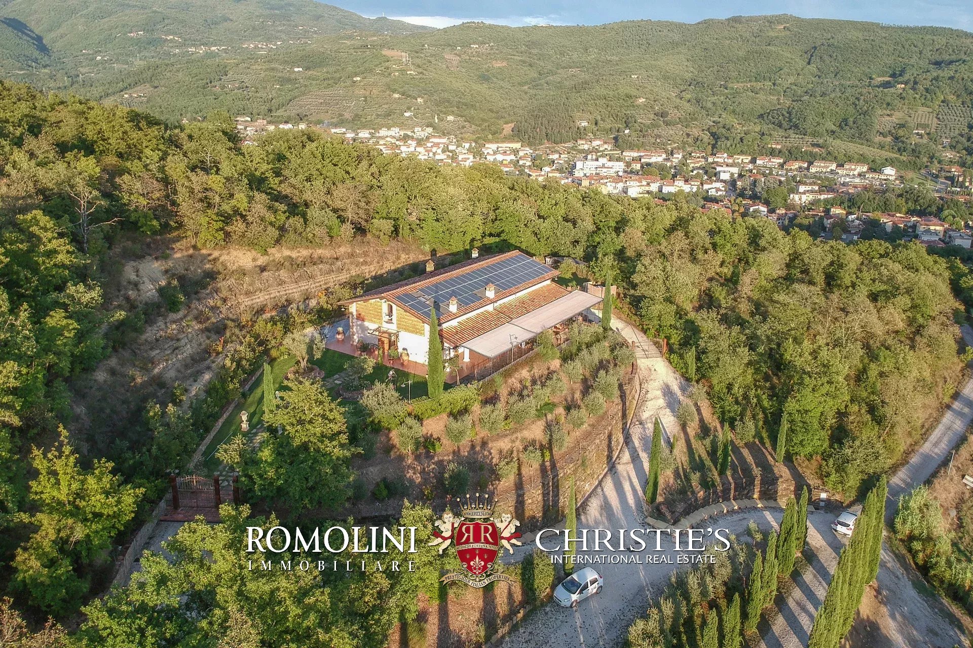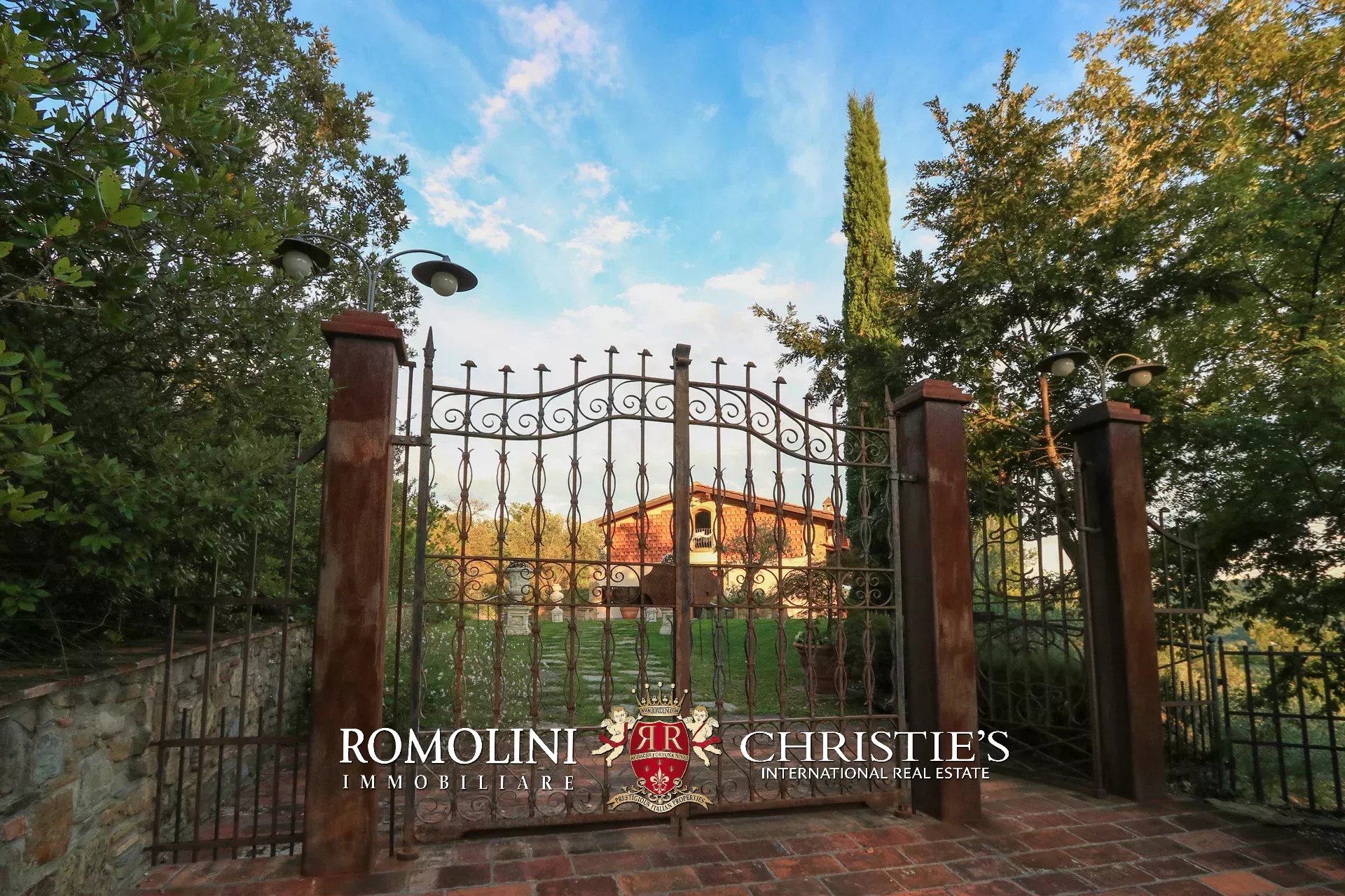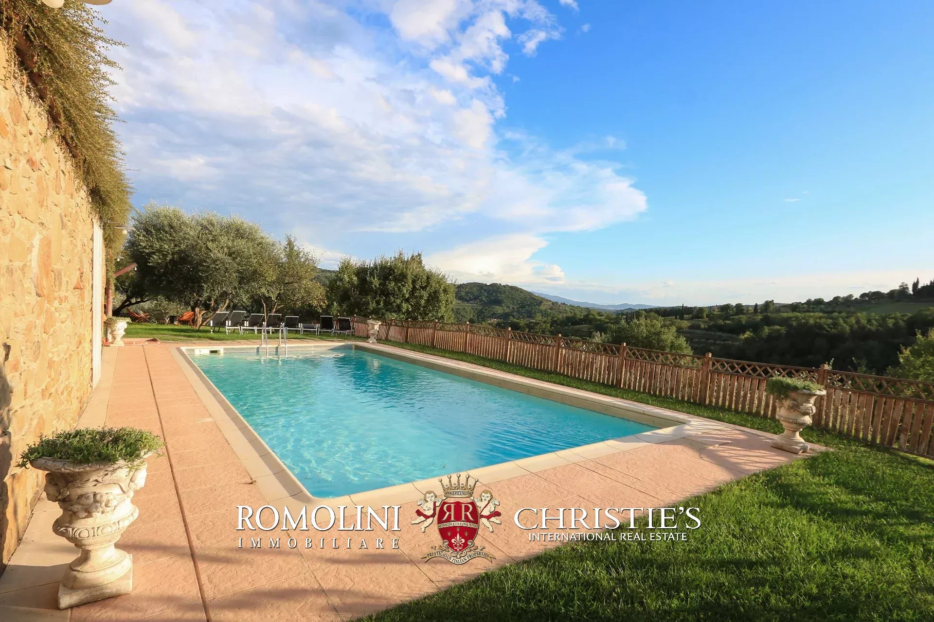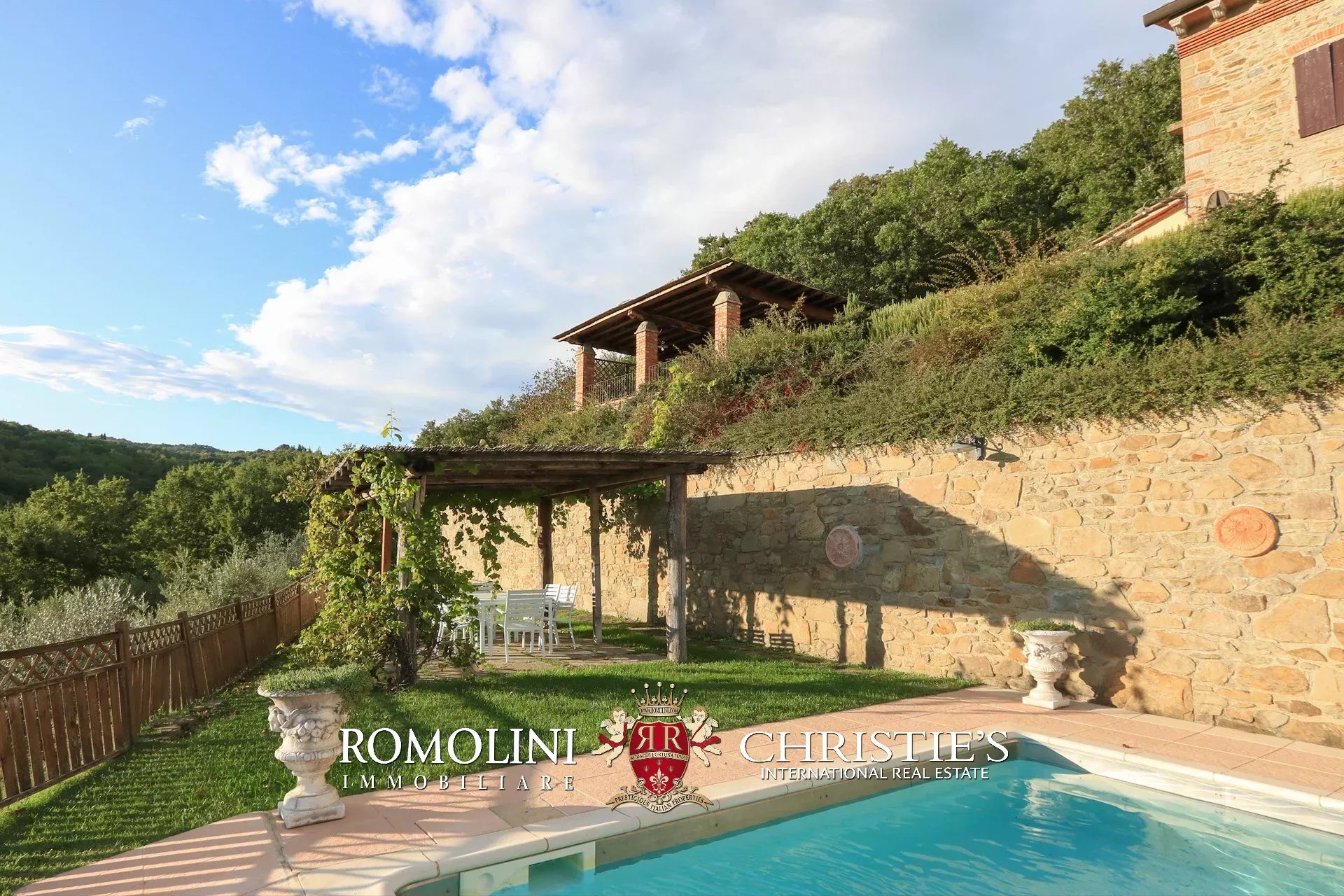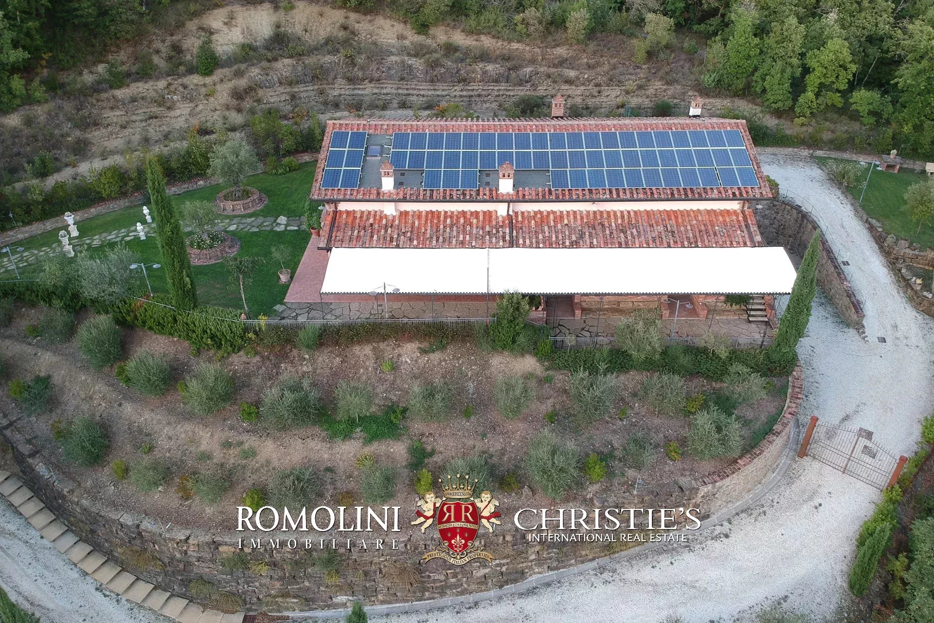 Il casale è circondato da 4.700 m² di giardino ben curato, interamente recintato e piantumato con siepi e fiori ornamentali. Sulla terrazza inferiore, proprio sotto al casale, si trova la piscina panoramica 11 × 5 m che gode di una vista splendida sulle colline circostanti. Adiacente alla location per eventi è stato poi realizzato un comodo parcheggio privato (circa 2.500 m²) in grado di accogliere fino a cinquanta veicoli.