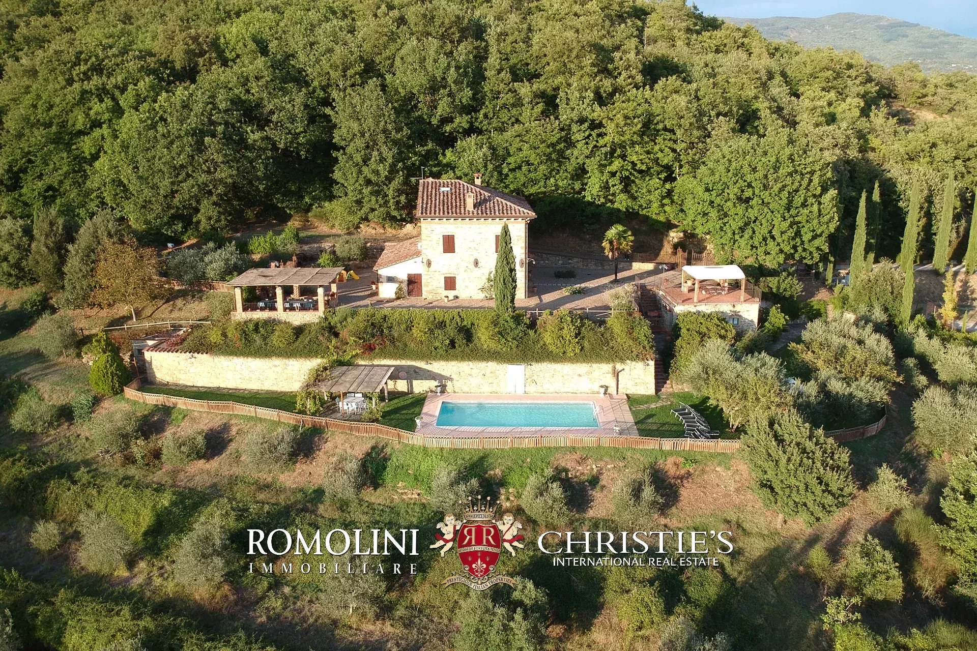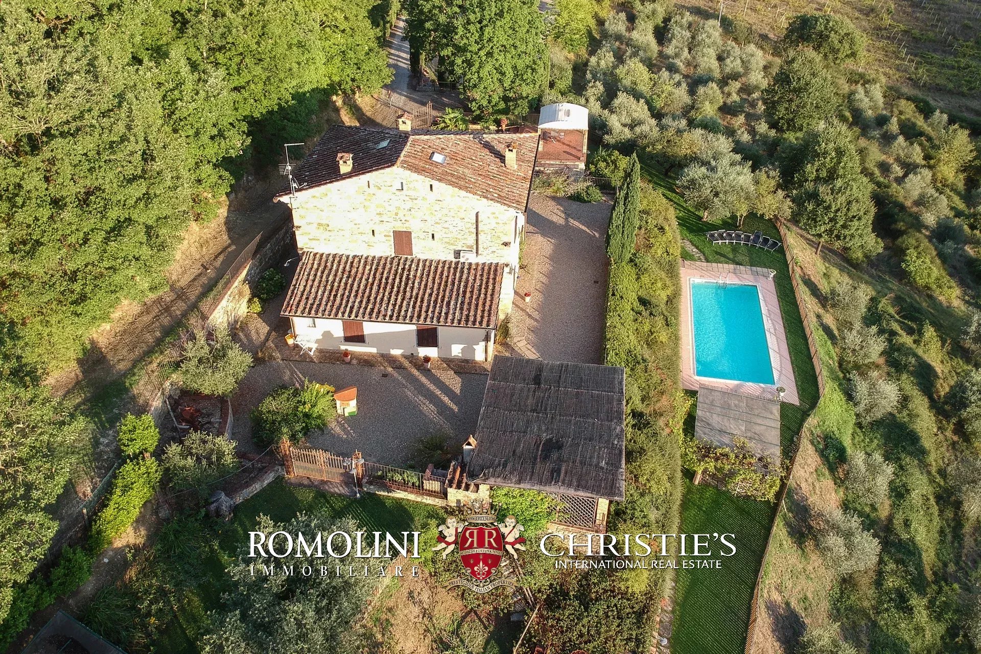 Completano la proprietà un piccolo oliveto (1,8 ha), posto sul pendio sotto alla piscina e terrazzato così da sfruttare al meglio lo spazio disponibile, e due piccole porzioni di bosco (1,0 ha) che assicurano privacy e mettono il casale al riparo da occhi indiscreti.