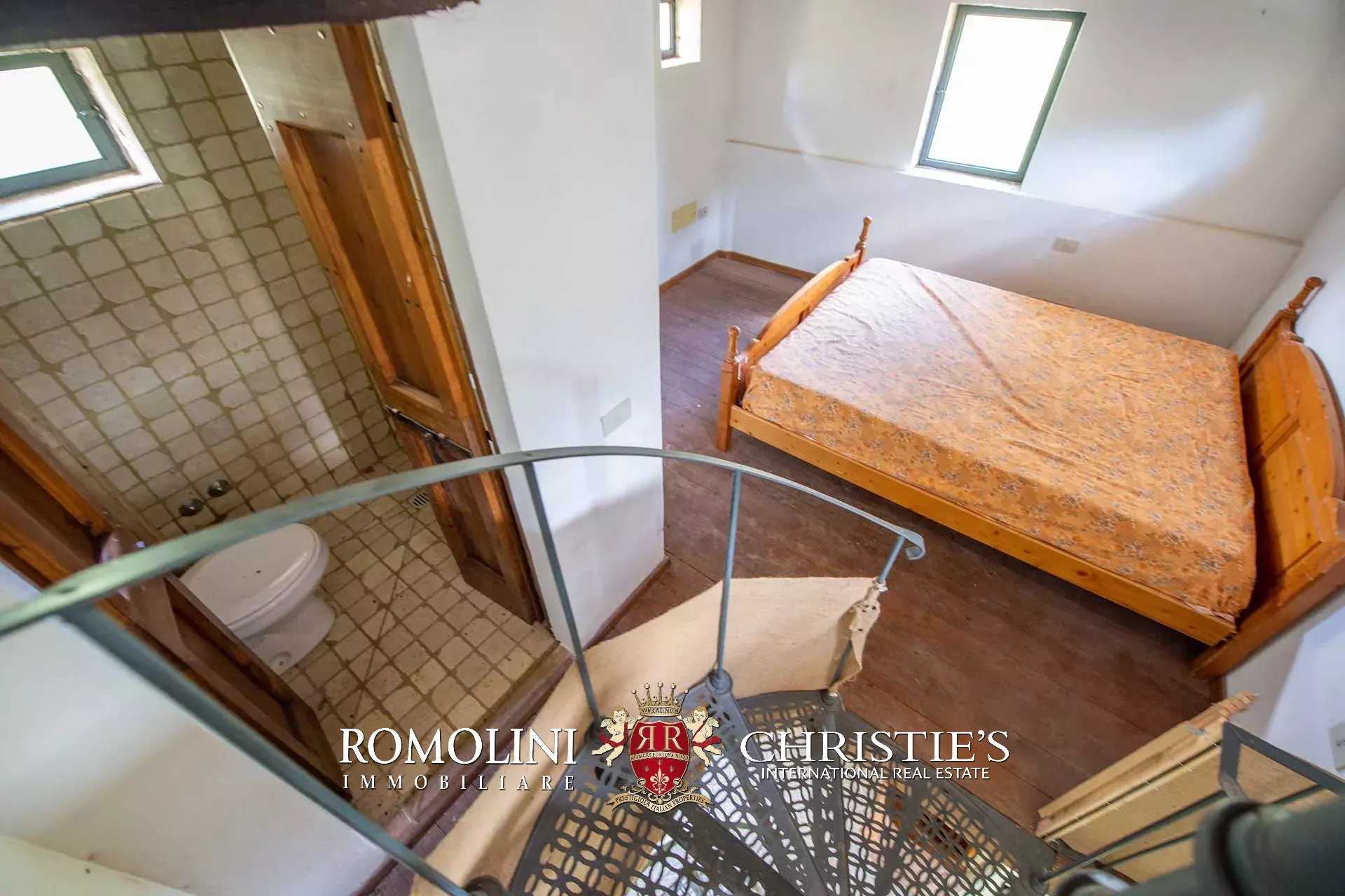 Il casale principale (155 m², 4 camere e 3 bagni) si snoda su tre piani ed è diviso attualmente in due appartamenti (uno per piano) più un magazzino con bagno al livello inferiore.