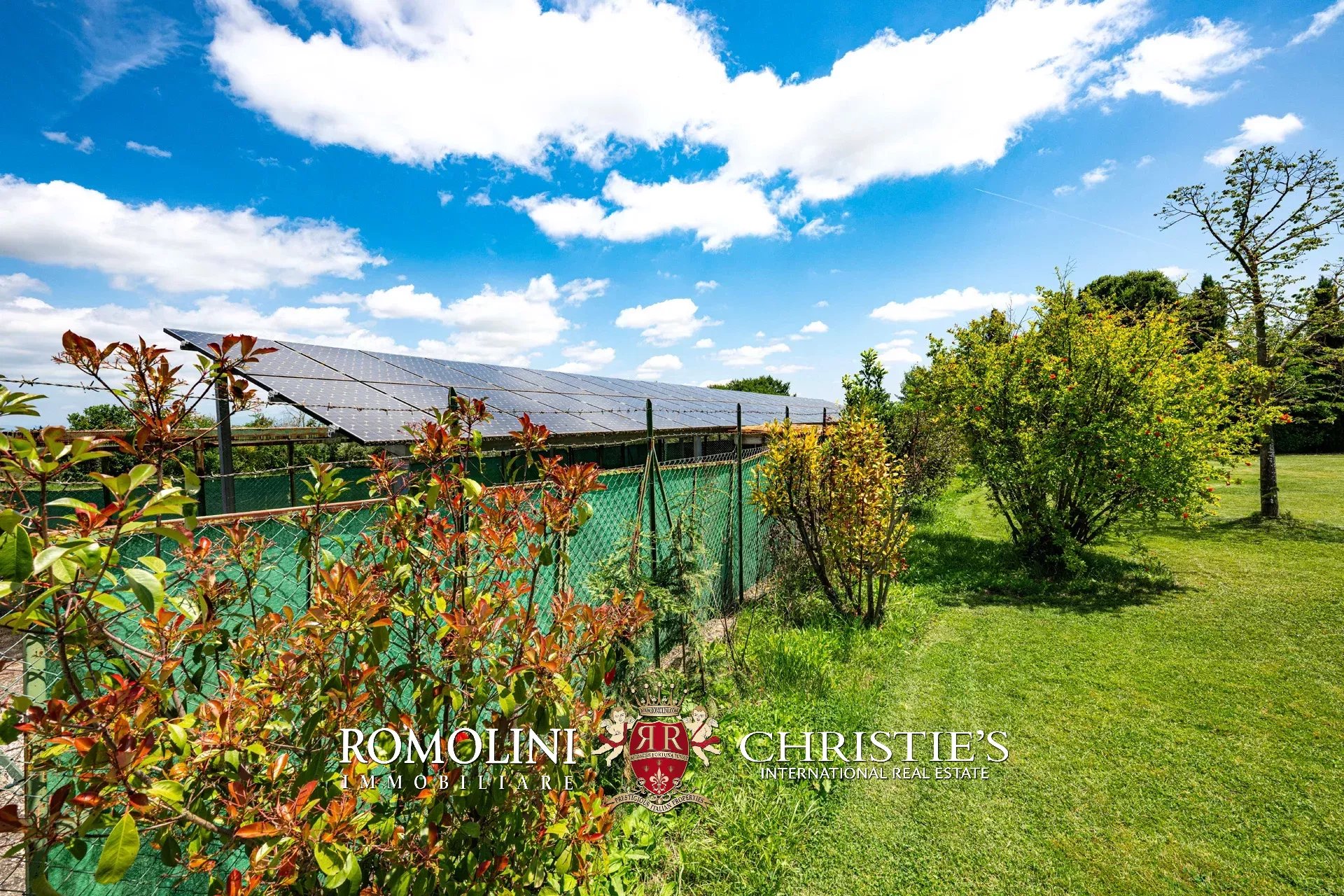 La villa è circondata da 7.660 m² di giardino, interamente recintato e chiuso da cancello, sul quale è stata realizzata una piscina 14 × 7 m, ben posizionata nel parco e circondata da un solarium sui quattro lati. Appena fuori dalla parte recintata è presente invece una pensilina (65 m²) che serve da supporto per l’impianto fotovoltaico e come riparo per alcune auto.
